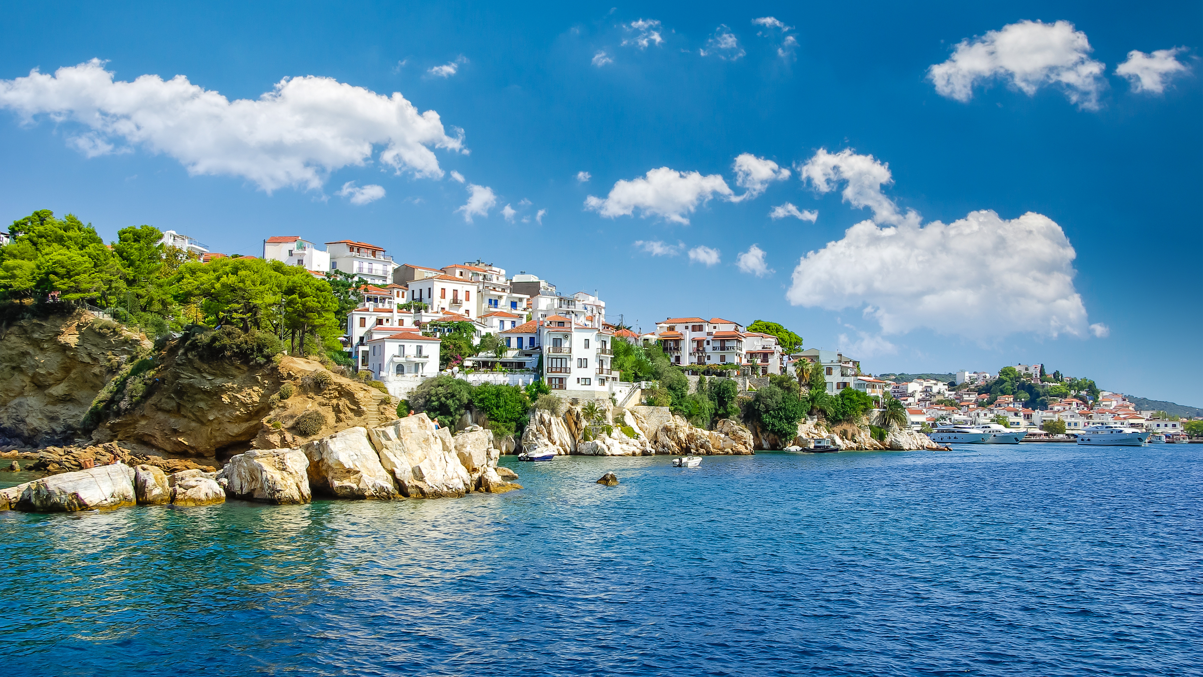 The picturesque main town of Skiathos with its whitewashed houses overlooks the Castle of Bourzi and two harbours: one for the yachts and ferries, the other providing a haven for the fishing boats and excursion boats. There are plenty of open-air tavernas, cafes, restaurants and bars. The interior of the island is incredibly lush and green, covered with olive groves and pine forests.