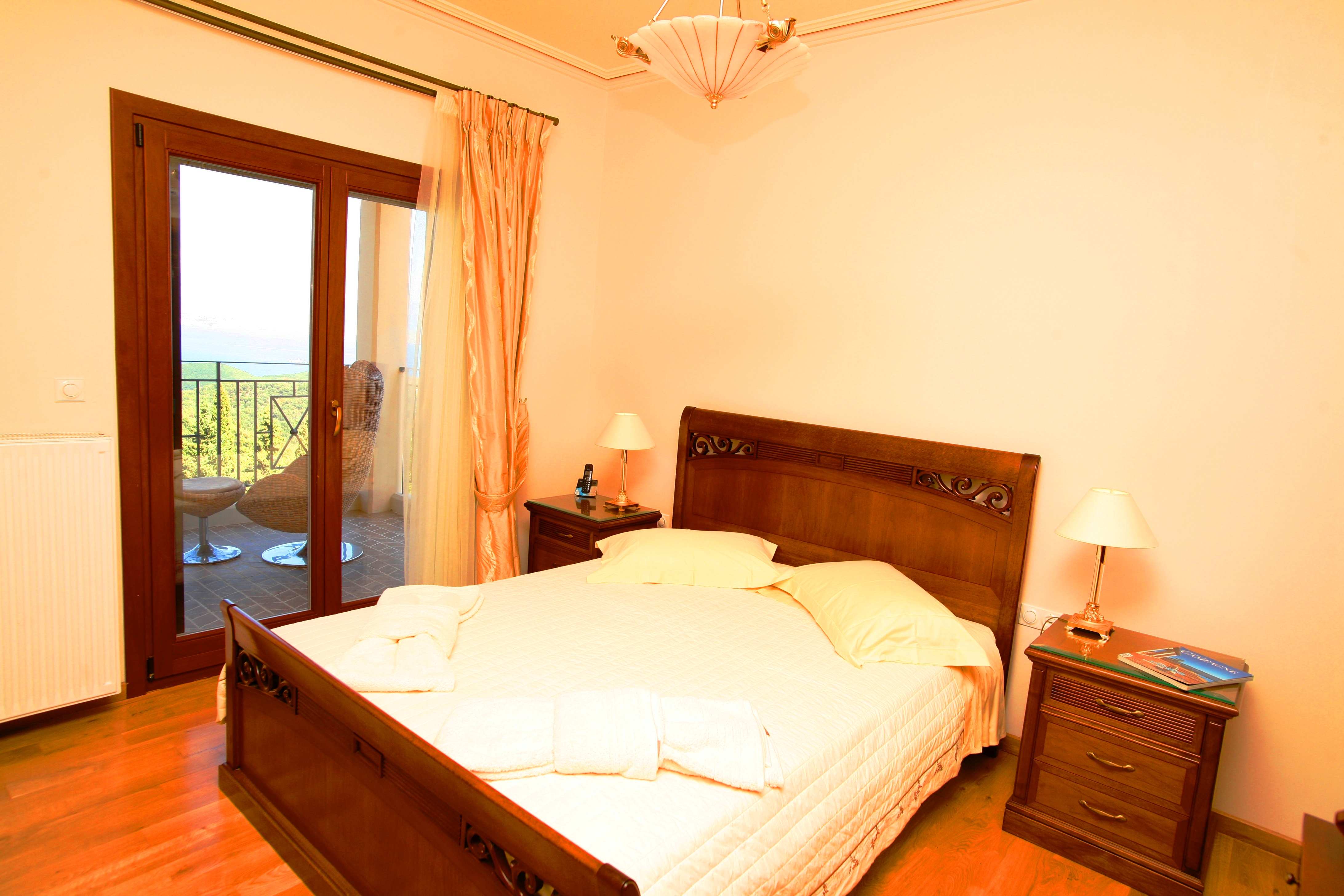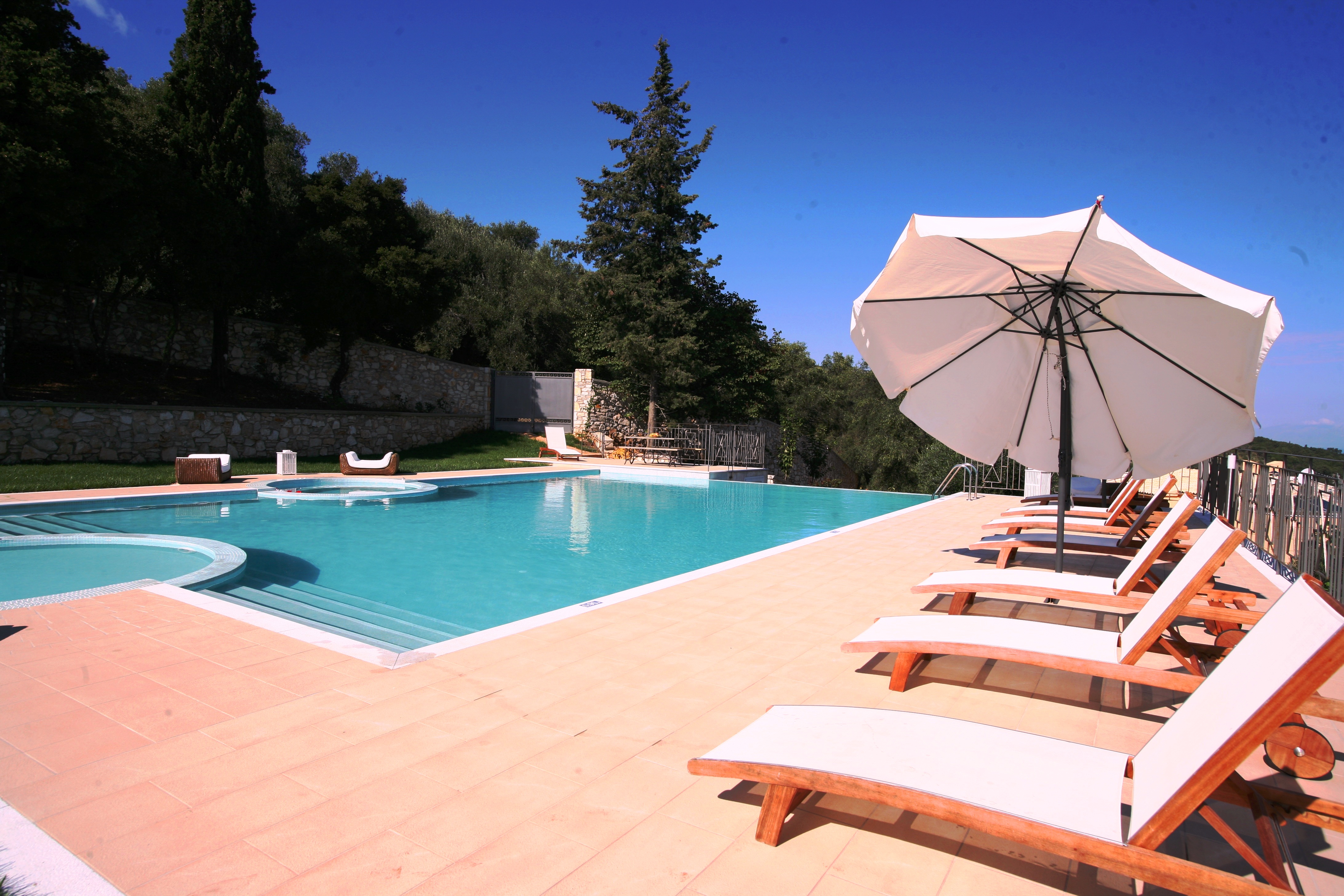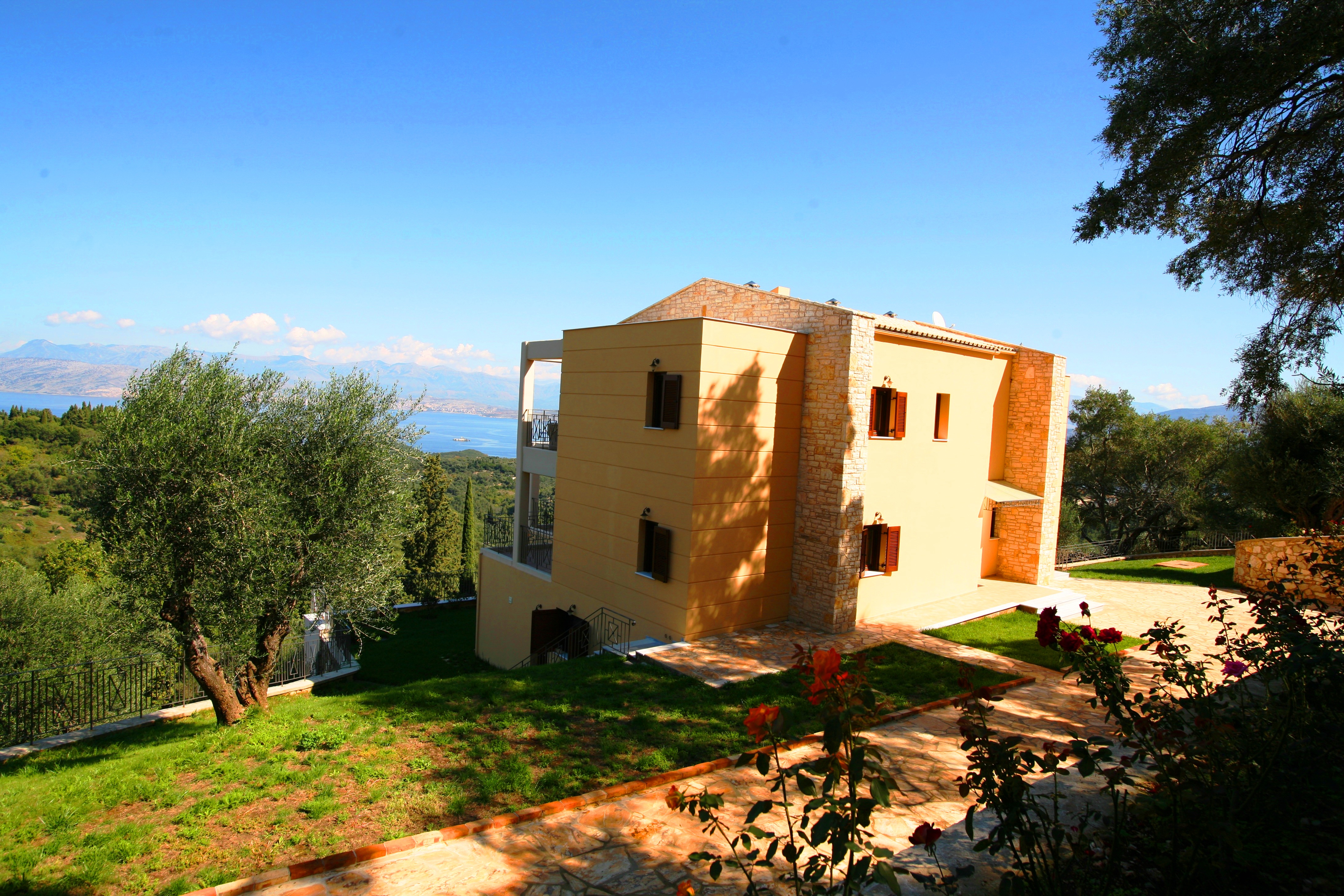 Ionian Diamond Villa is laid out over 3 levels with a lift between the levels as well as a staircase. Within an extensive ground of lawn, there is an enormous swimming pool (130 sq meters) with heated Jacuzzi and an unbelievable view over the Corfu channel. The villa has its own Private Tennis Court and a large private vineyard that produces its own local wine.