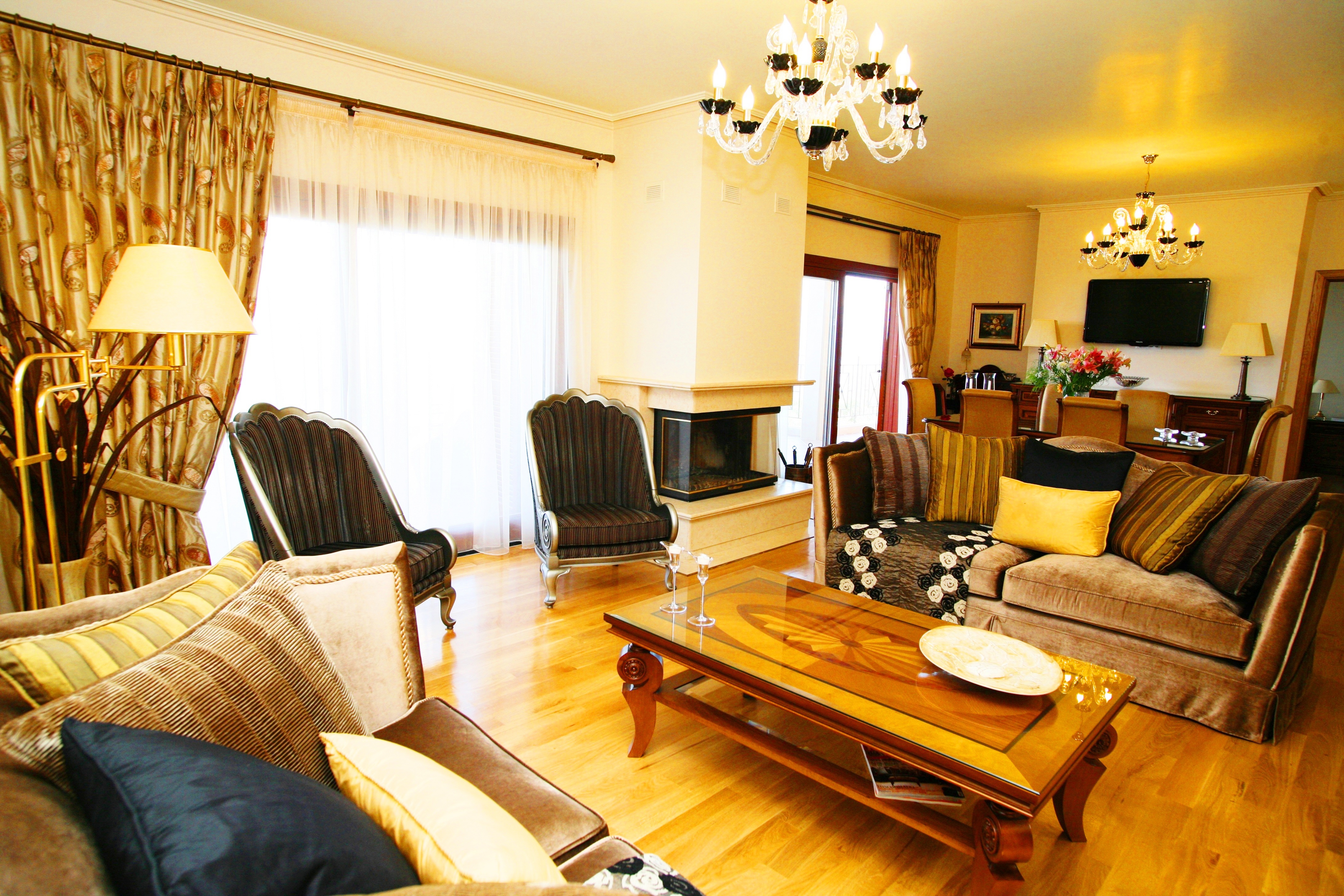 Each floor has a kitchen area with stove, coffee maker, and fridge. There are 3 washing machines, a microwave, and a separate wine fridge. The villa is well equipped with plentiful fine porcelain tableware and a selection of luxury linen and towels (swimming pool towels are also provided). There are 2 satellite plasma TVs with DVD players, hi-fi/cd player, and Playstation3, there is also high speed internet access. All bathrooms offer either a jacuzzi bath or massage shower.