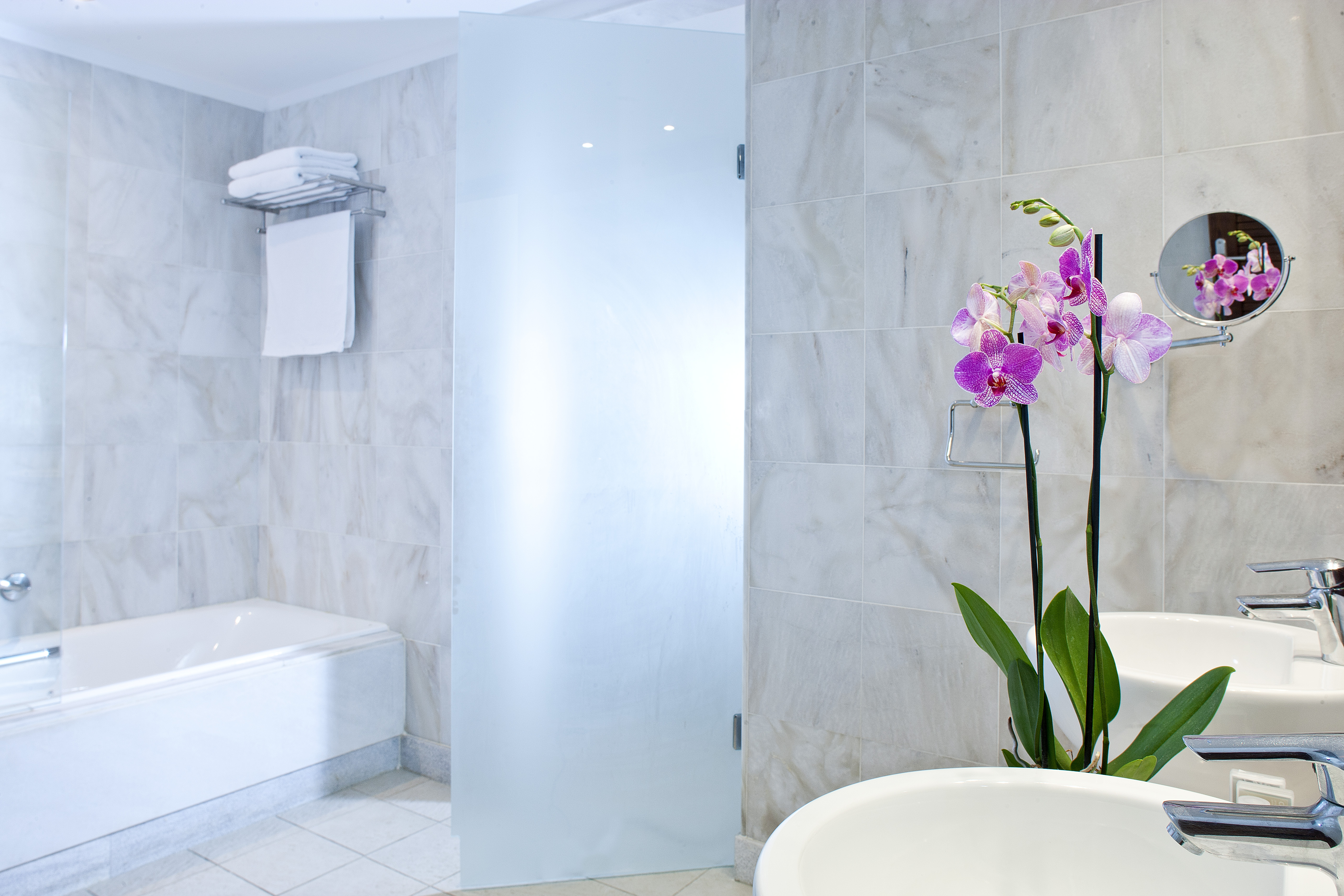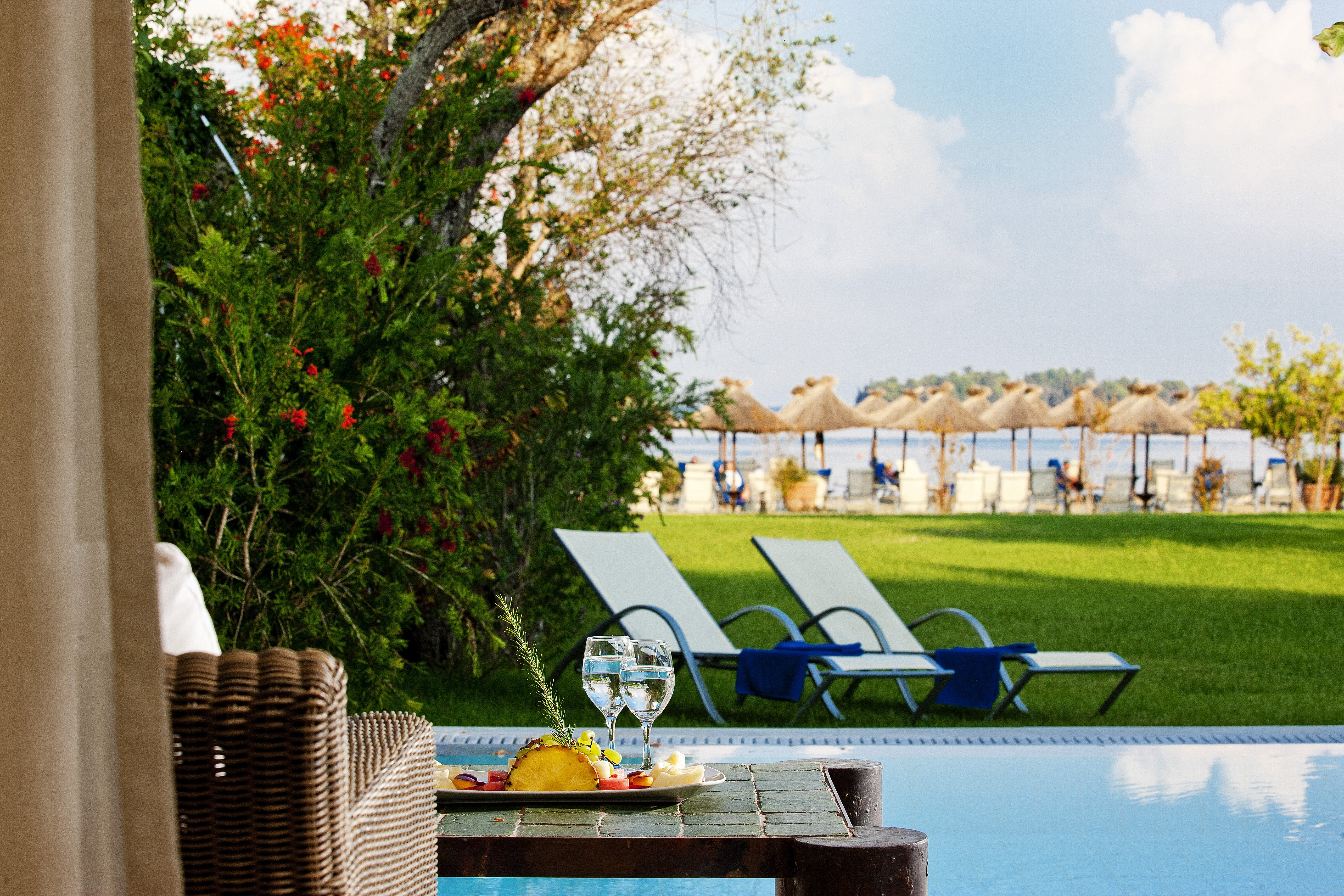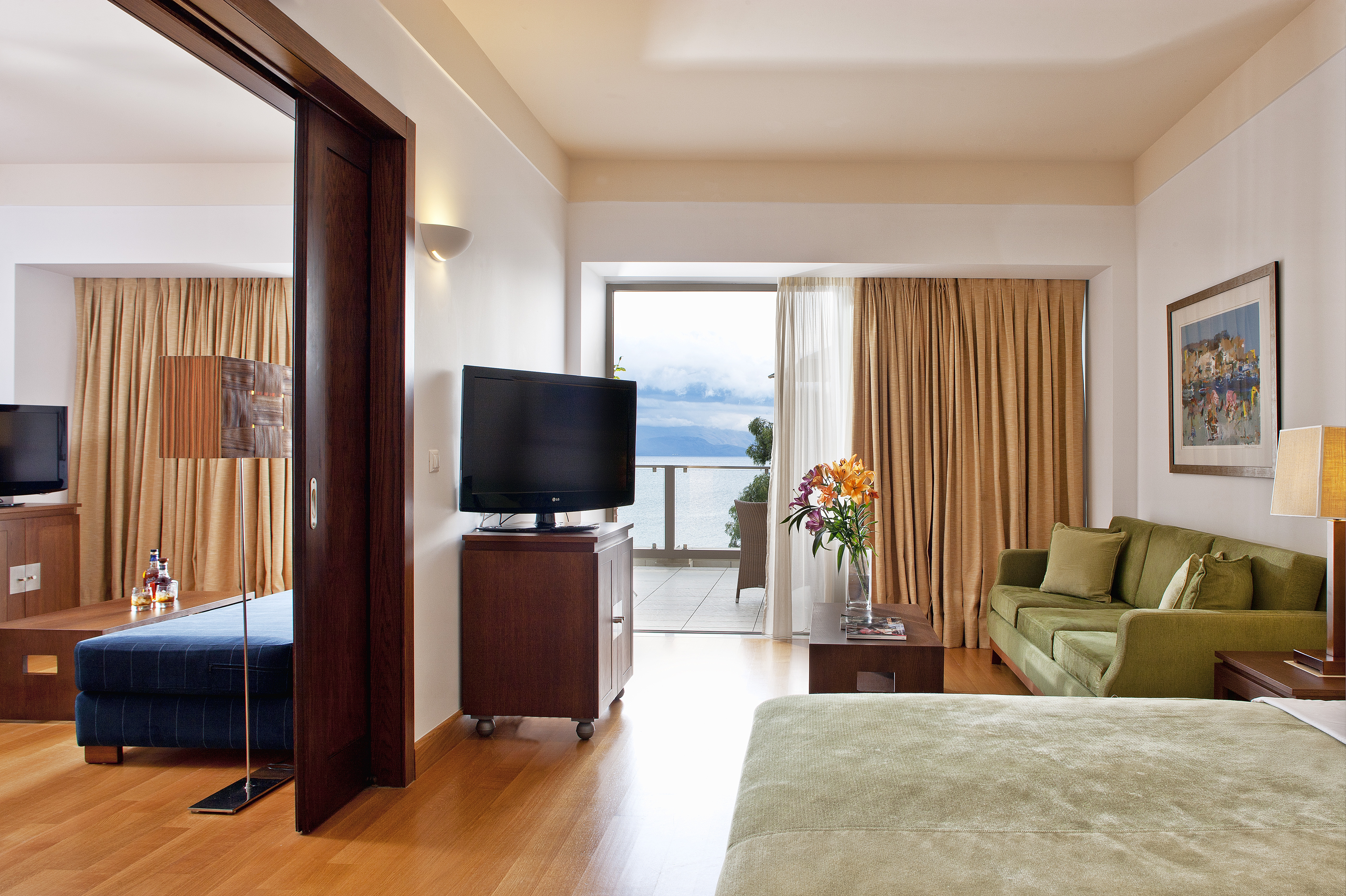 The main hotel building and the bunglaows are situated in lush green gardens. Each of the bedrooms in the main building and the bunglaows offer a private terrace or balcony. Each has a double or twin beds and a small couch or sofa bed (making them suitable for up to 3 guests) whilst family rooms have a separate area (sliding doors) containing an additional 2 single beds (suitable for up to 4 guests). All have bath/shower, bathroom amenities, bathrobes and slippers, safety deposit box, hairdrier, flat screen satellite TV, air conditioning, minibar, direct dial telephone and wi-fi internet access. Standard rooms offer garden views – upgrades are available to offer bay views (over the marina of Gouvia) or sea views (over the Ionian towards Corfu Town). For even more luxury, rooms with private plunge pools are also available.