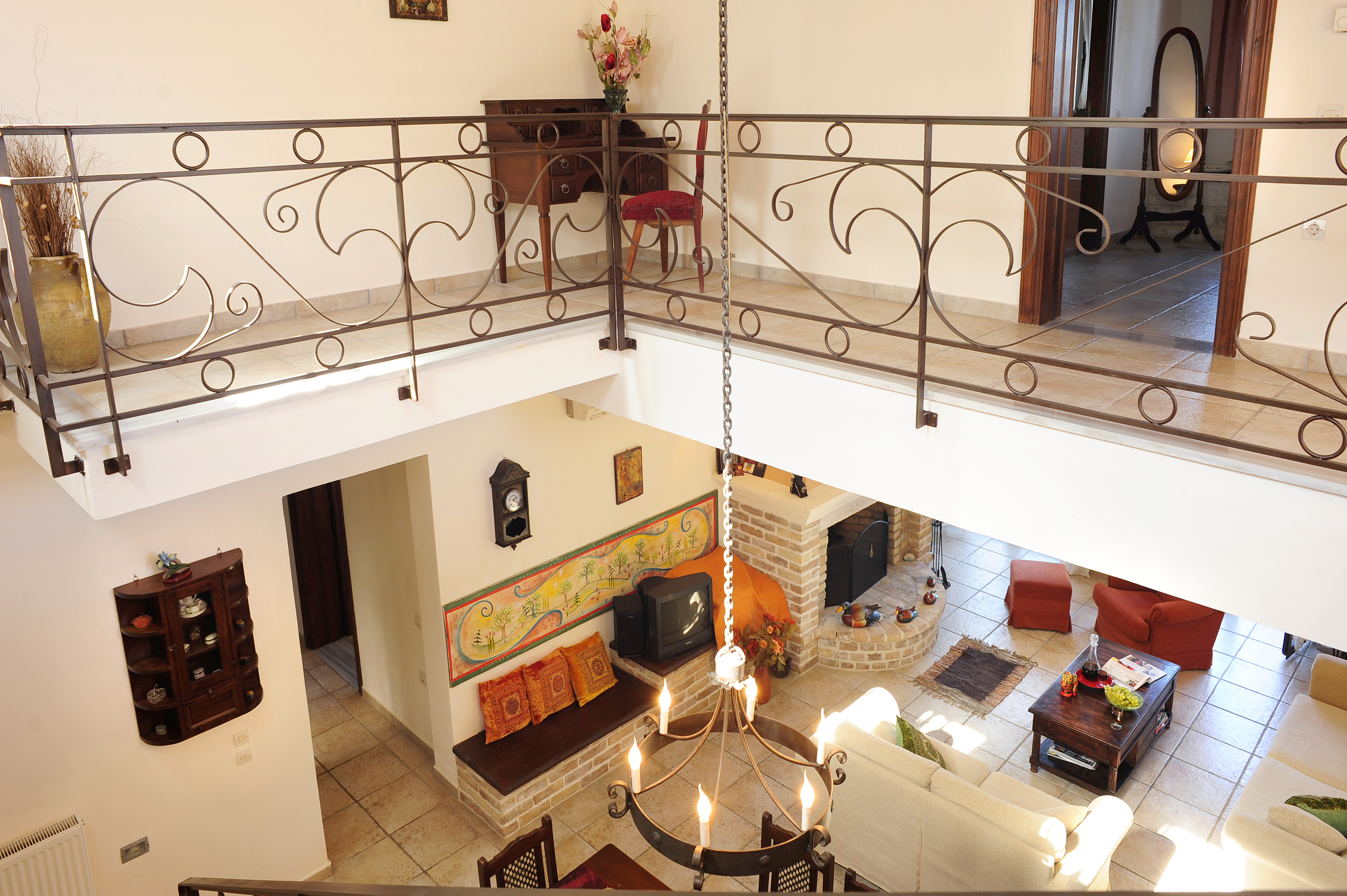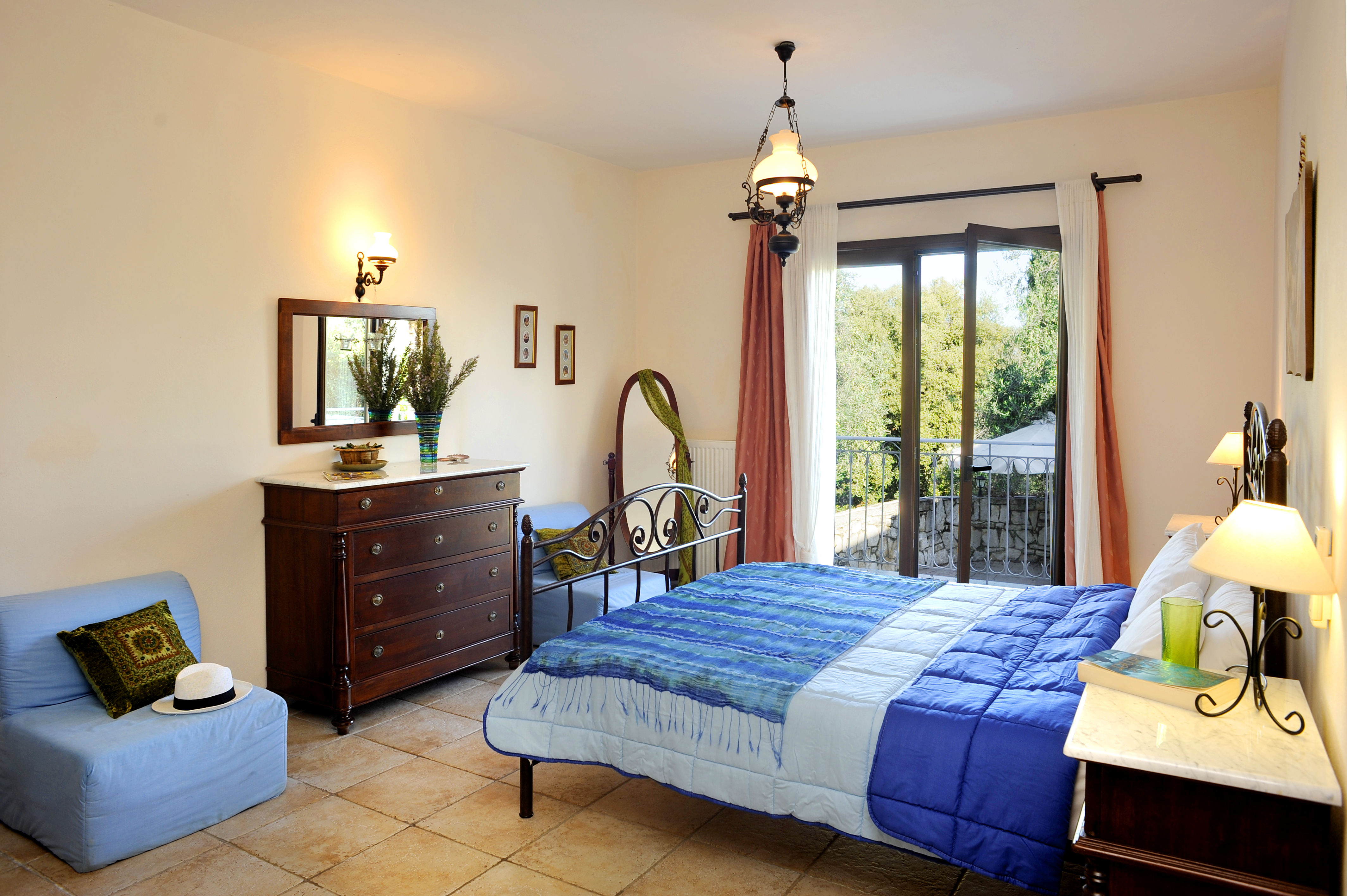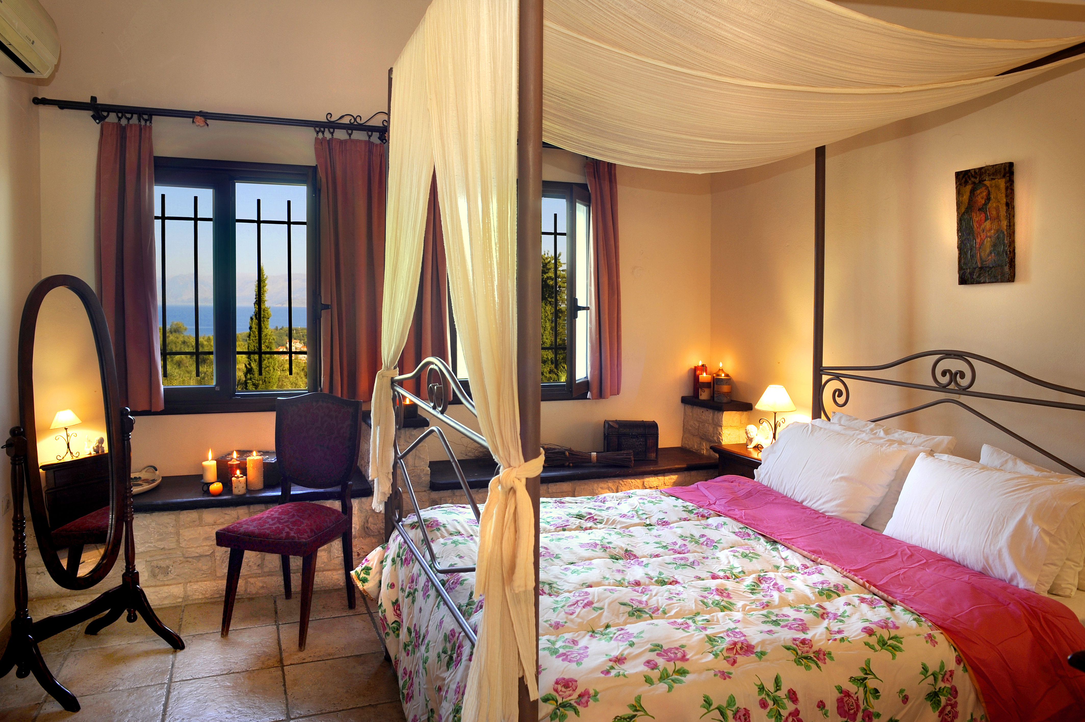 An open stair case in the lounge room leads up to the first floor, from this gallery style level there is access to a massive roof terrace, with shaded area and stunning sea views. Also on this level is another double bedroom with 4 poster bed, there are window seats which offer amazing views down to the village of Kassiopi and beyond. The en suite bathroom has full bath and shower, wc and baisin. There is a walk in wardrobe. All bedrooms are air conditioned.