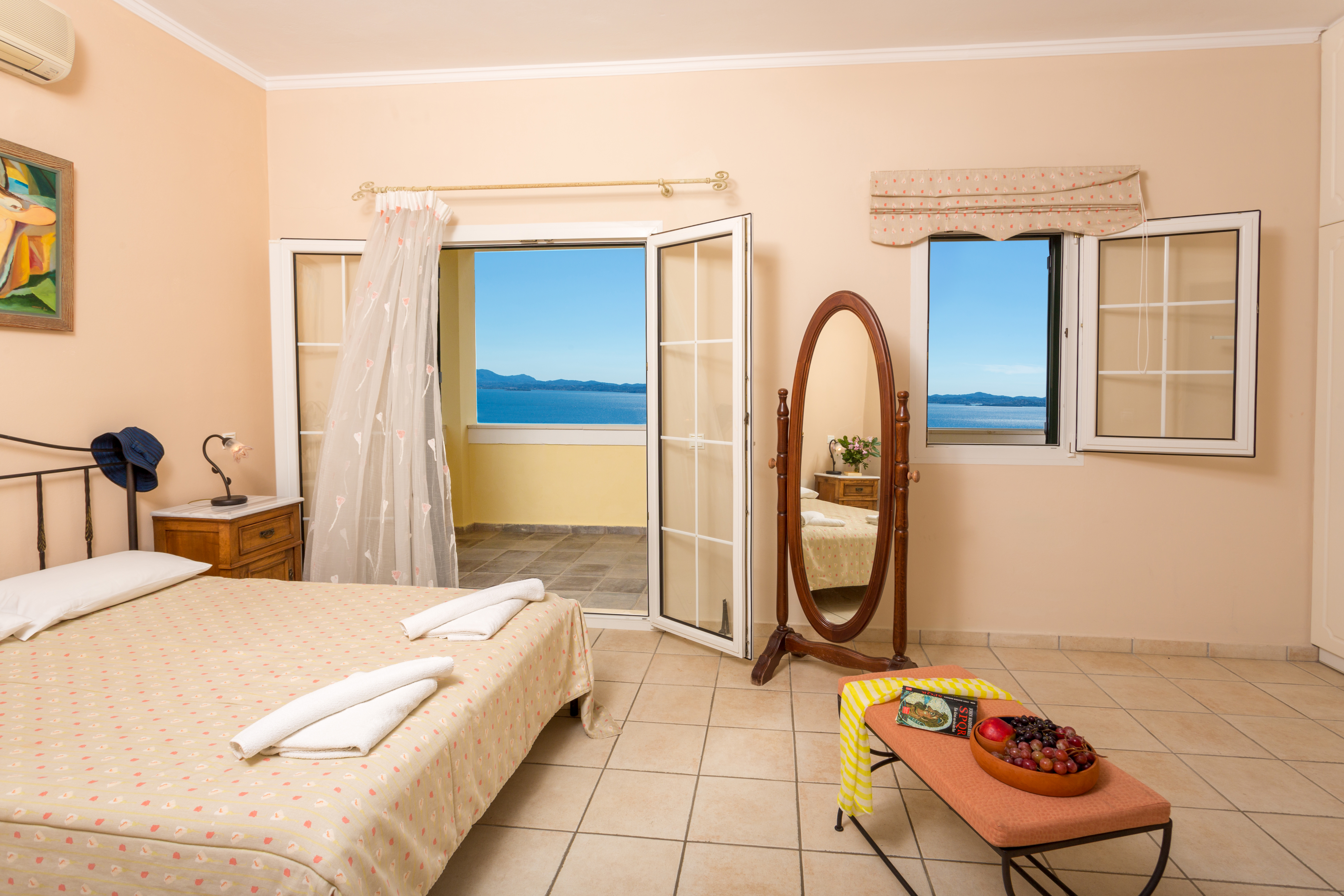 Bedroom with ensuite, King size bed, A/C unit, Patio doors, Balcony, Bath with over head shower, WC, Twin washbasin