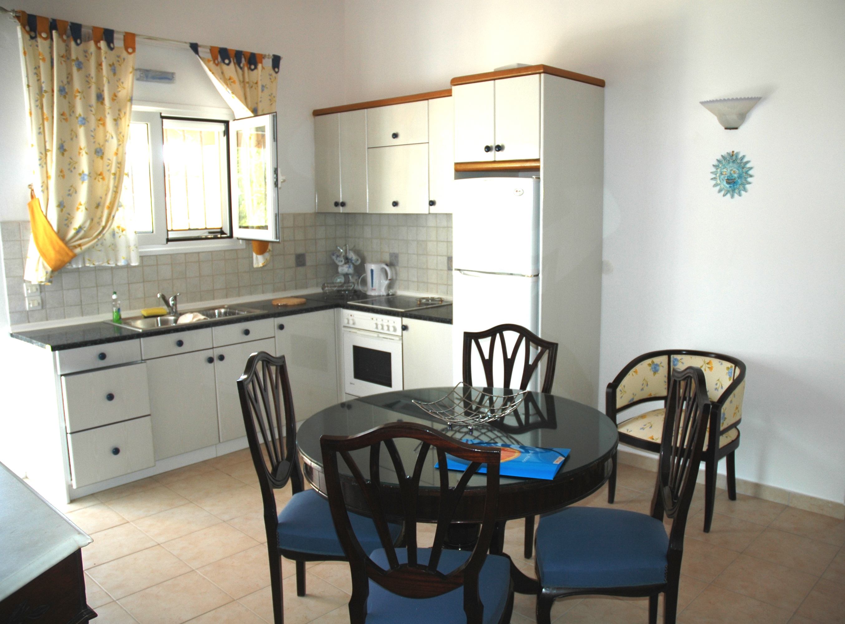 Set on one level Villa Kassandra has a fully fitted kitchen with microwave oven, full oven and hob, fridge/freezer and coffee machine. There is an open dining area and lounge with sofabed and 2 twin rooms each with an ensuite shower room and satellite TV (limited English channels). There is also a small safe. The balcony runs the entire length of the front of the house providing plenty of space for al fresco dining.