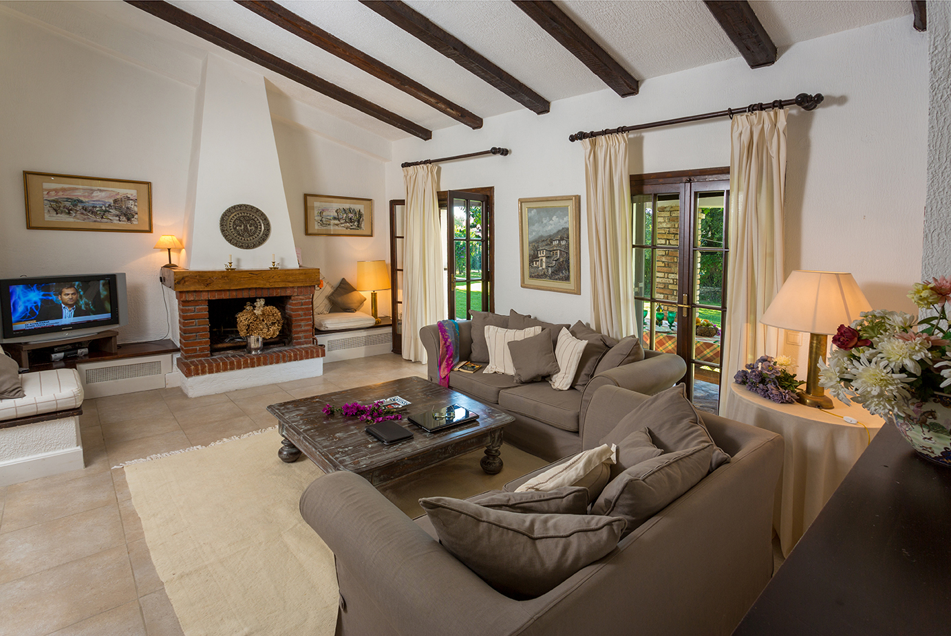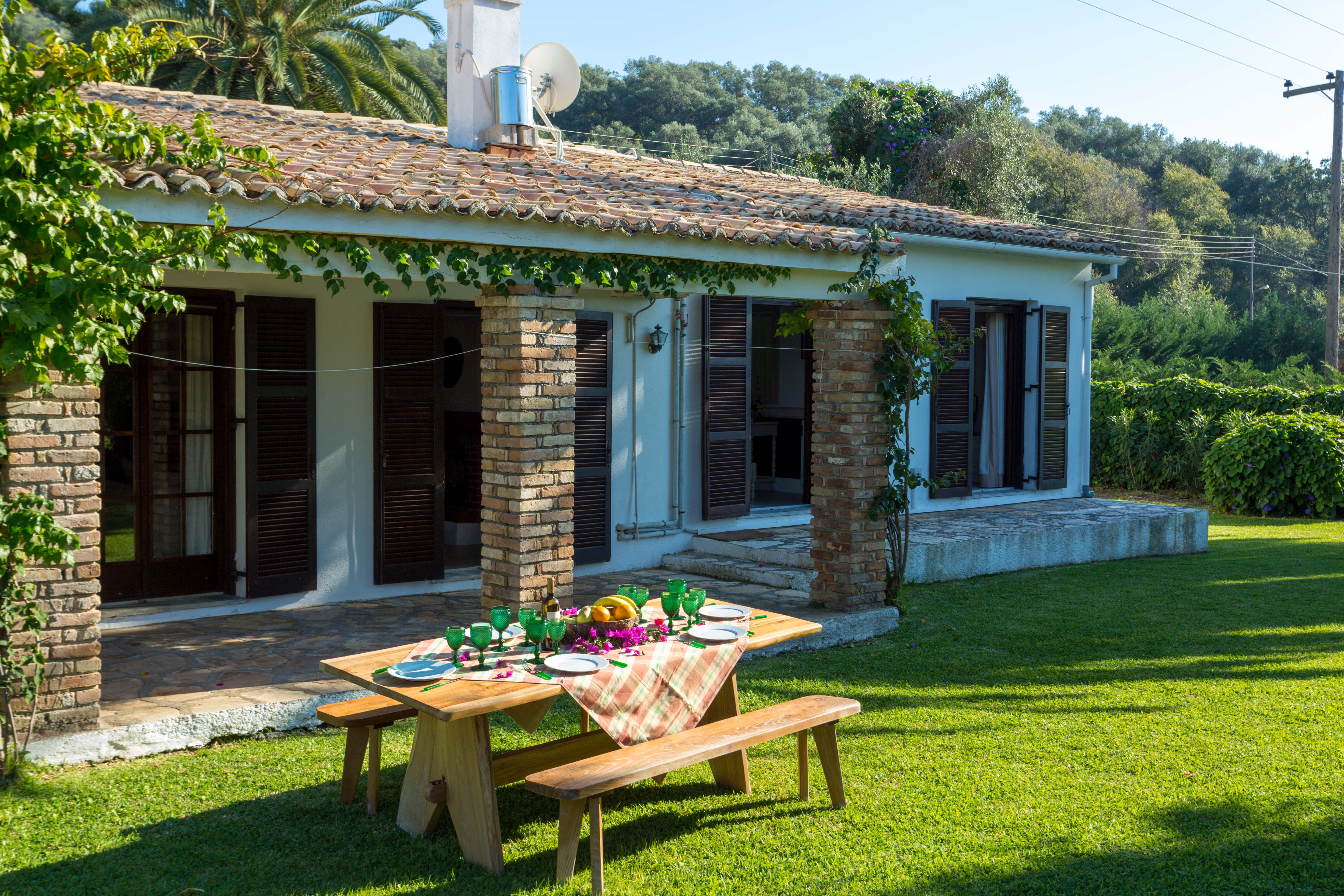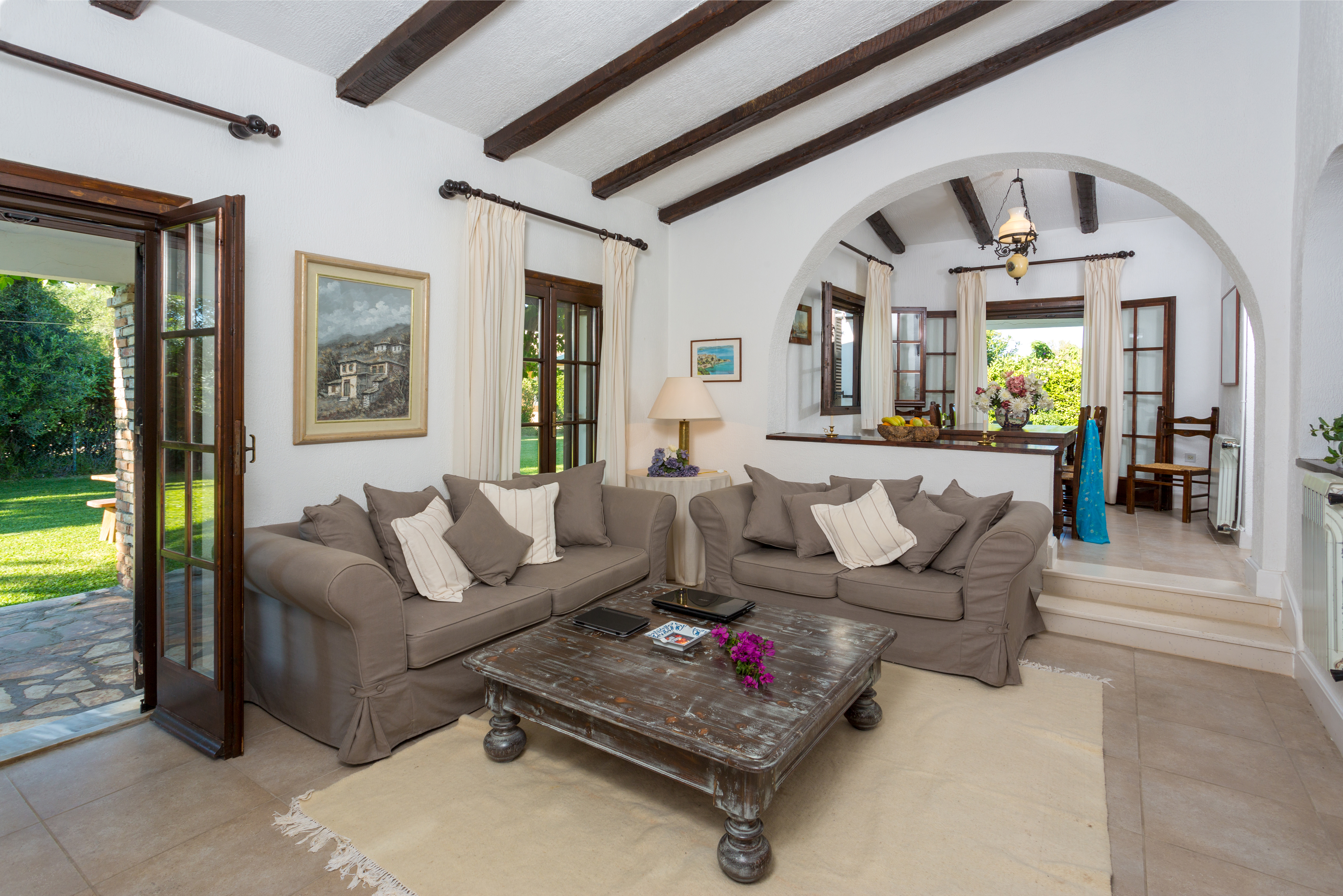 A stone-paved terrace runs around the house providing spaces to relax in the sun and shade, and the good-sized pool with its terraced surrounds provides a further attractive place to unwind and soak up the Corfiot sunshine. The villa is perfectly located; close to the beach and the pretty resort village of Acharavi. Villa Venus has a large open plan spacious living and dining area with ample accommodation. Feature fireplace, DVD player, and TV. Patio doors lead out to the garden and pool patio.