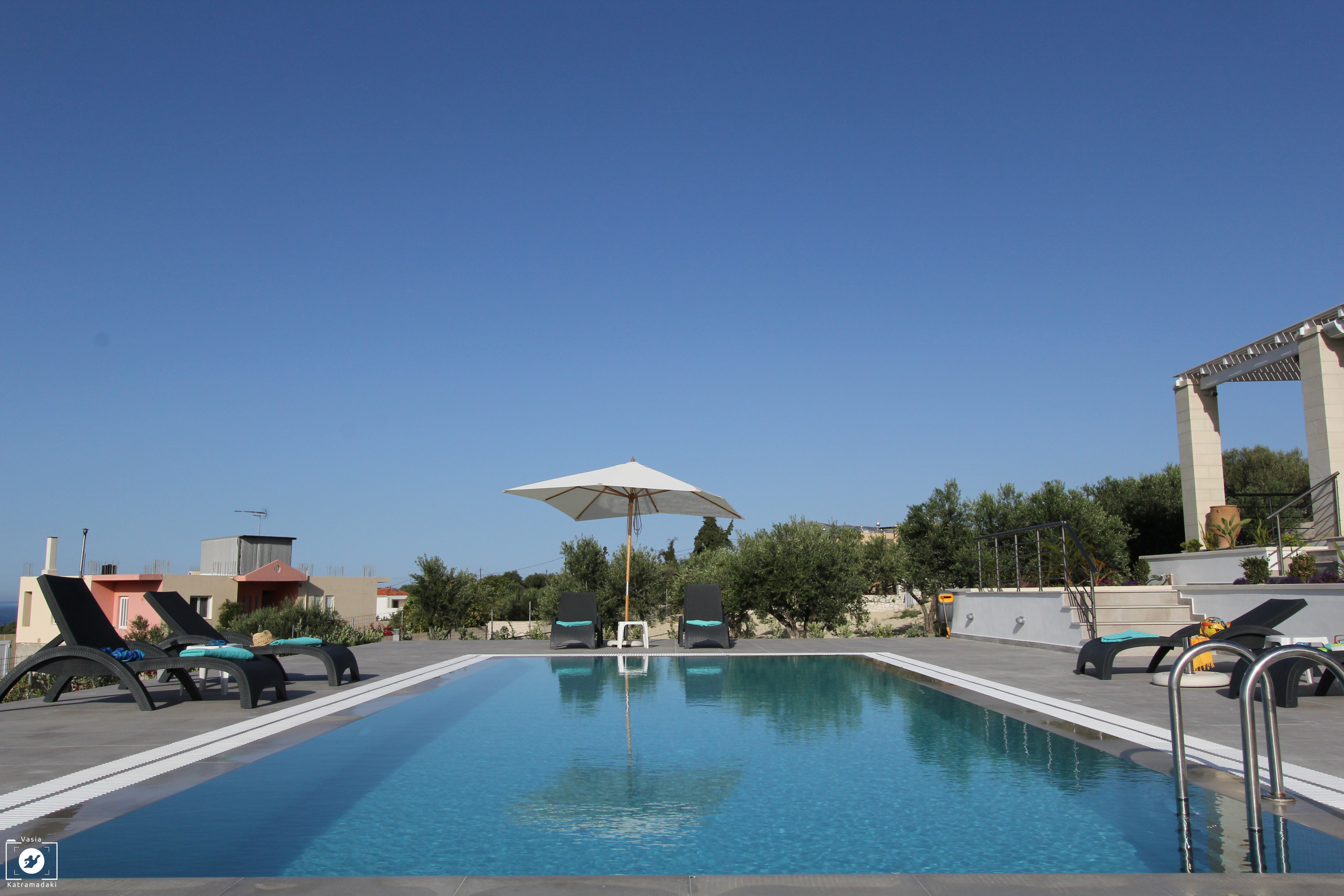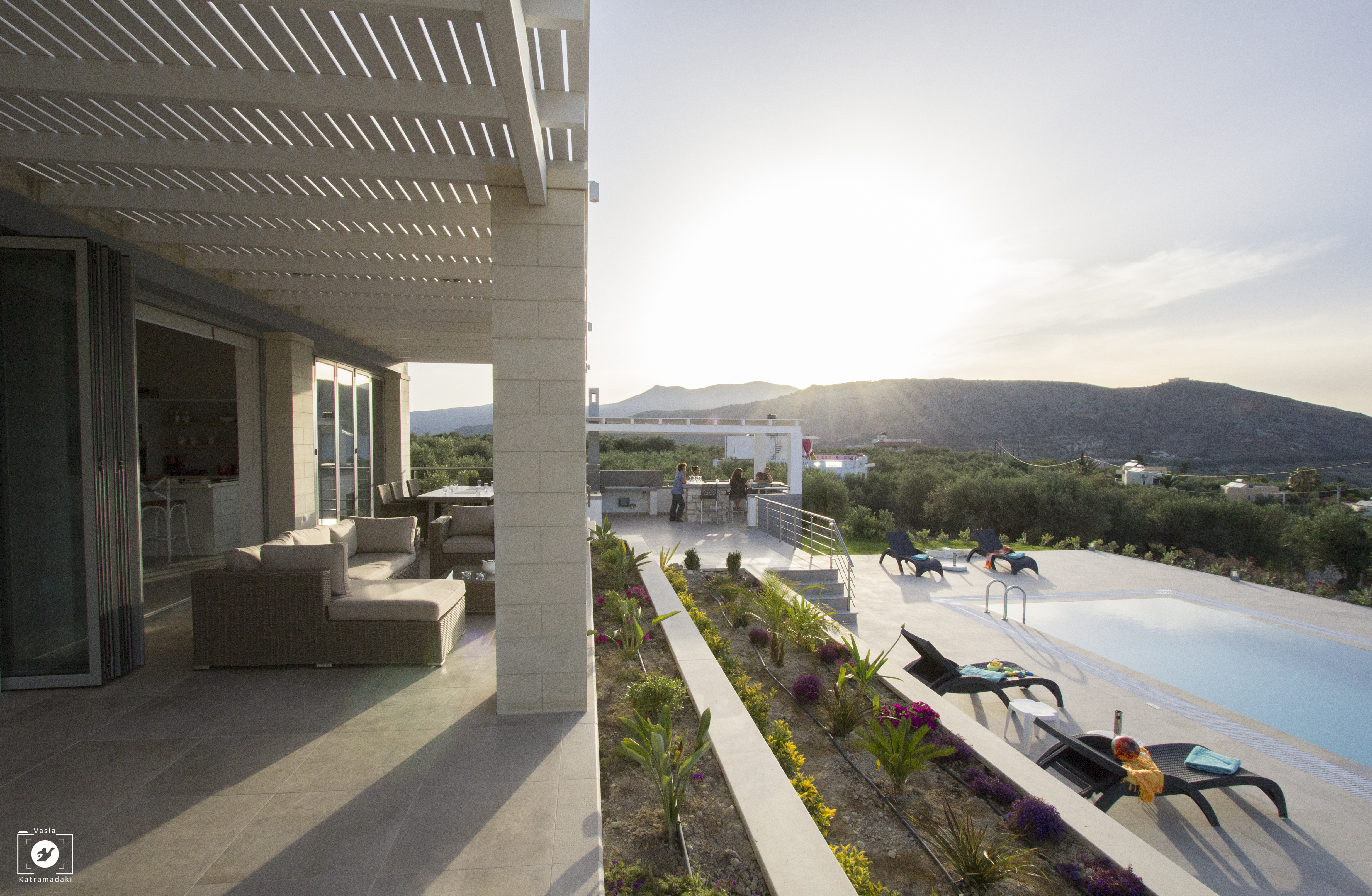 The property is set in extensive private grounds in a residential area just outside the coastal village Kalyves in Western Crete and has therefore a variety of traditional taverna’s, restaurants, shops and 3 beaches on the doorstep. The popular historic town of Chania is also nearby (20-minute drive) and therefore offers a great opportunity for a day trip. The villa is surrounded by manicured gardens featuring lush lawns, flowering plants, an organic vegetable garden as well as other Mediterranean vegetation. Several al fresco dining and lounge terraces, a great BBQ suite with outdoor oven and plenty of room for children to play safely, invite the guests and their young ones to relax and enjoy themselves.