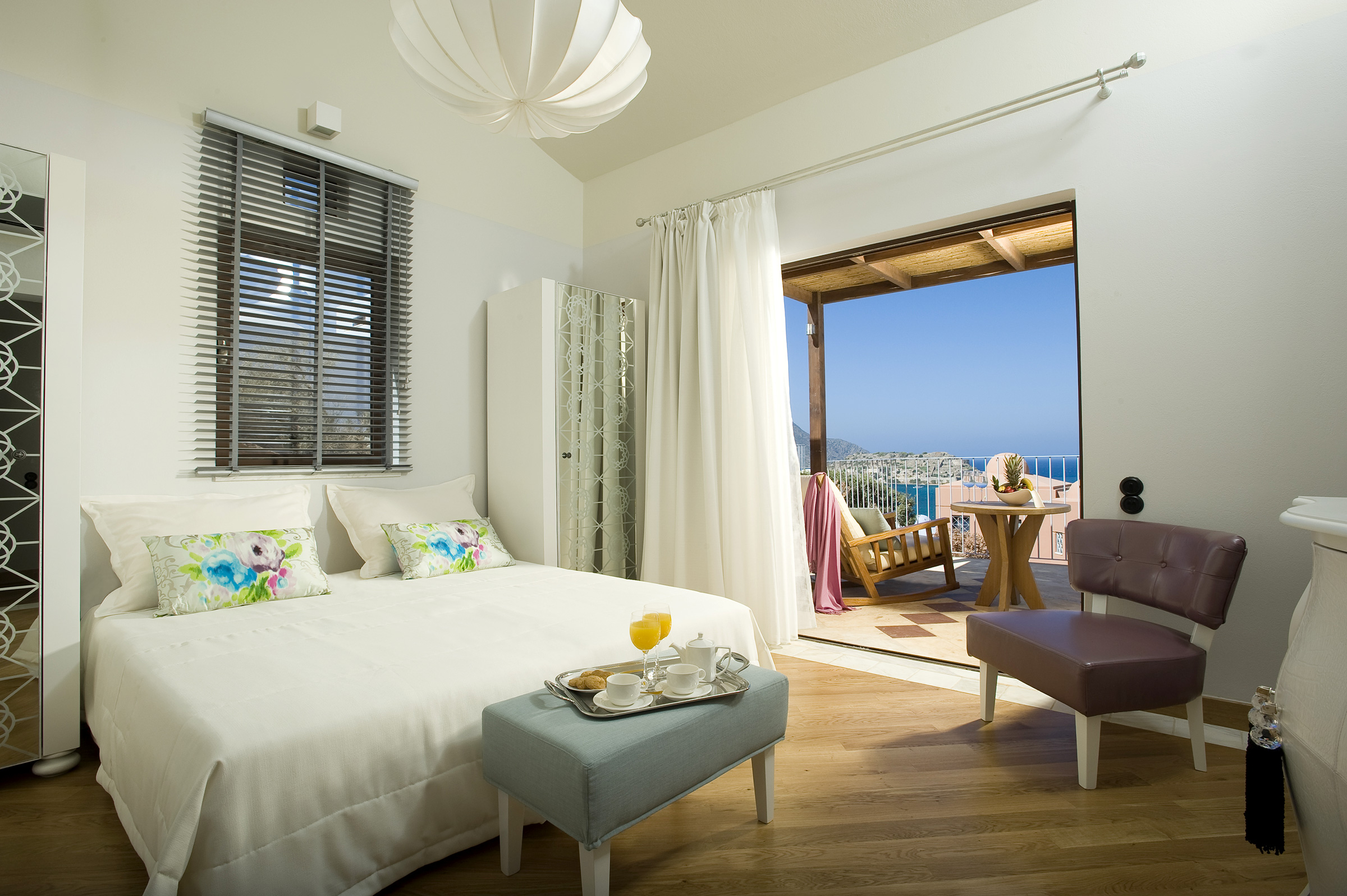 The 80 suites embody the elegance of Mediterranean interiors, traditional artifacts, earth colours and delicately carved wooden furnishings. Each suite offers stunning views of the Cretan landscape and sea or the fascinating islet of "Spinalonga" from the two spacious private verandas. All of them have been built within two-storey structures, with easy access from the main building. Without doubt, the "Domes of Elounda All Suites and Villas Spa resort" gives the individual the freedom to spend quality time in their own spacious suite, with its Mediterranean style interior, private pool or open-air Jacuzzi.