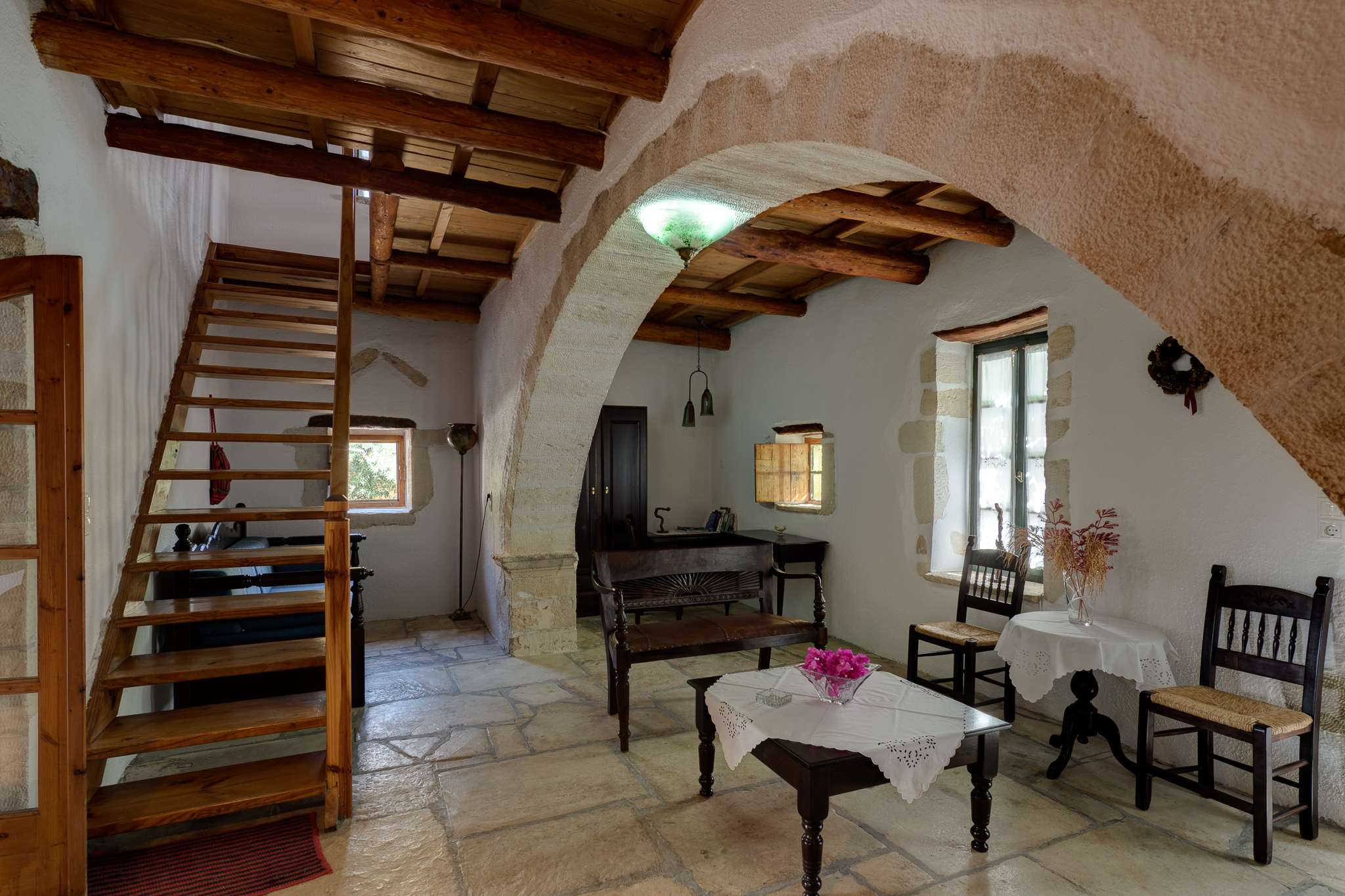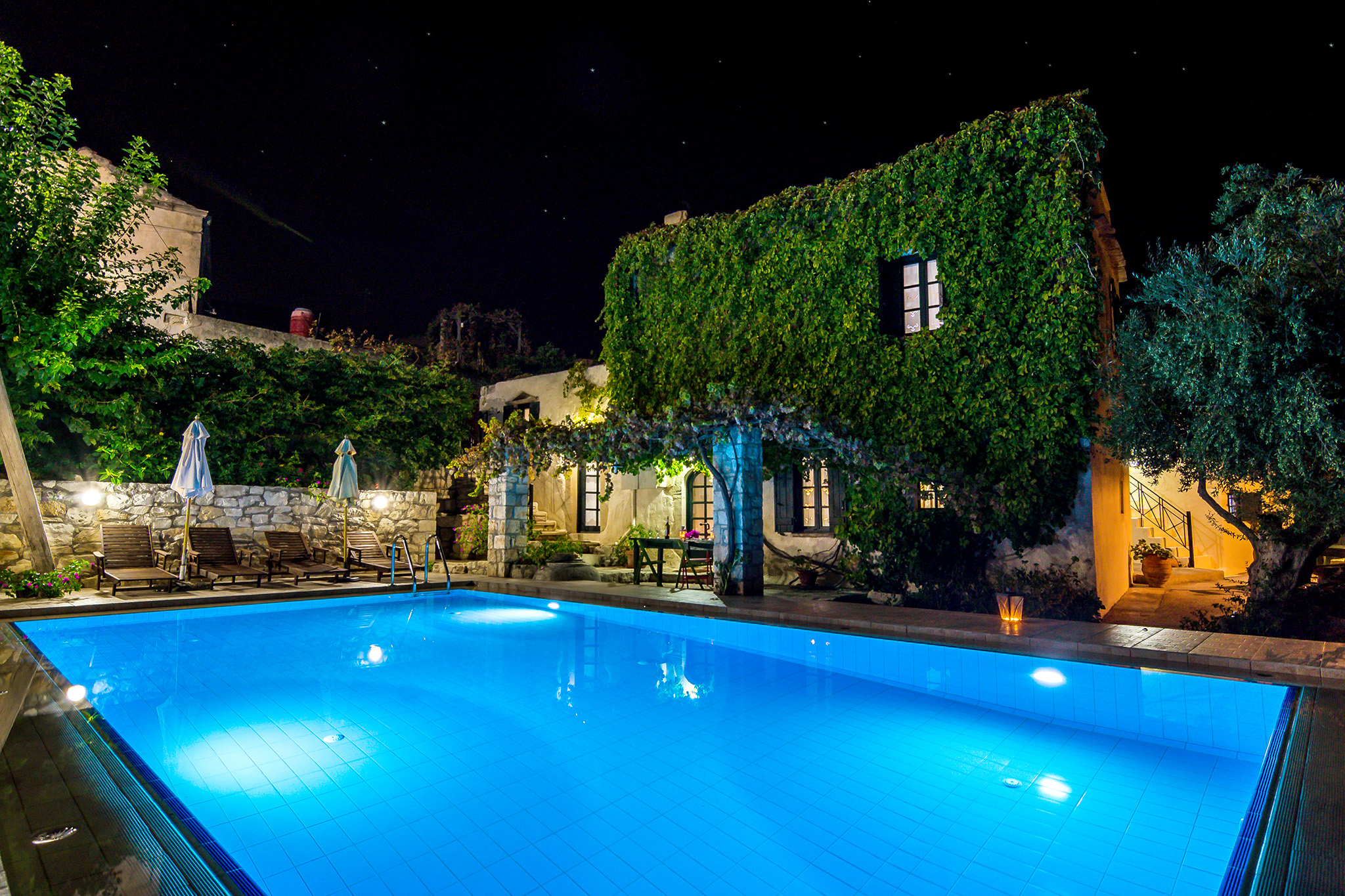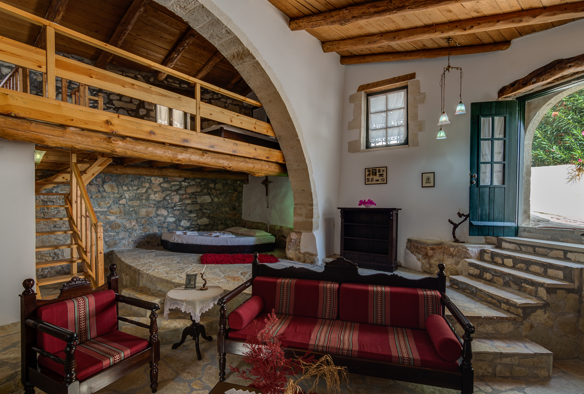 The two Millstone Houses used to be in the 18th century an olive press. Located in the traditional village of Douliana 2km from Vamos, they have a beautiful garden, communal barbecue area and large shared swimming pool. The rooms have high ceilings and the walls are decorated with the old millstones of the olive press.