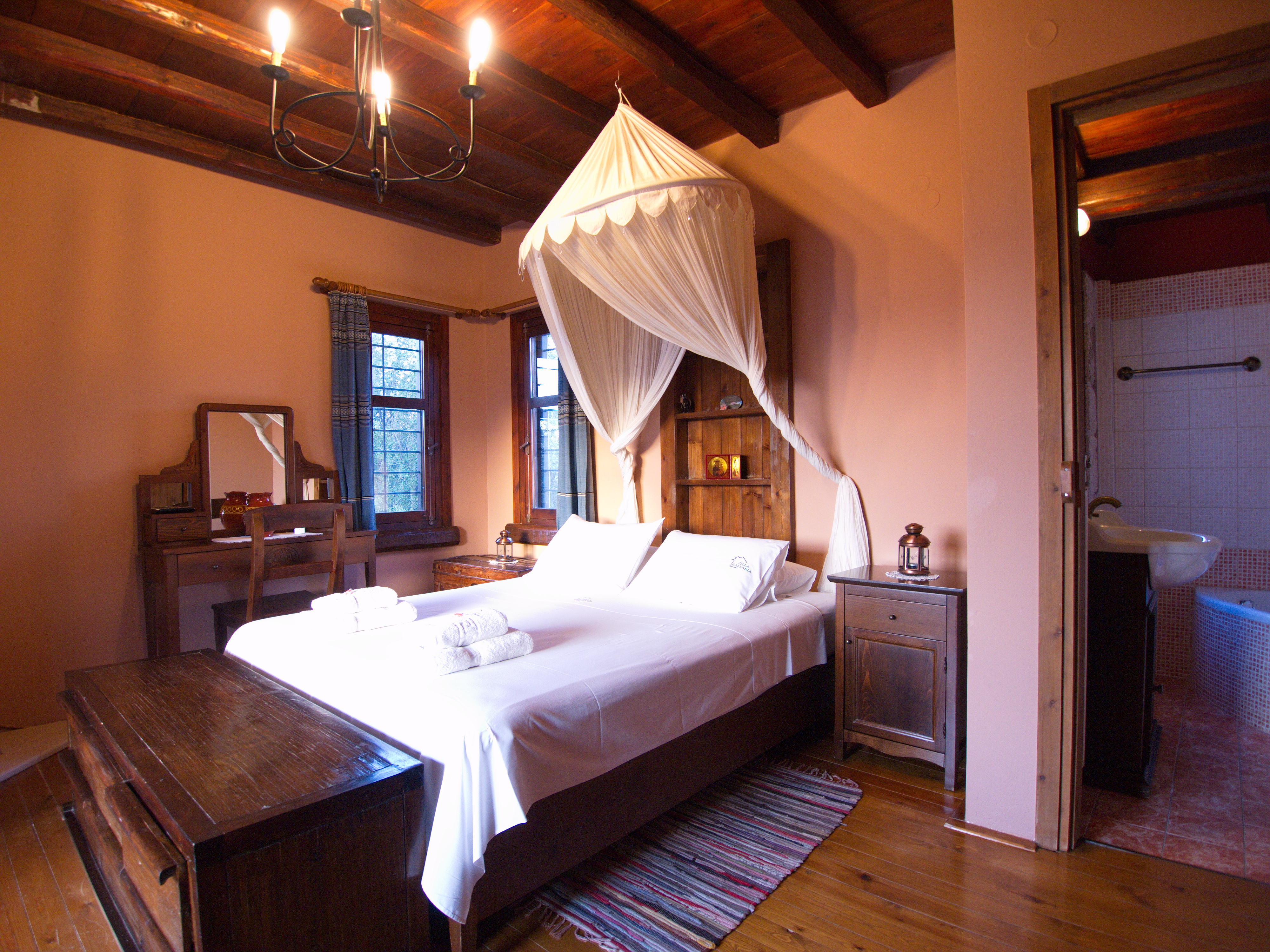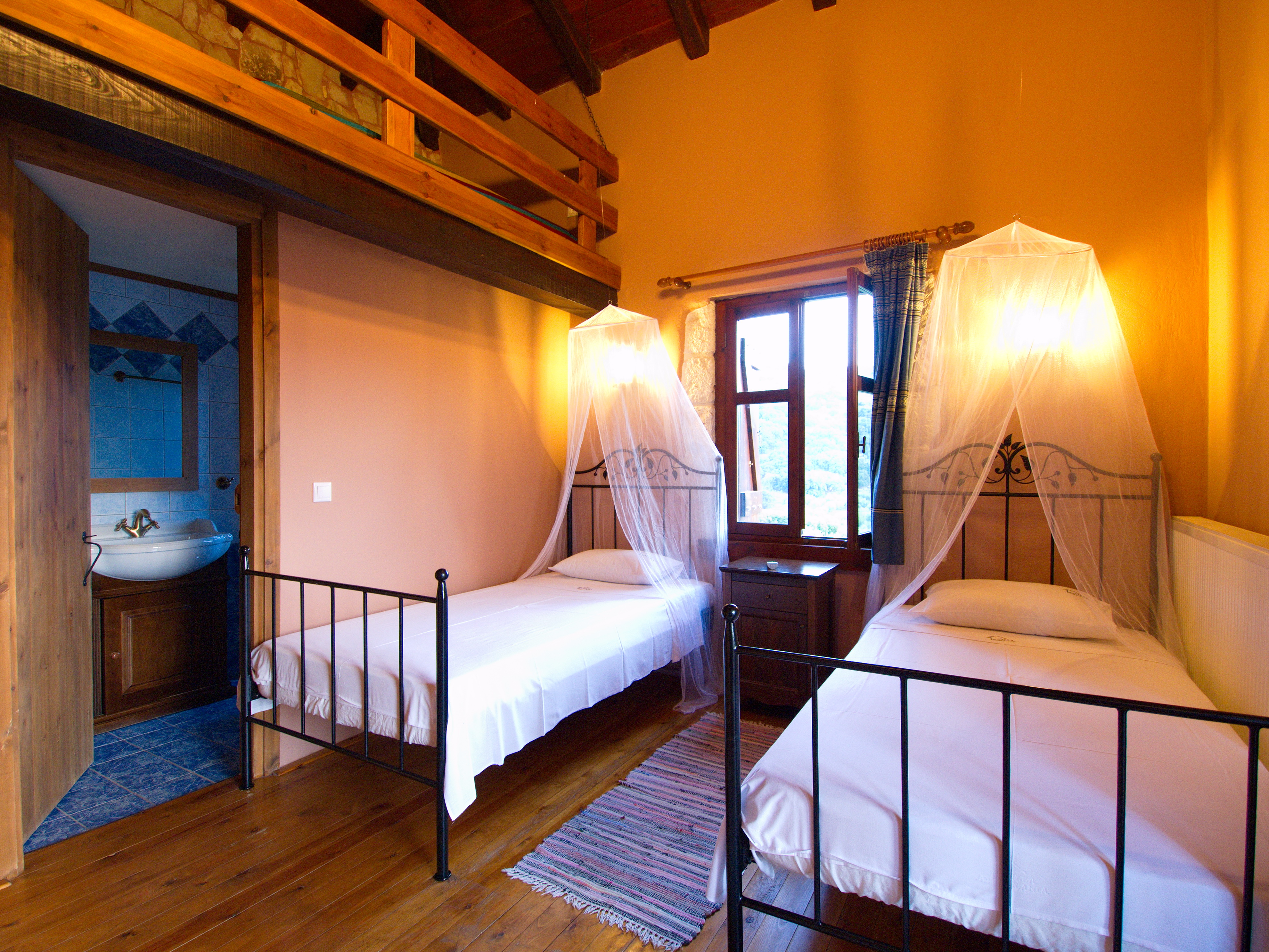 At first floor level and reached by a wooden staircase is one twin bedroom with en-suite shower room and a master bedroom with double bed, stone fireplace and en-suite bathroom with a lavish corner bath. Both bedrooms have wood floors and french doors opening out onto covered balconies overlooking the pool and views towards the mountains.