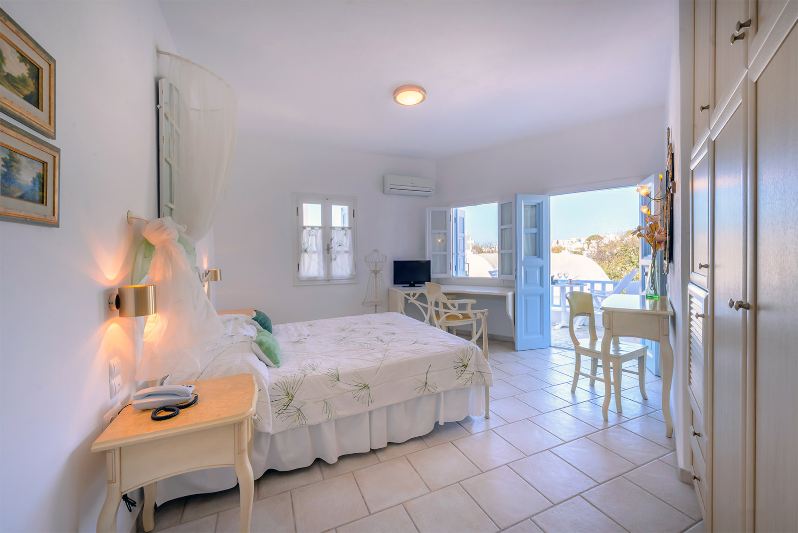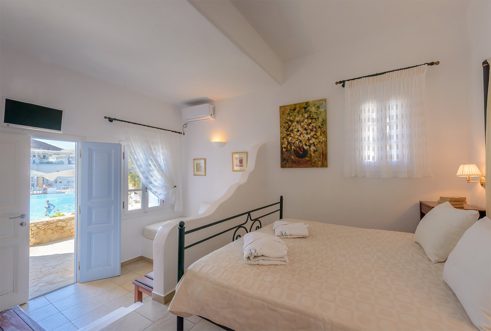 Junior suites are on the first floor and consist of 2 separate rooms, marble tiled bathroom with Jacuzzi bath. Furnishing is either traditional wooden or hand made iron. The suites offer either magnificent Chora view from the balcony or pool view from the veranda.