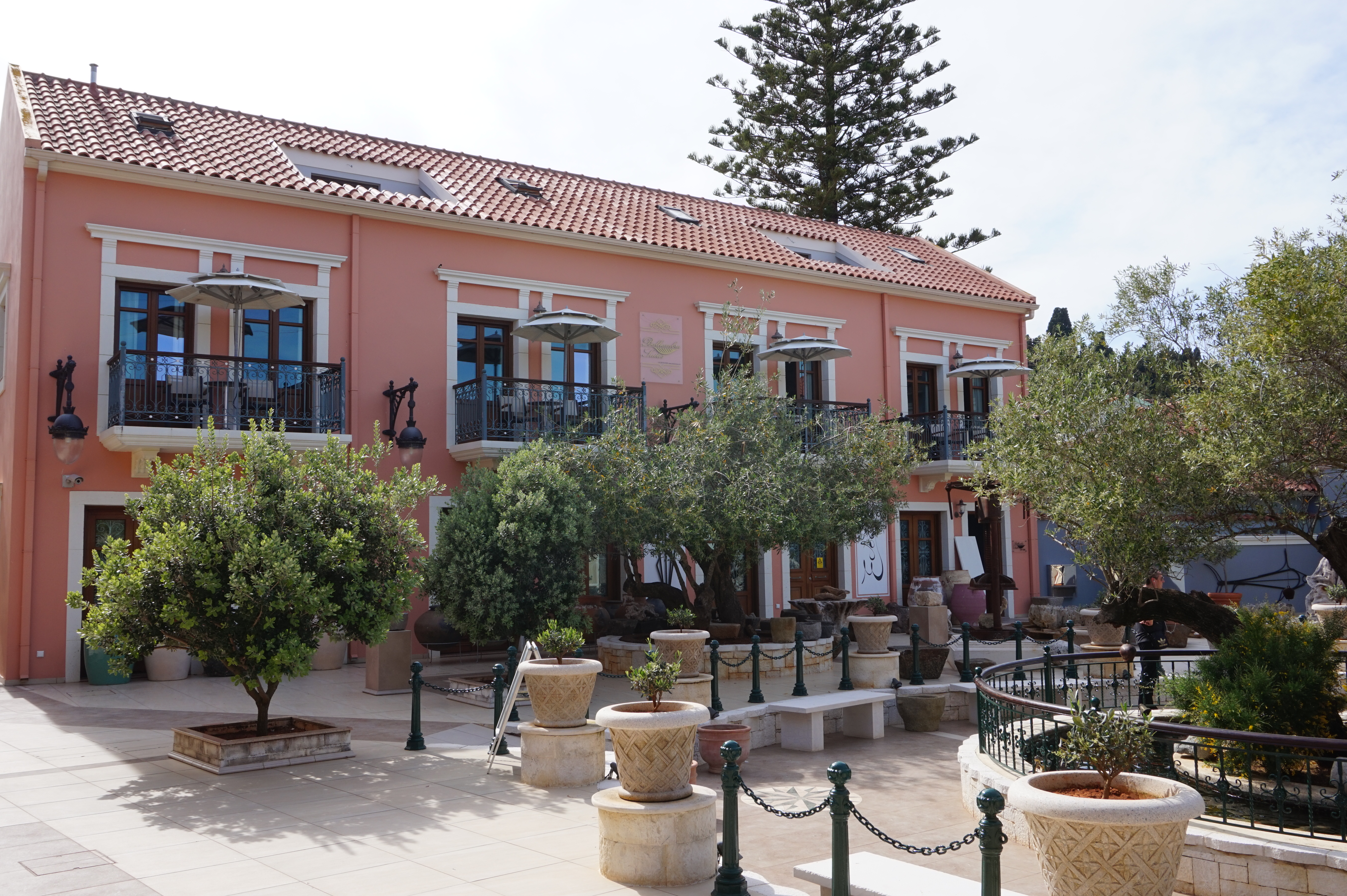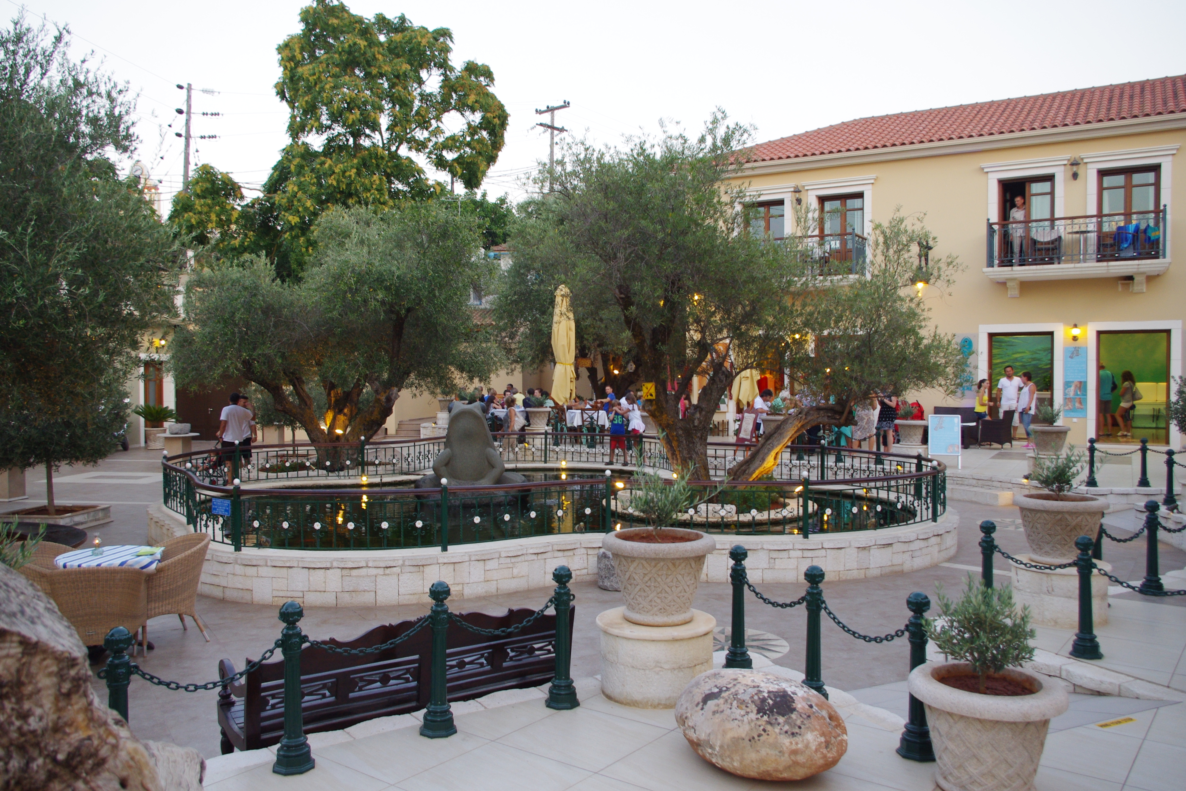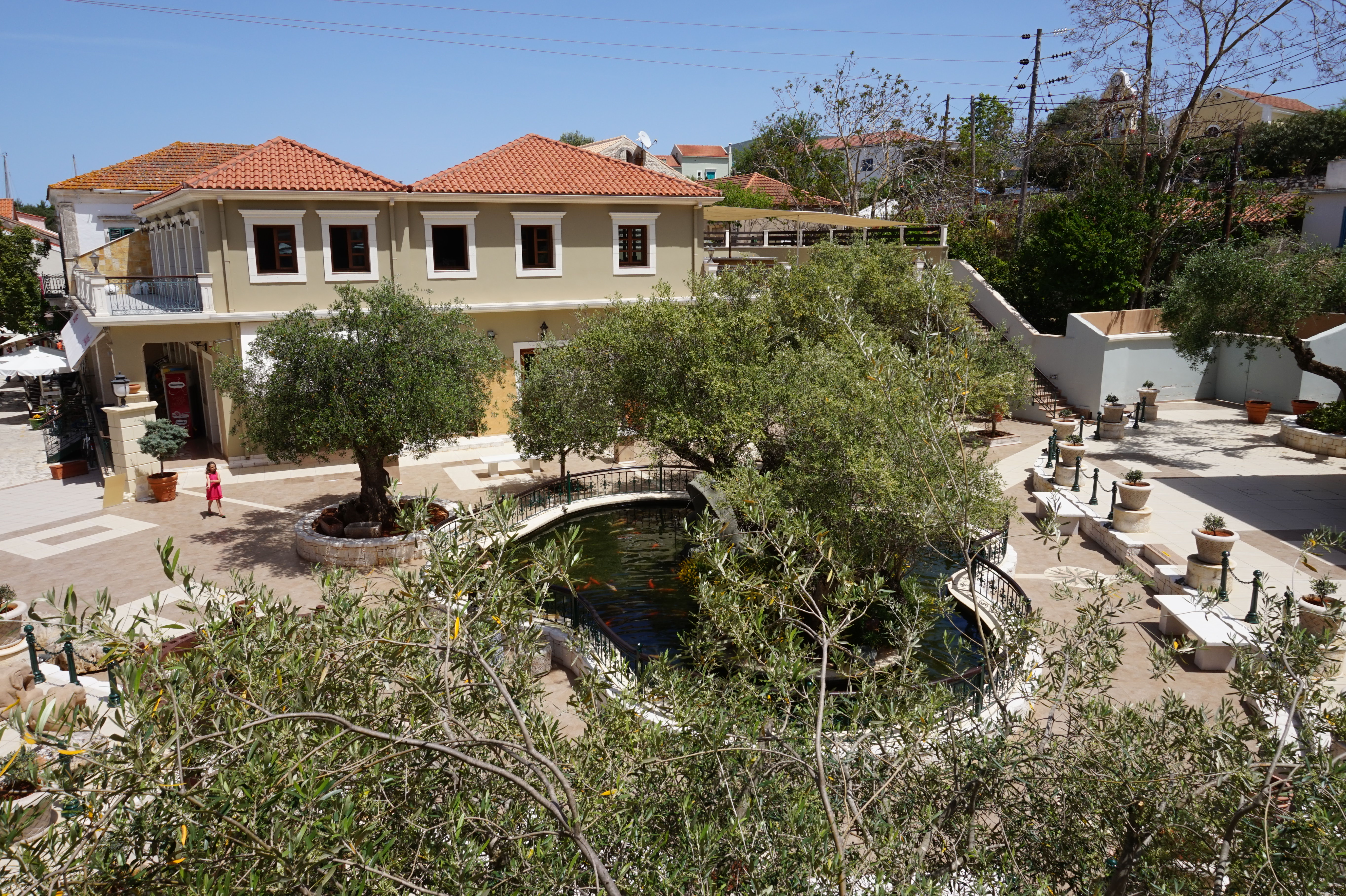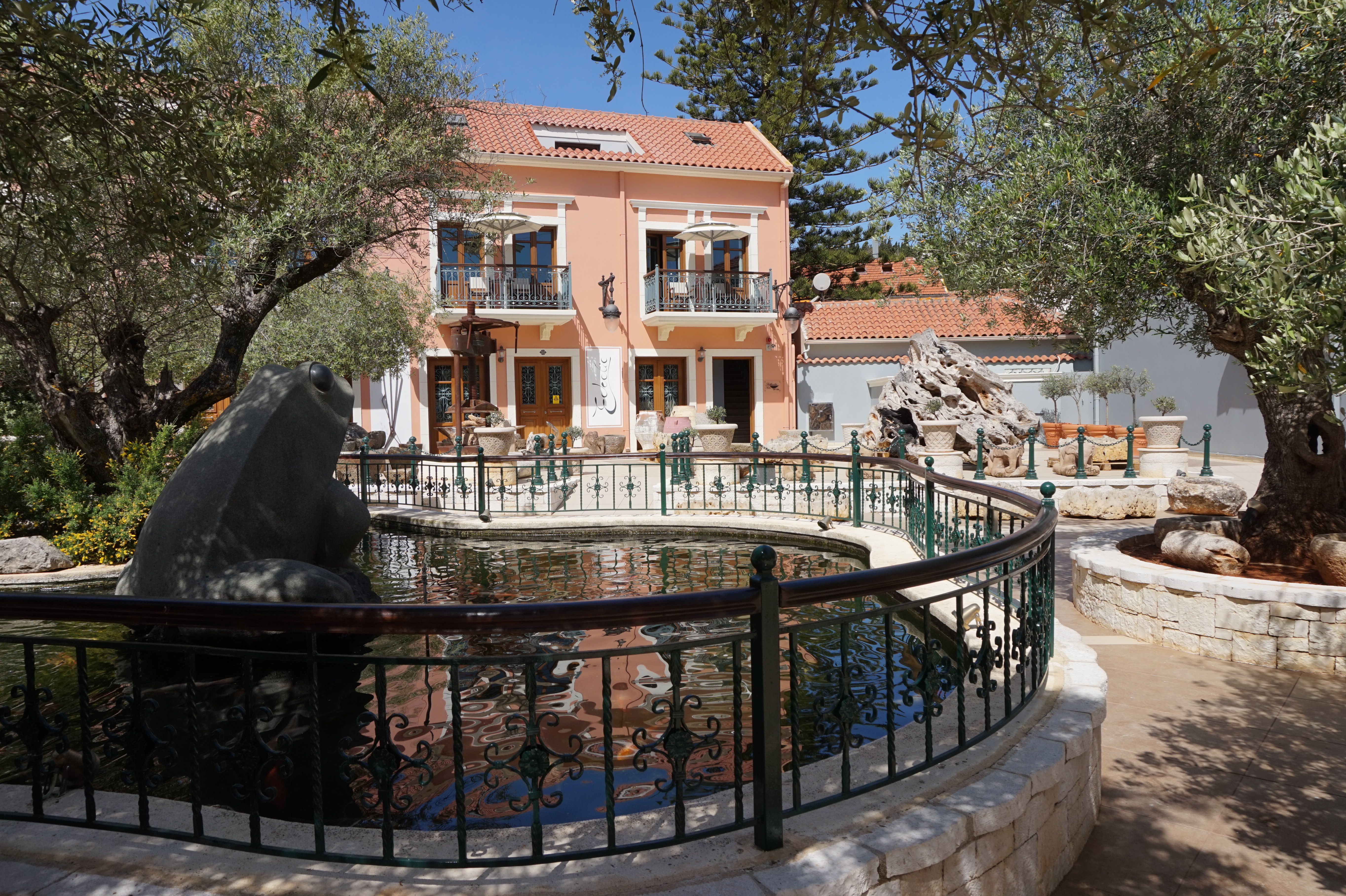 The Balhambra Suites is located centrally within Fiskardo, just 30m from the waterfront, within a piazza style environment complete with mature olive trees, lavender bushes and geraniums. The focal point of the piazza is a large Koi fishpond topped by Fiskardo’s newest landmark – a 2.5m tall green granite frog. The olive trees are complete with teak benches – perfect for an afternoon rest enjoying the surroundings.