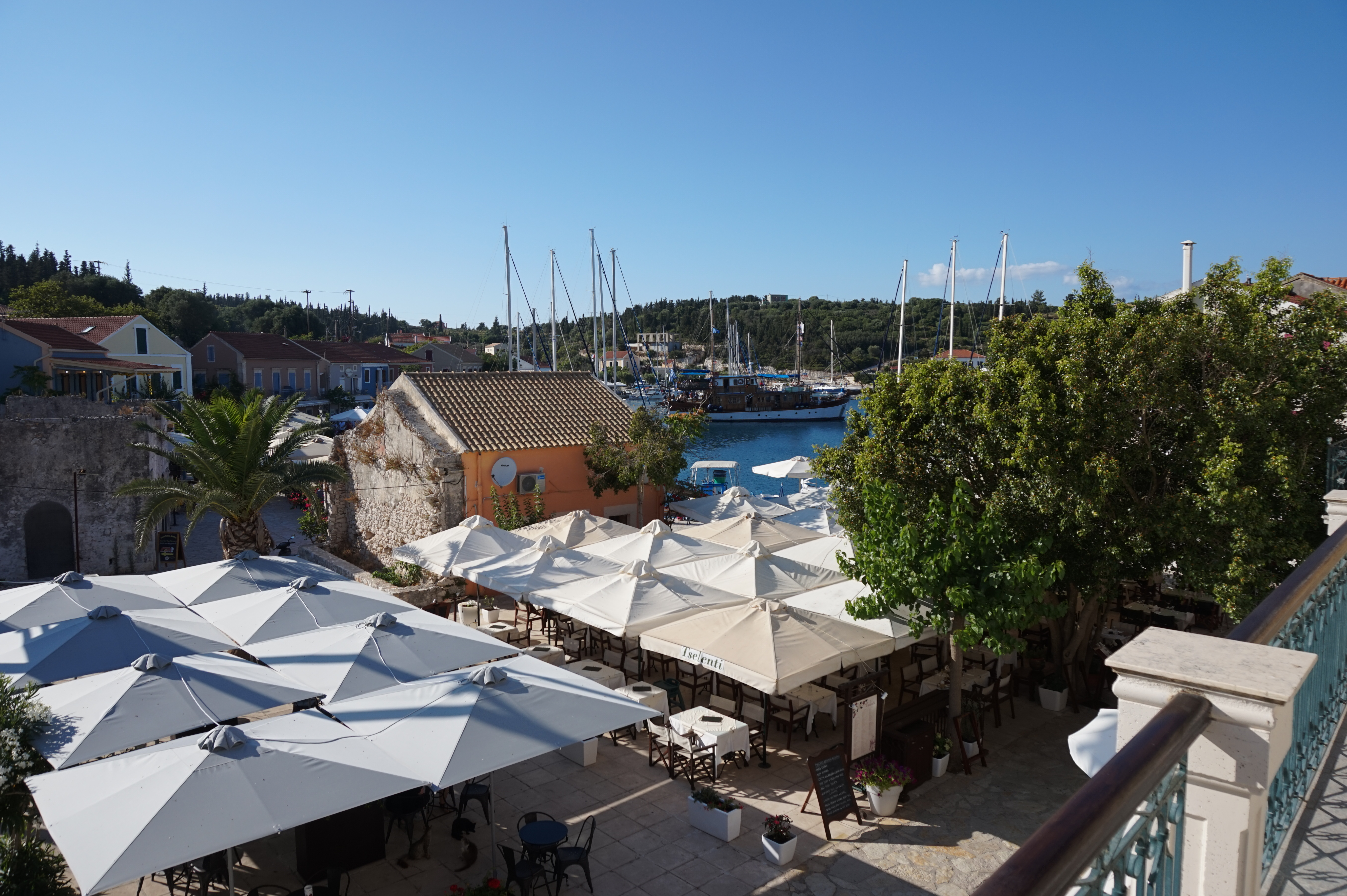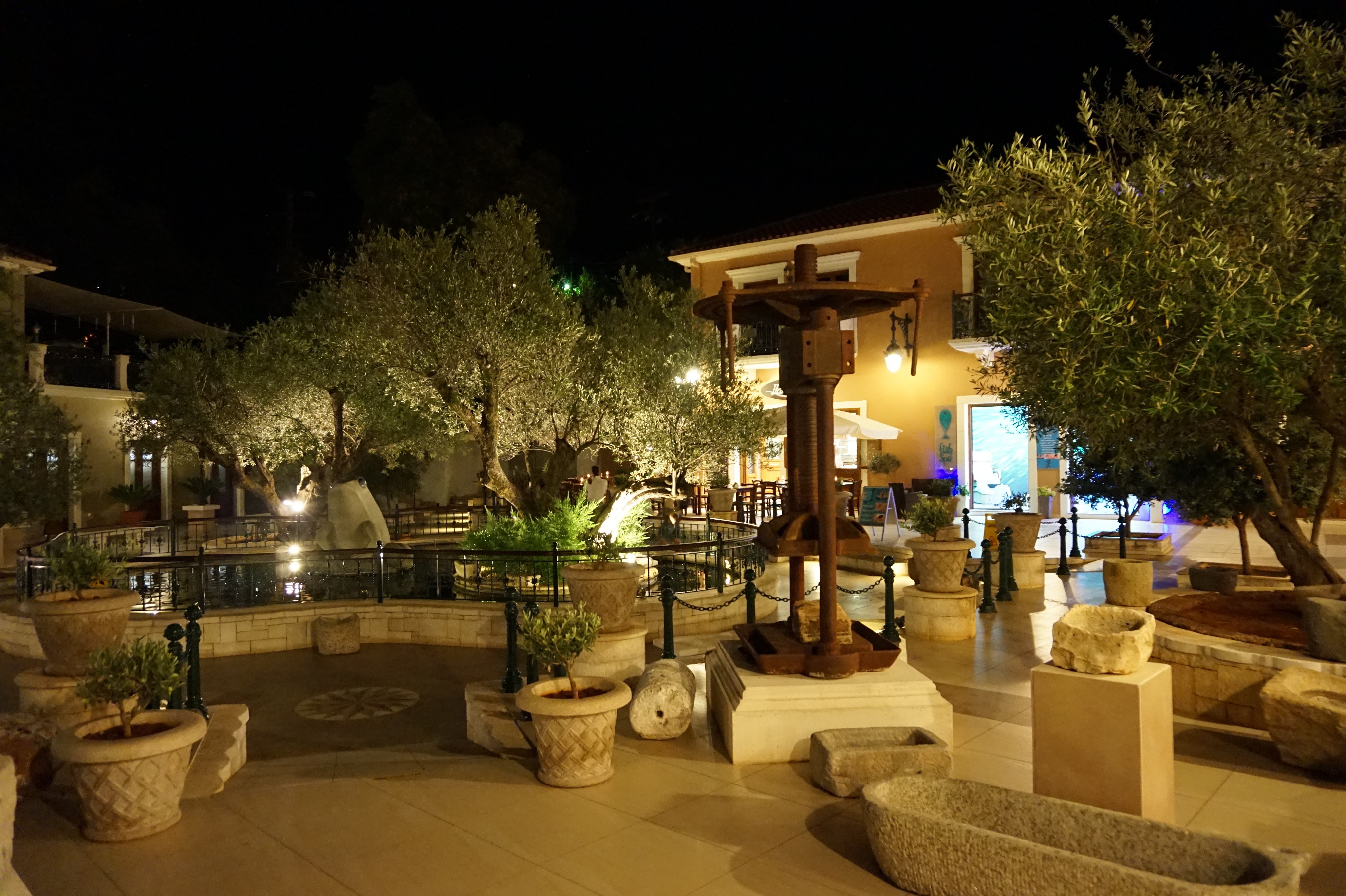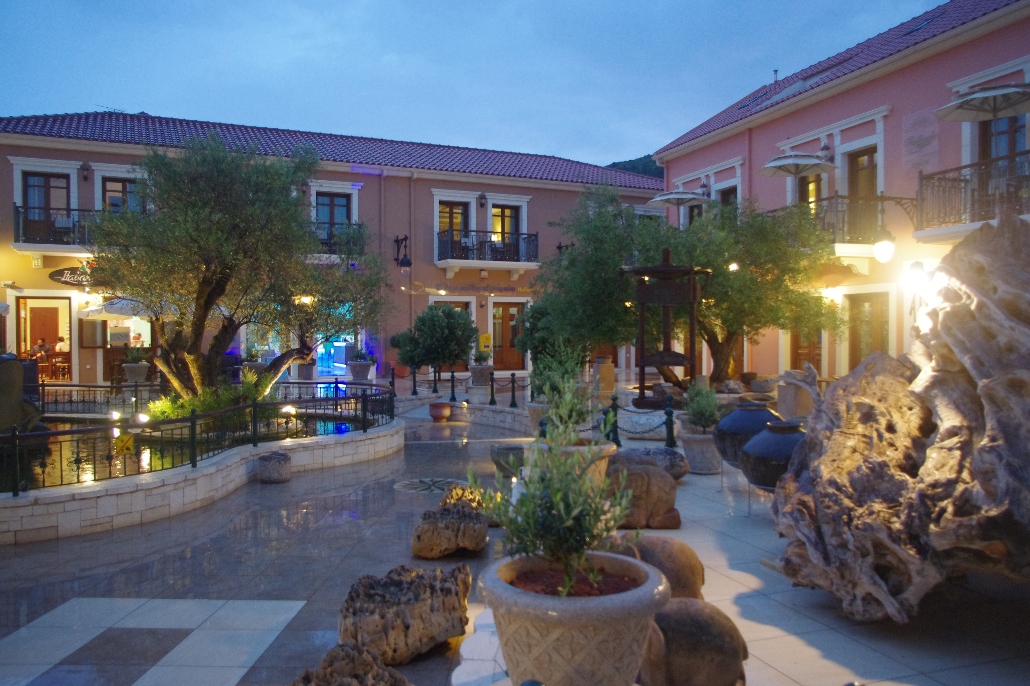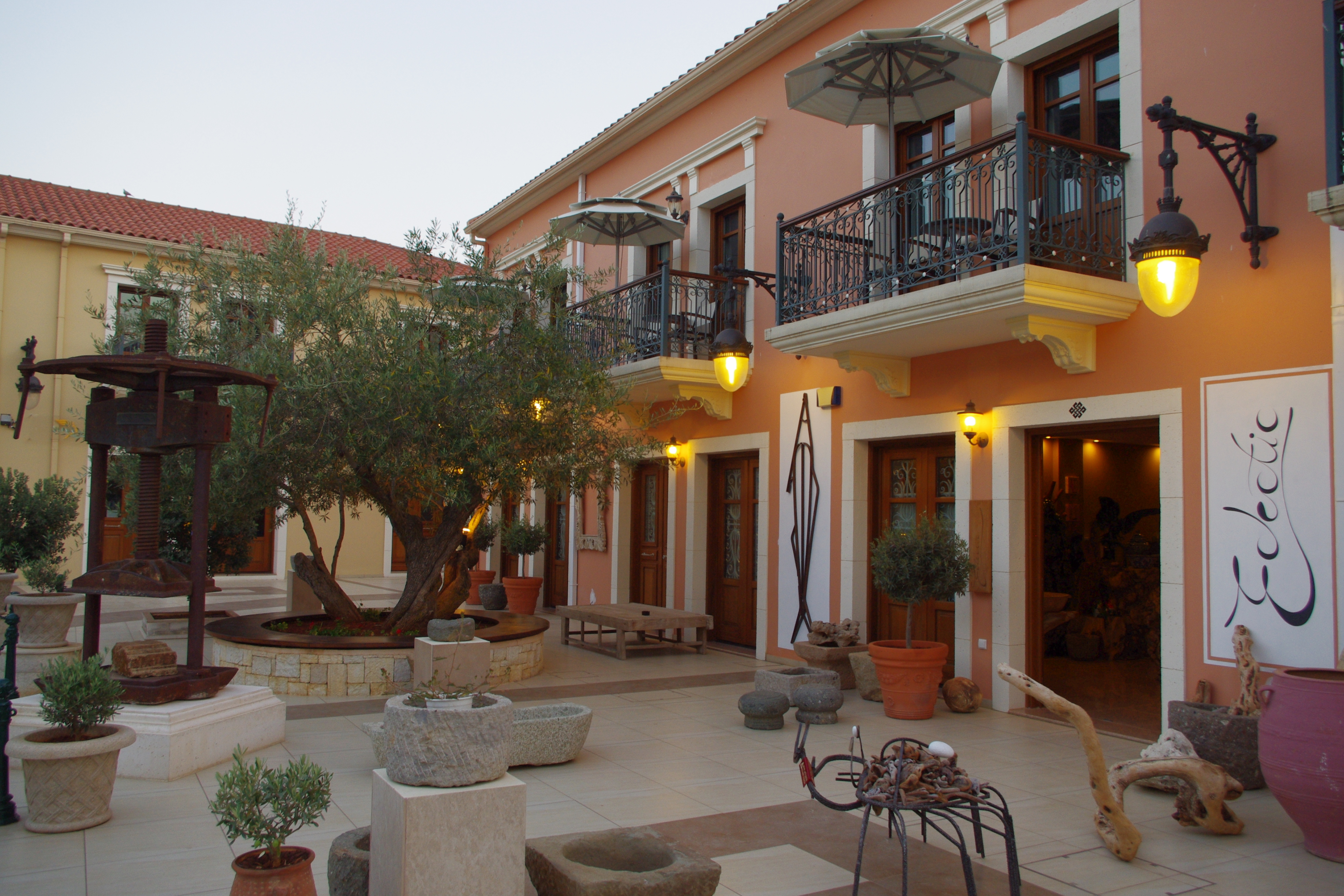 The Balhambra Suites is located centrally within Fiskardo, just 30m from the waterfront, within a piazza style environment complete with mature olive trees, lavender bushes and geraniums. The focal point of the piazza is a large Koi fishpond topped by Fiskardo’s newest landmark – a 2.5m tall green granite frog. The olive trees are complete with teak benches – perfect for an afternoon rest enjoying the surroundings.
