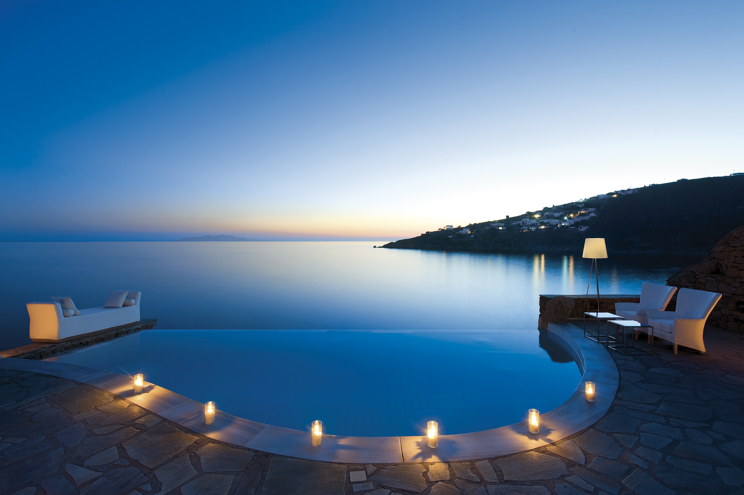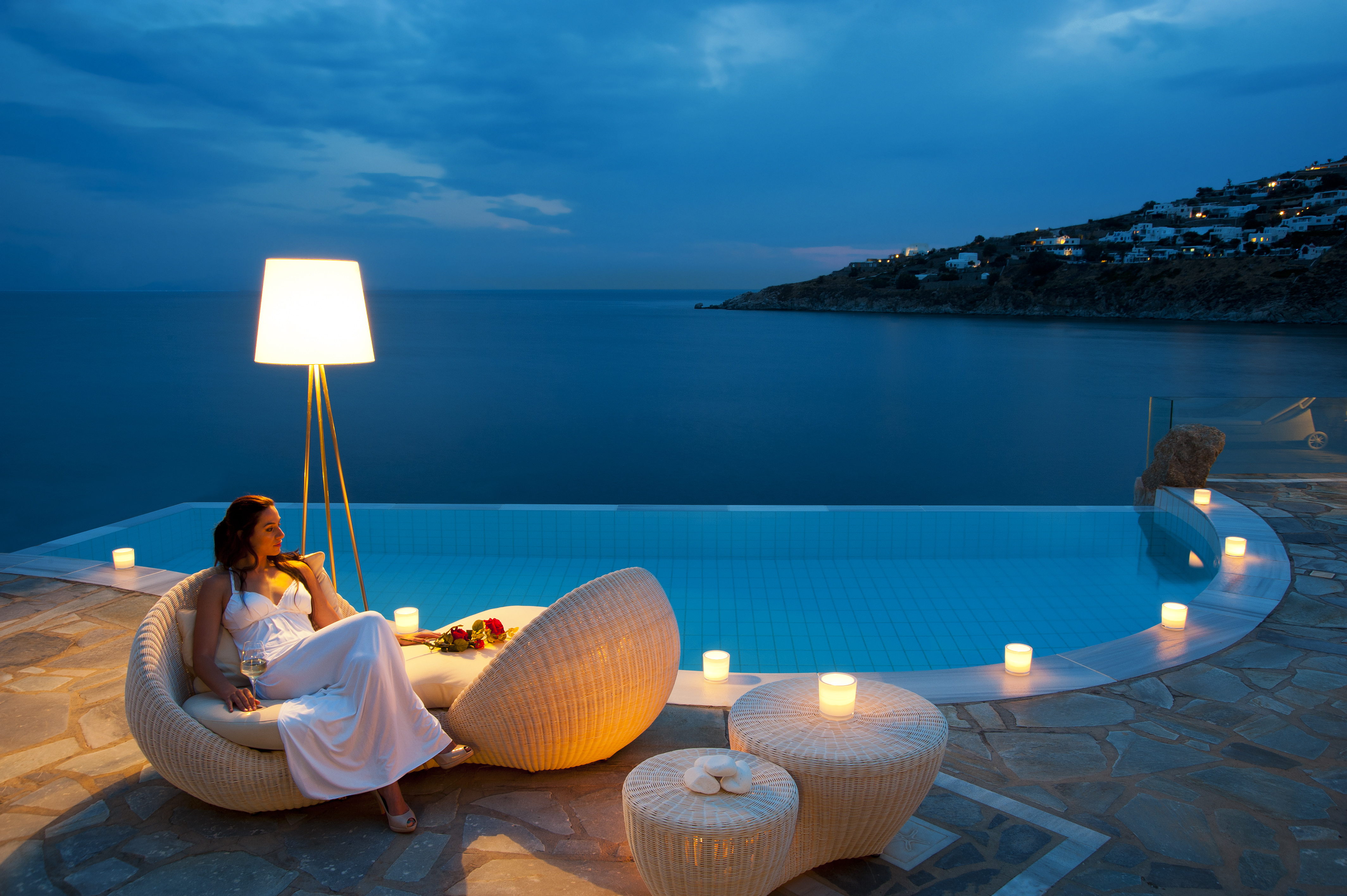 Platis Yialos beach, where water sports are available, is just a few minutes’ walk away, and the water taxis to Paradise, Super Paradise and Elia depart from a jetty directly below the hotel and the bus stop for the bright lights of Mykonos town, 3.5km distant, is just at the end of the drive.