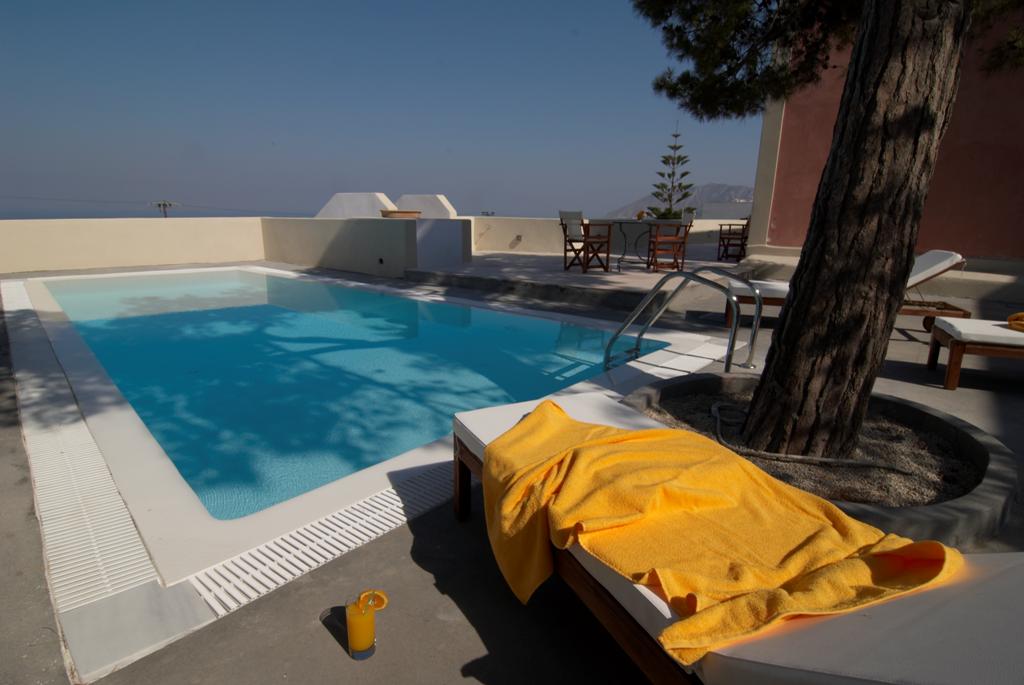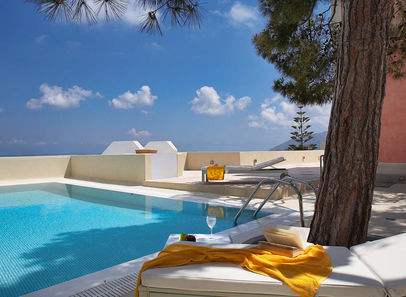 Superior suites contain either a queen size double or twin beds, a dining area with a sofa bed, bathroom with bathtub, and share a terrace with views to the sea and over the eastern side of Fira.