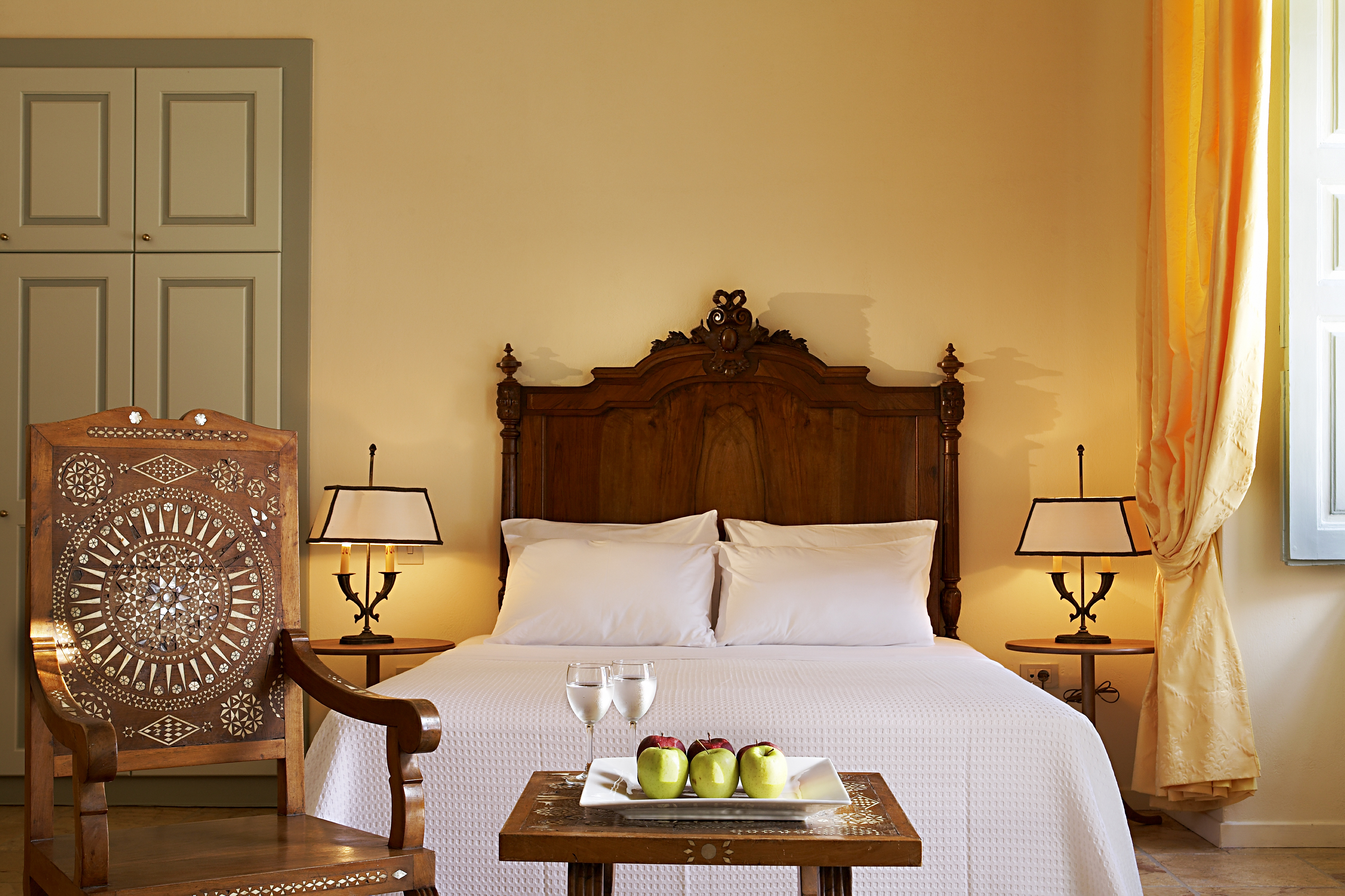 The Queen Suite is a spacious suite with impressive ceiling fresco, beautiful wooden furniture and hand picked pieces of art. The bedroom has a queen sized double and sitting area, there is a second separate sitting room with a sofa bed, a bathroom with bathtub and access to a shared terrace with distant sea views to the east.