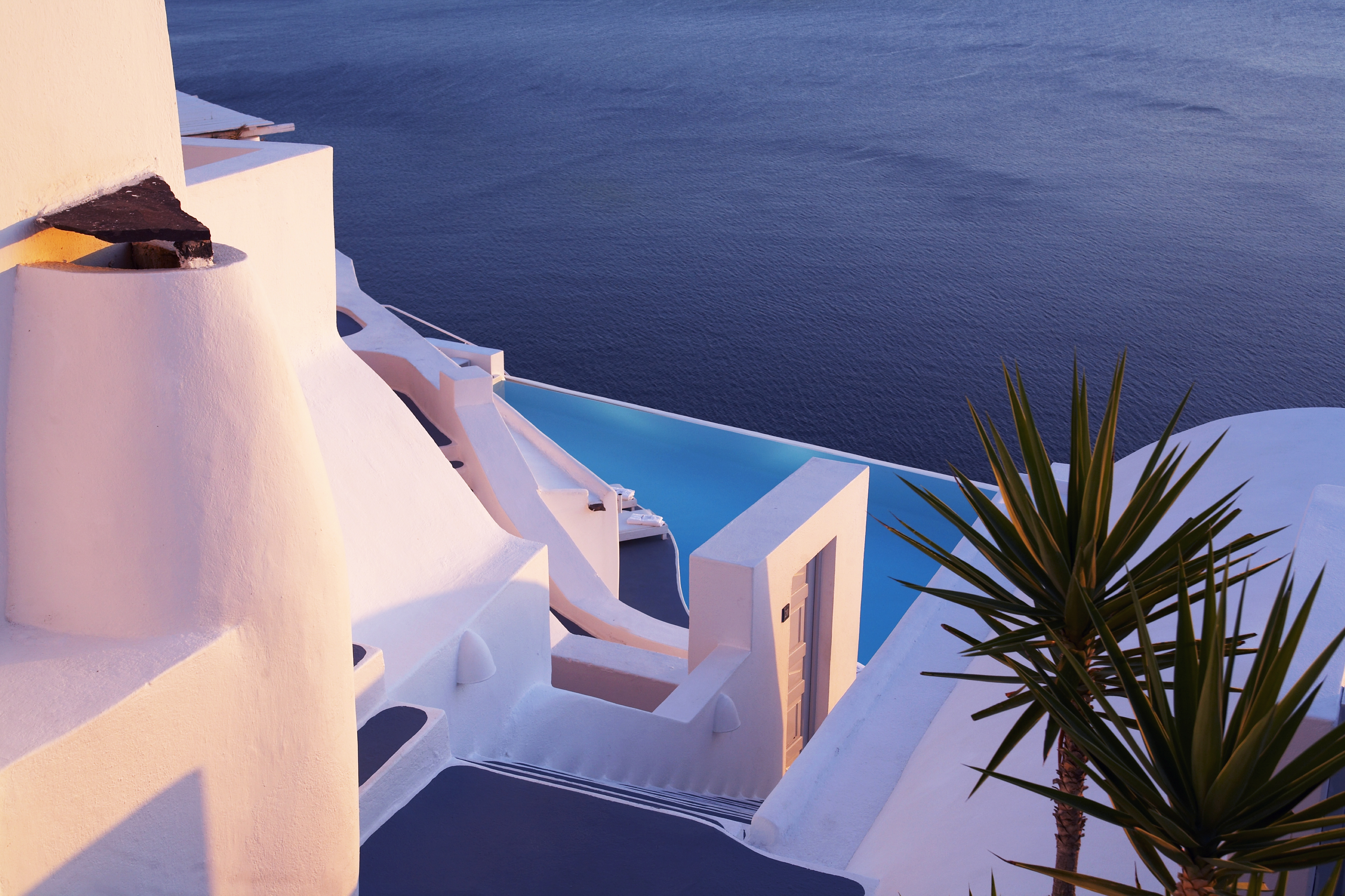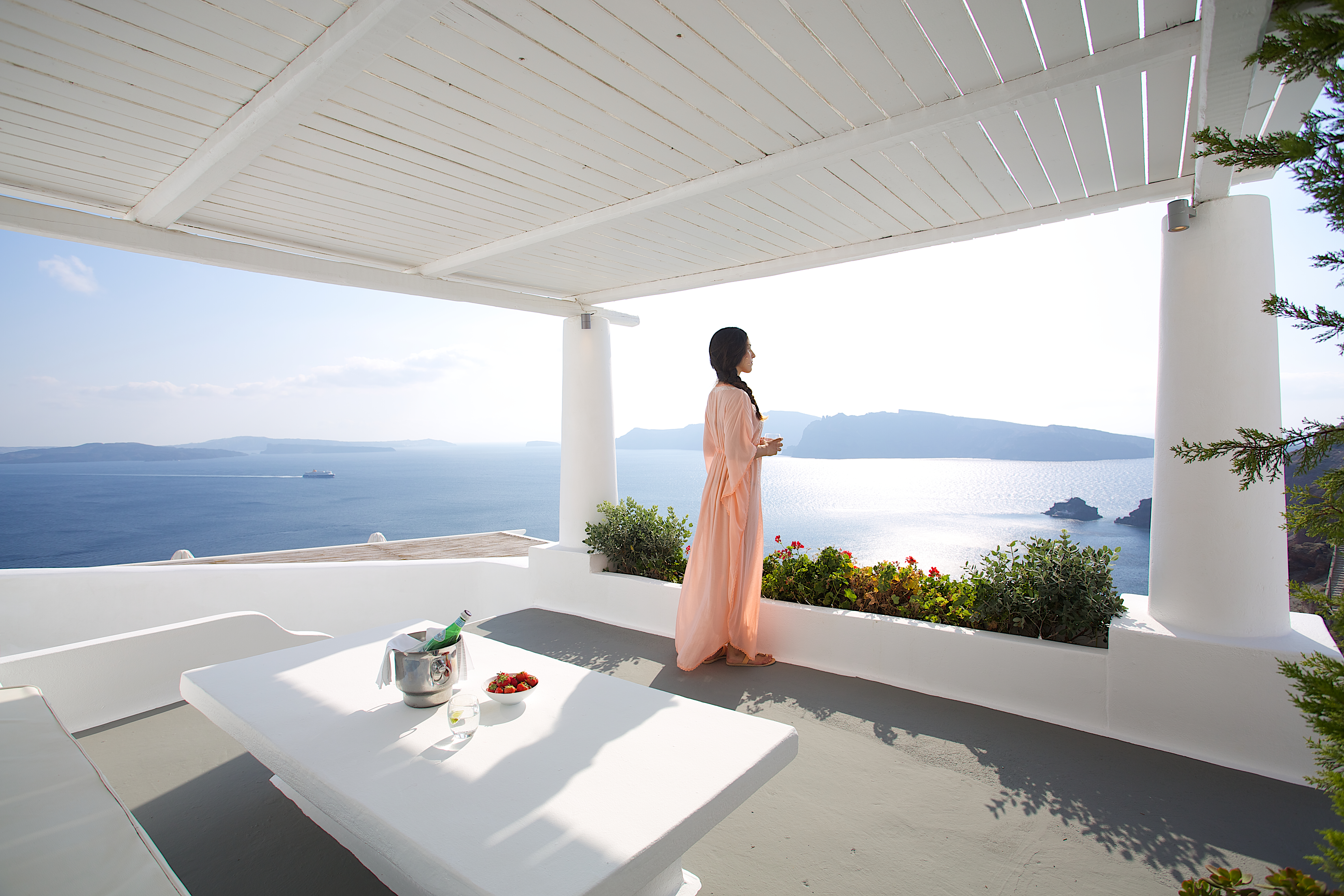 Junior suites are in hues of white and duck egg blue and offer elegant and soothing living and sleeping areas featuring lofty upper levels in some. Private terraces provide sensational Caldera views.