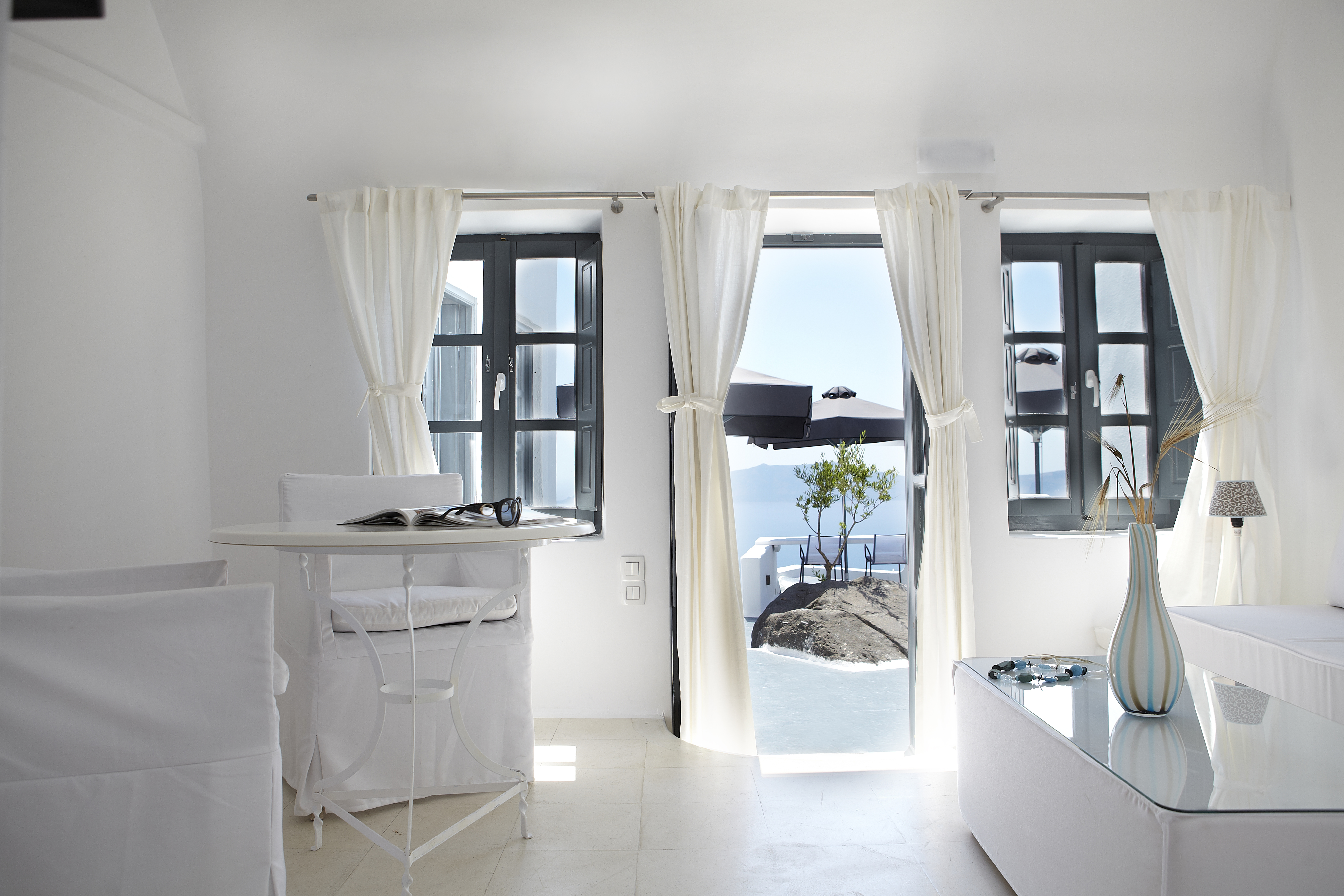 Both eclectic and international in feel, Caldera view rooms maintain however an aspect of their simple island life’s heritage and Cycladic architecture. Modern discrete touches combined with chandeliers from France, antique tables from Romania and Italian hand-made furniture throughout this accommodation, add to a romantically decadent luxurious feel.