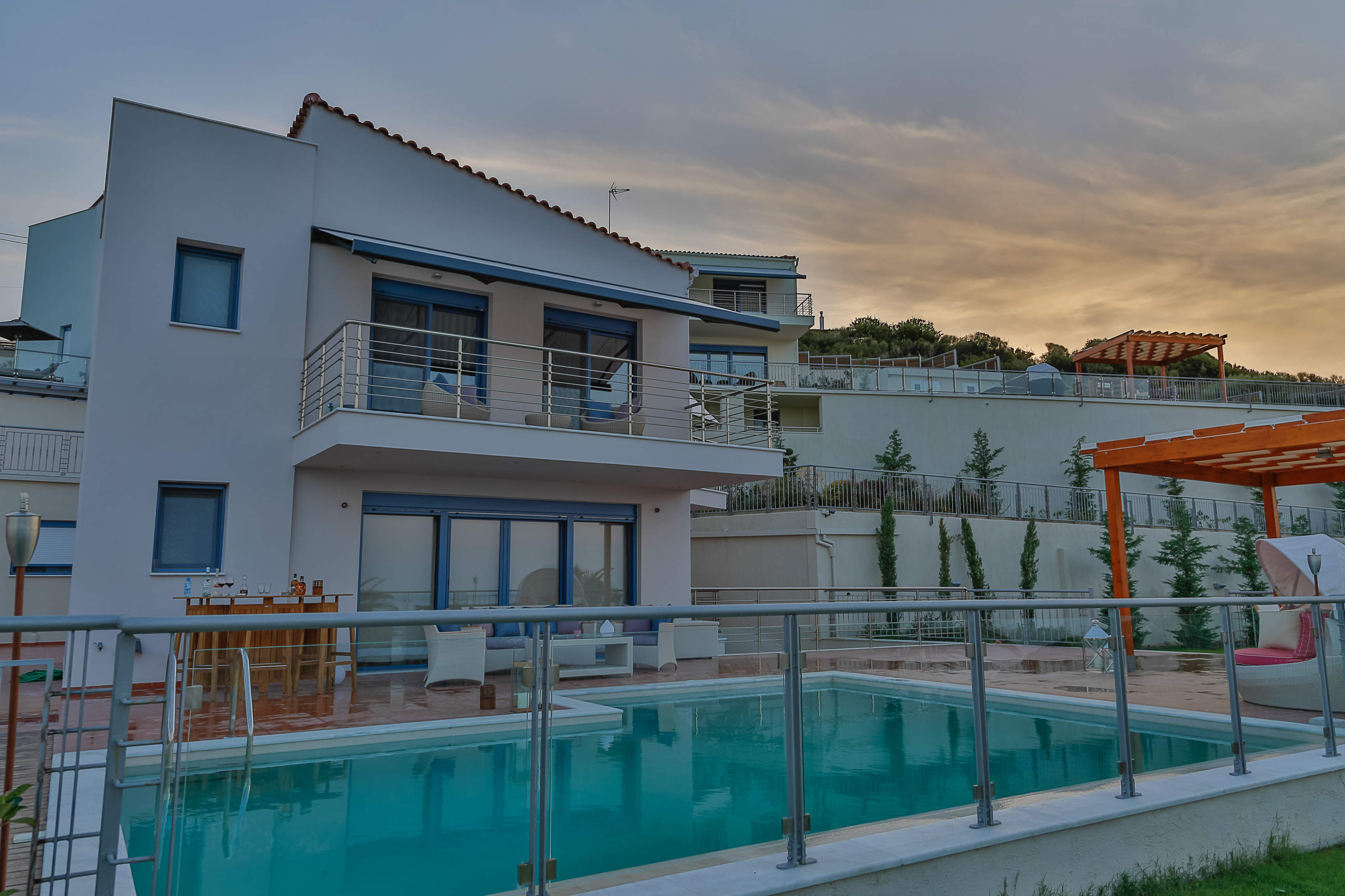 The luxury Aries Villas named Sagittarius, Leo and Capricorn are situated on the hillside just 5 minutes drive from Skiathos Town and the airport, Each of the private villas offer stunning panoramic sea views, with their own private pools and beautiful landscaped gardens for the ultimate VIP holiday experience. The villas are separated from each other, in such a way, keeping privacy and exclusivity intact. Each villa has been designed to have its own “personality”, fulfilling everyone’s accommodation desires. There is a communal gym for all properties to use.