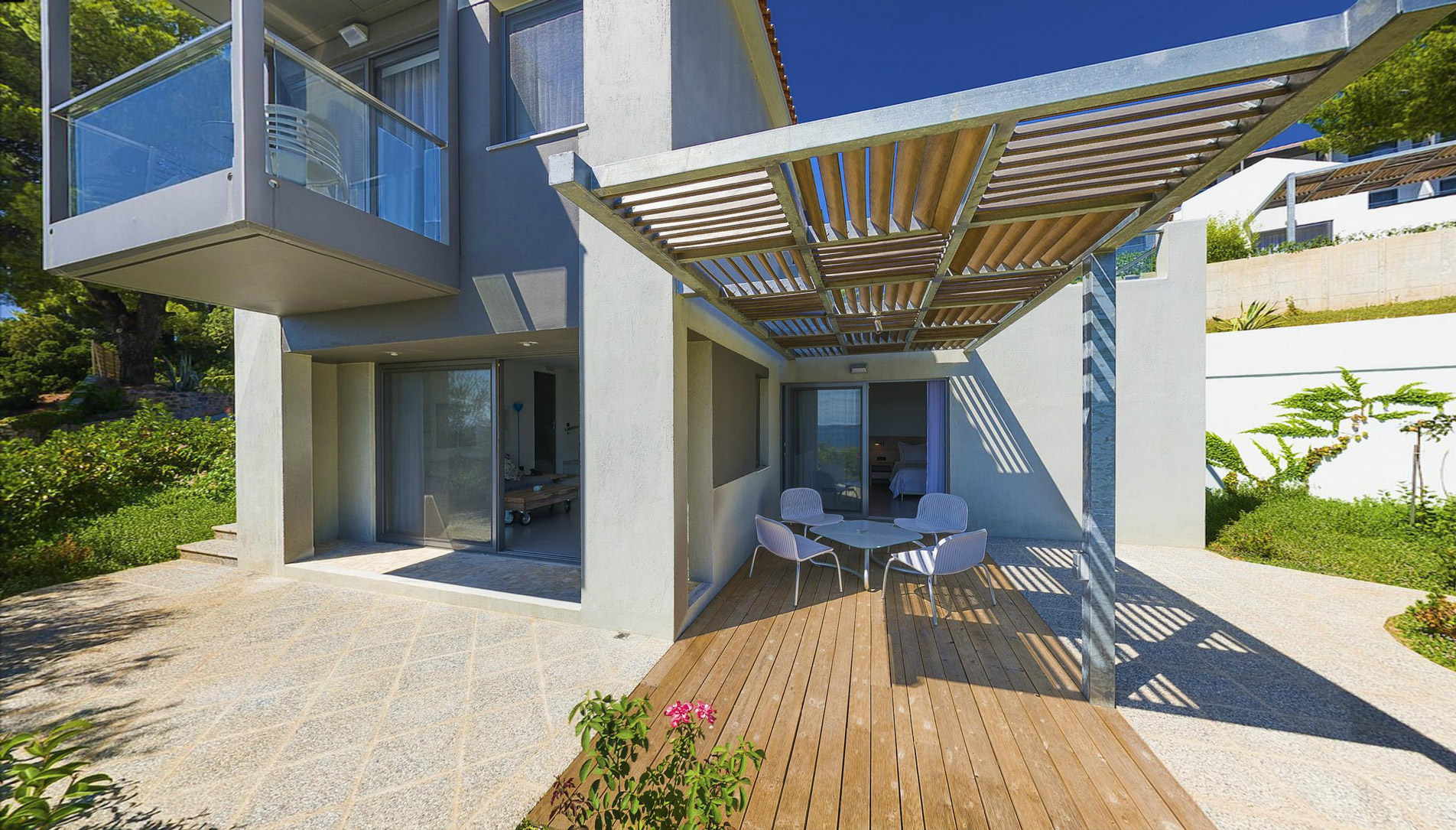 Rooms are fully equipped and all have a balcony or terrace with wonderful sea views. 5 of the villas have 1 bedroom, sitting room and 1 bathroom. 8 offer the addition of a further bathroom and are built over 2 floors. There are 6 2 bedroomed, 2 bathroom villas also over2 floors and for the ultimate in luxury there are 3 2 bedroomed, 2 bathroom villas with private swimming pools again over 2 floors.