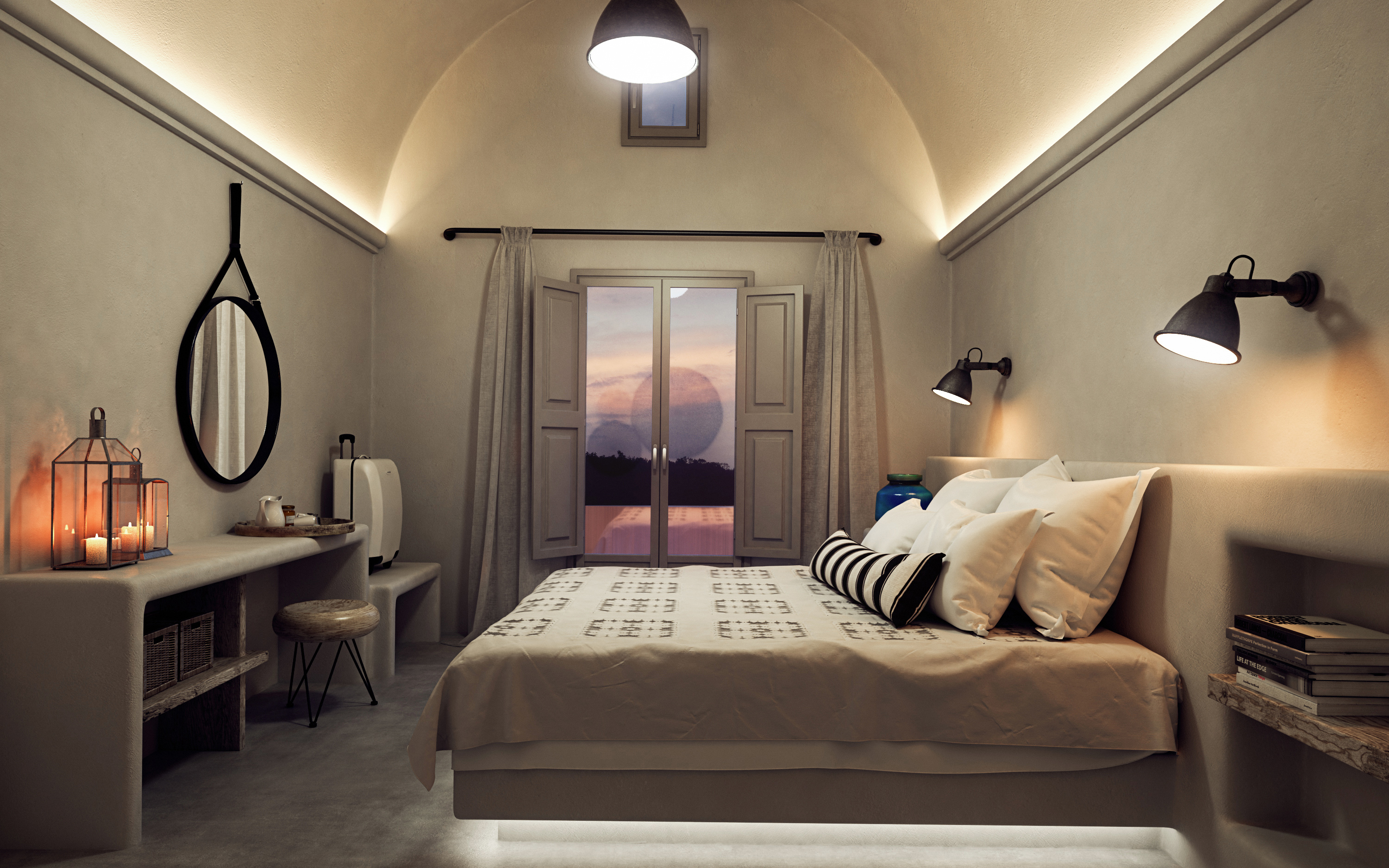 Junior Suites are suitable for up to 3 guests and offer a king sized bedroom with open plan living area, kitchenette area. All offer superb views over the Aegean. Suites are suitable for up to 4 guests and offer a bedroom, separate living area with a corner sofa that can be converted into 2 single beds and kitchenette area as well as sea views from the terrace. The luxury villas offer additional privacy and are comprised of 2 bedrooms, separate living room and kitchen and 2 bathrooms with bathrub. The ultimate is the private pool, Jacuzzi, gym and sauna. The 4 villas offer outstanding sunset views and a side view over the caldera.