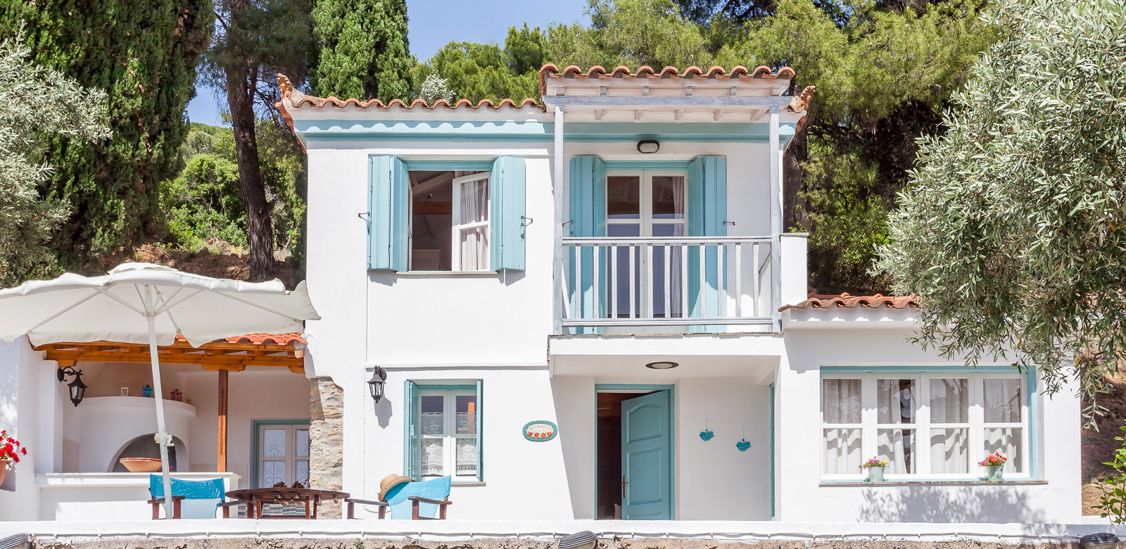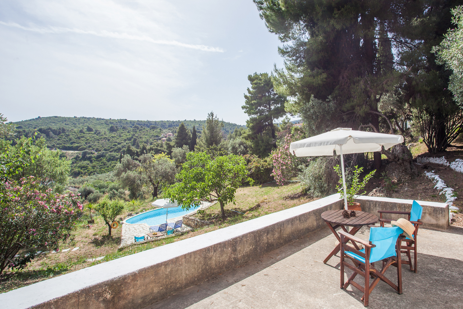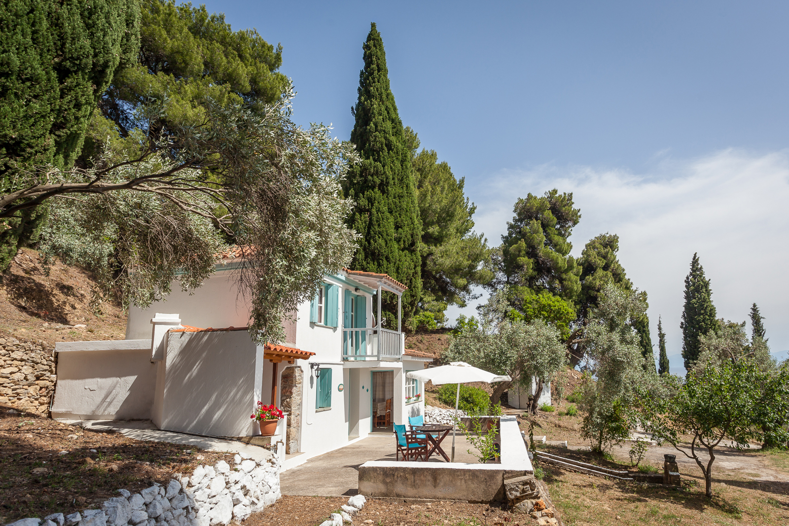 The cottage has large outdoor terraces from which to enjoy both sun and shade throughout the day. The built-in BBQ/outdoor kitchen is set next to the main house which is surrounded by cypress trees through which there is a convenient path leading to the main Stafilos road. The private pool sits just below the cottage.