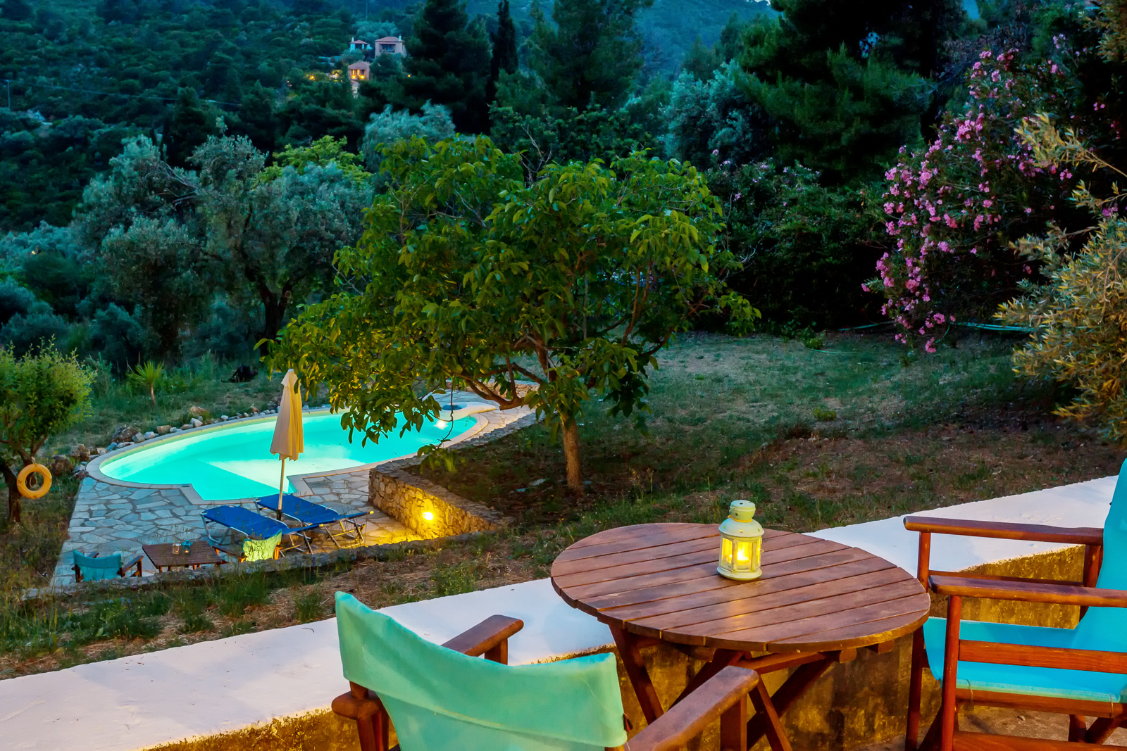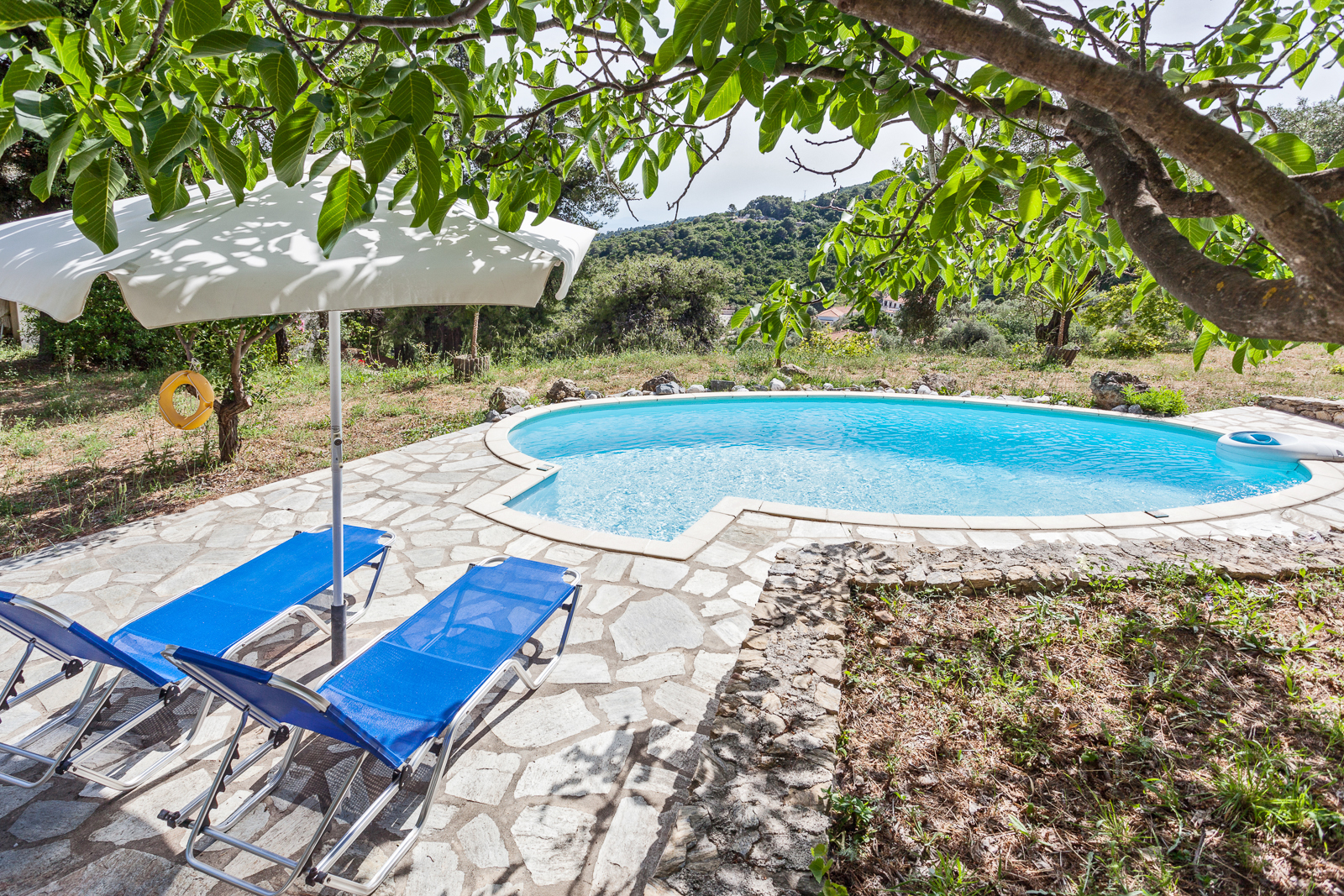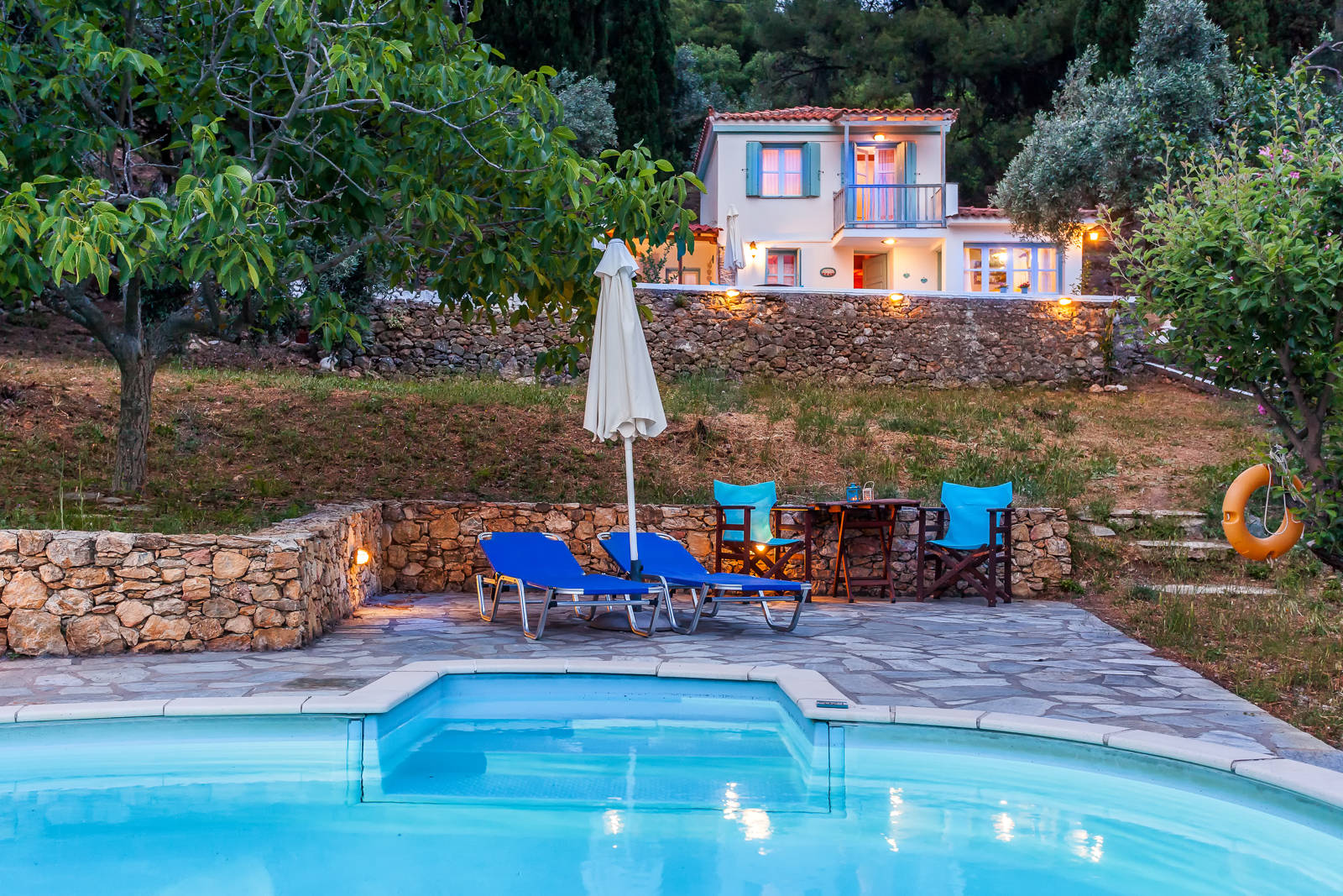 The cottage has large outdoor terraces from which to enjoy both sun and shade throughout the day. The built-in BBQ/outdoor kitchen is set next to the main house which is surrounded by cypress trees through which there is a convenient path leading to the main Stafilos road. The private pool sits just below the cottage.