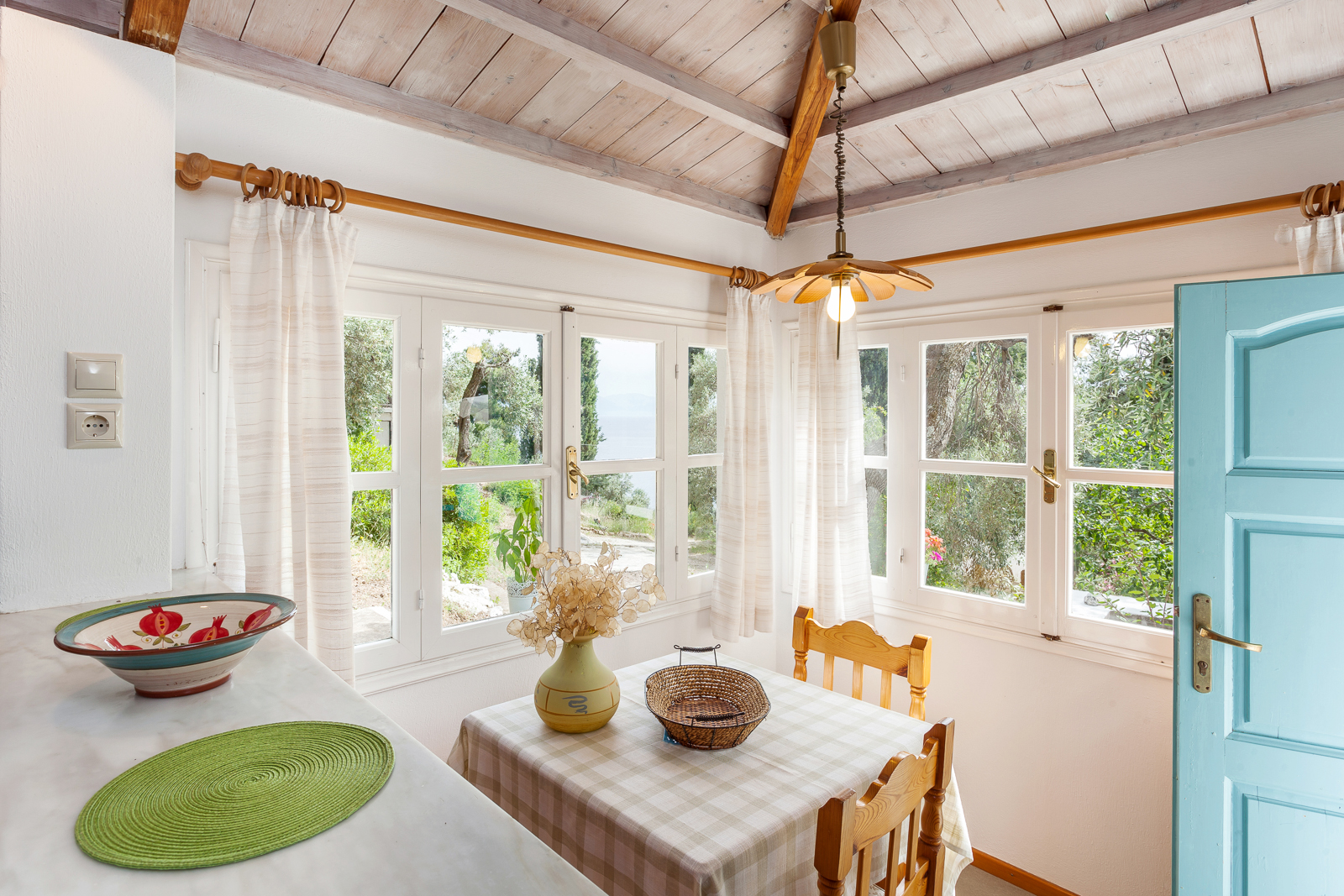The small kitchen/dining room has a separate entrance with a lovely breakfast table surrounded by windows. The small kitchenette is equipped for simple holiday meals and still has the original bread oven (now for decoration only).