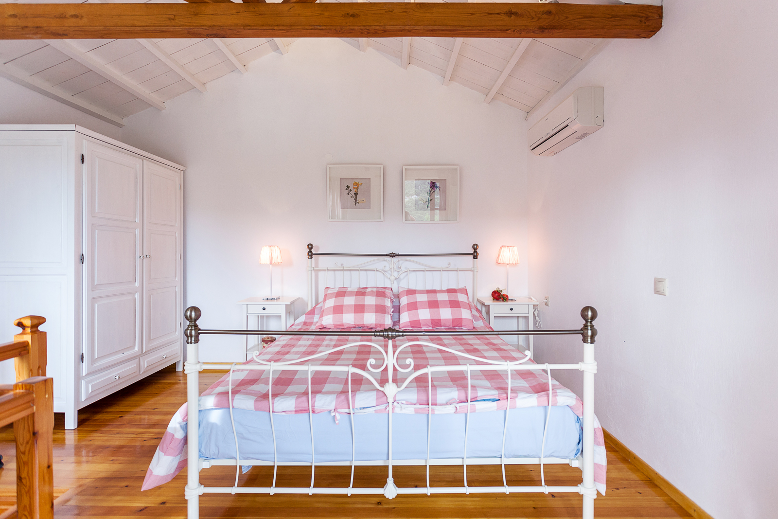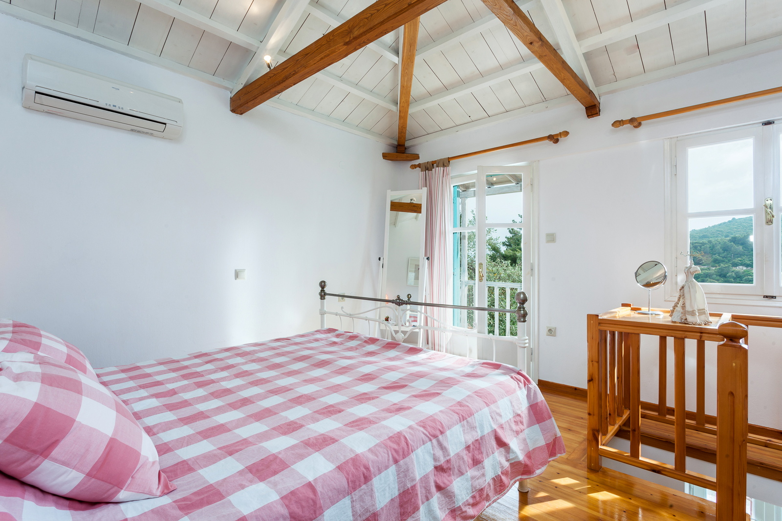 Wooden stairs lead from the sitting room to the bedroom which has a double bed. It is light and airy with open beamed ceilings and pine wood floors and has a small balcony from which to enjoy the amazing views.