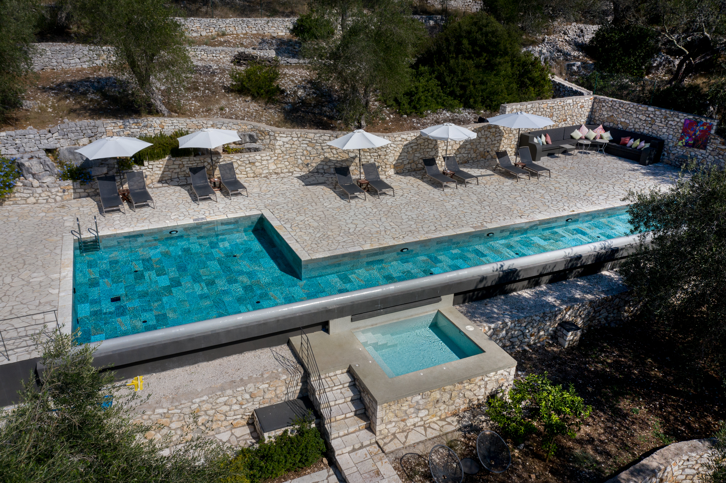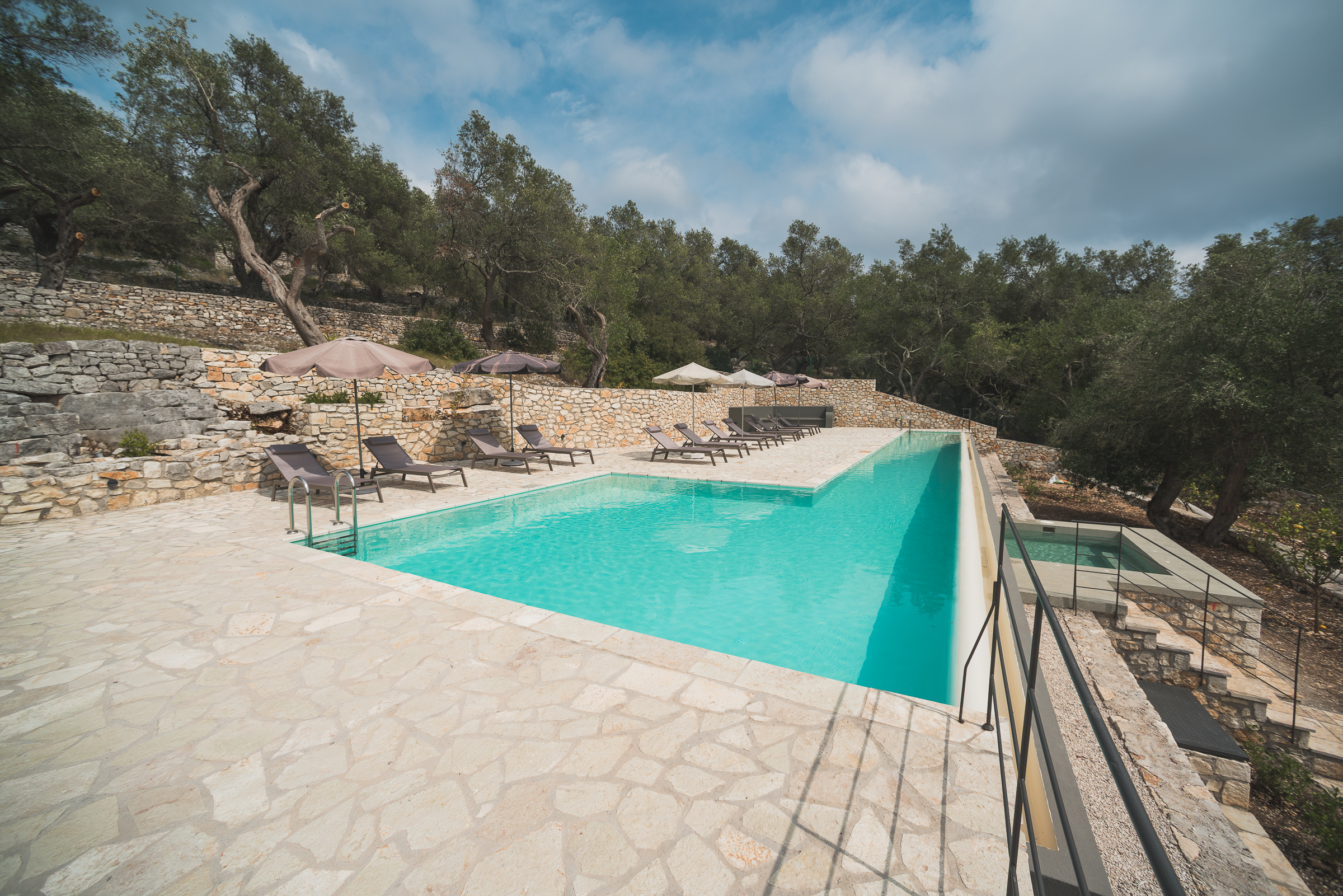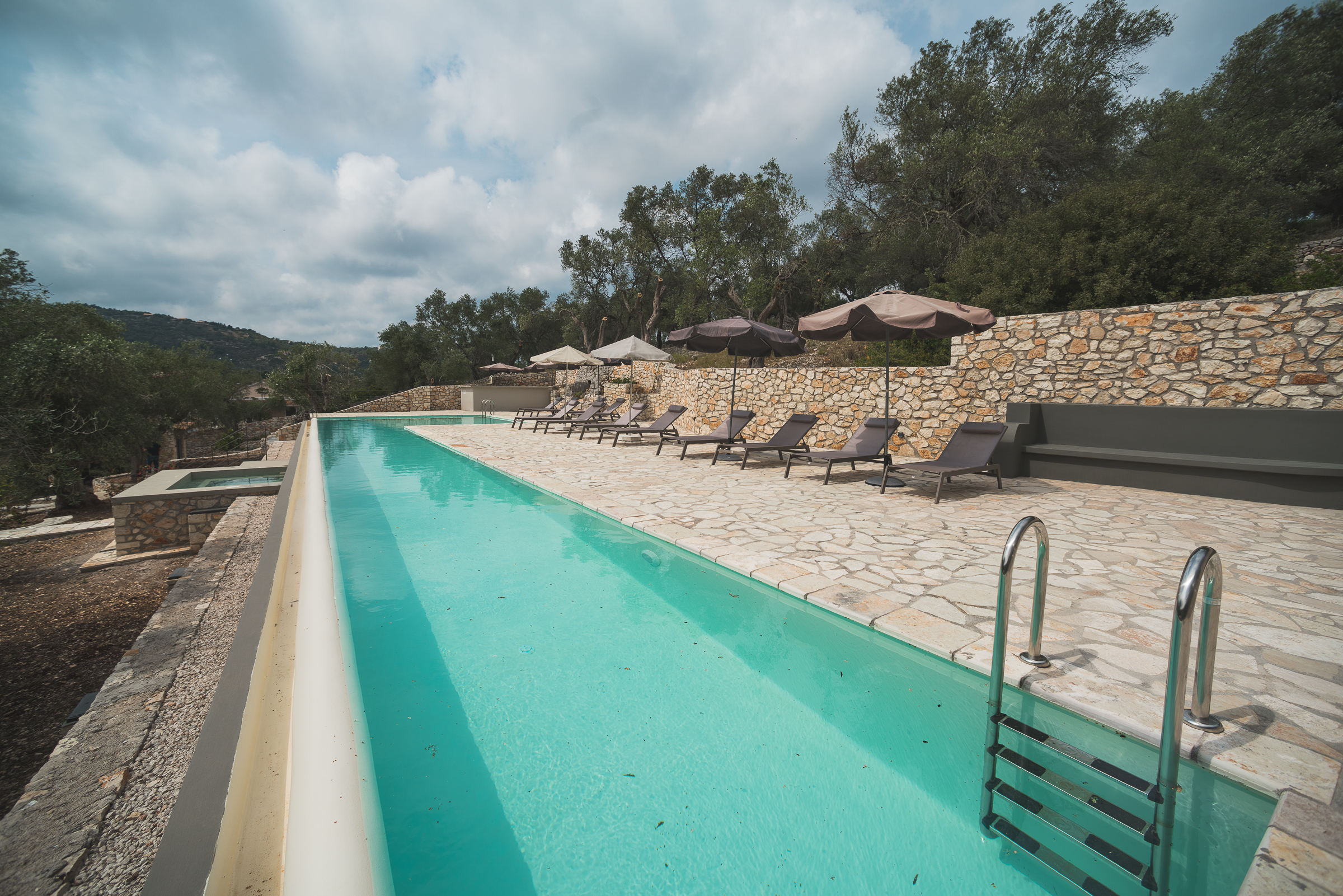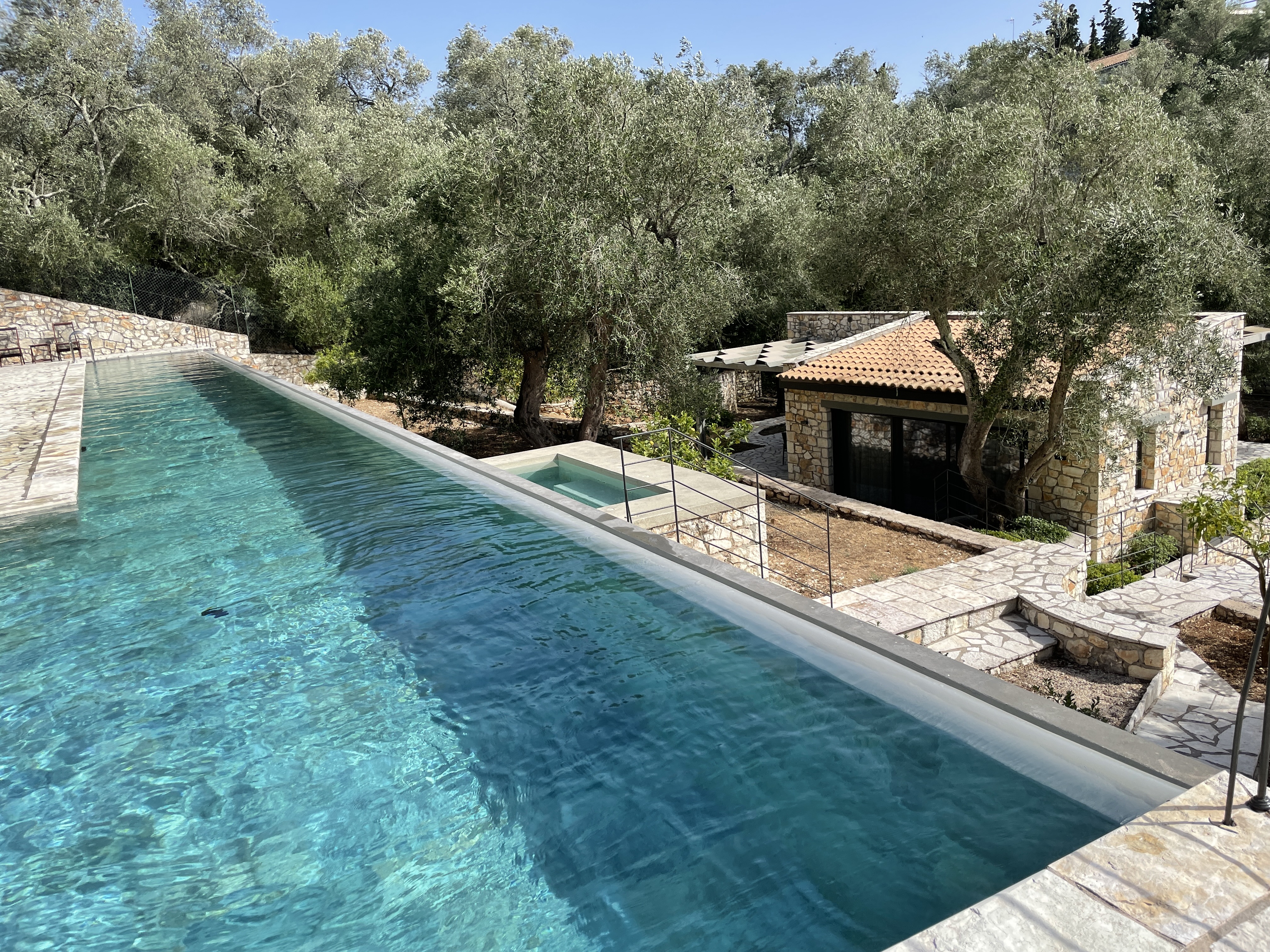 Outside the shrubs and olive trees provide shaded areas in gardens which lead to the beautiful elevated shared swimming pool, for the enthusiastic the shape is perfect for lap swimming, The Jacuzzi and sun loungers are inviting for a relaxing experience.