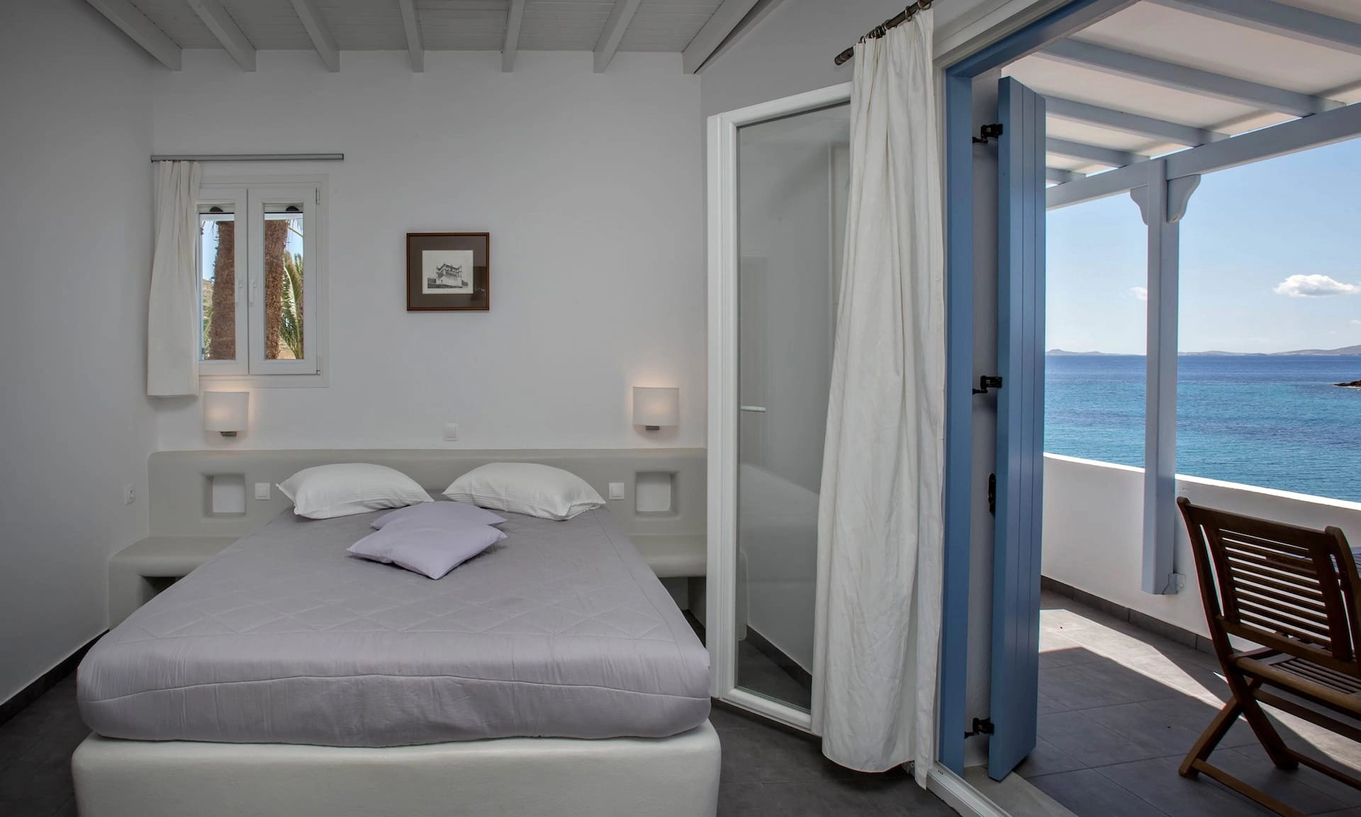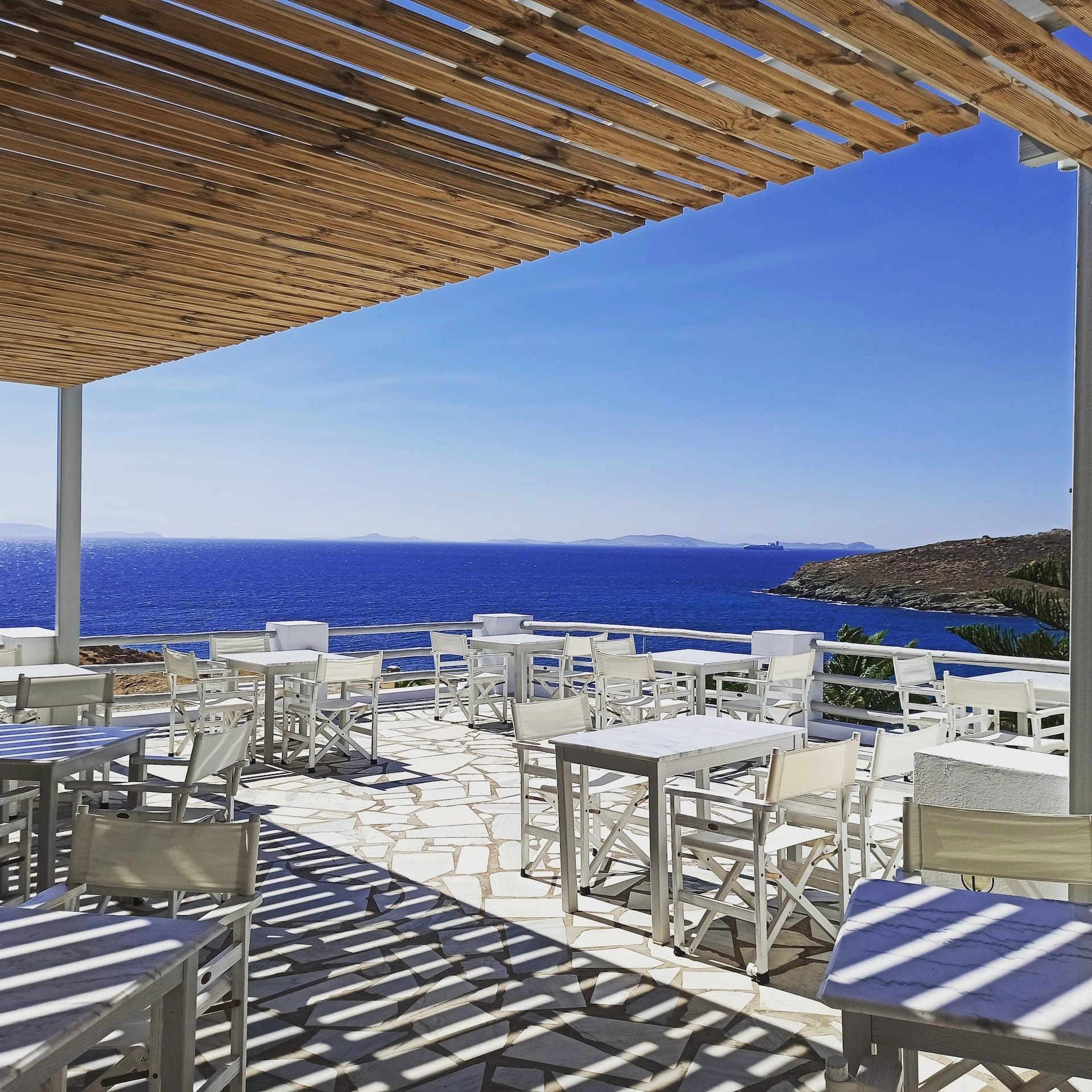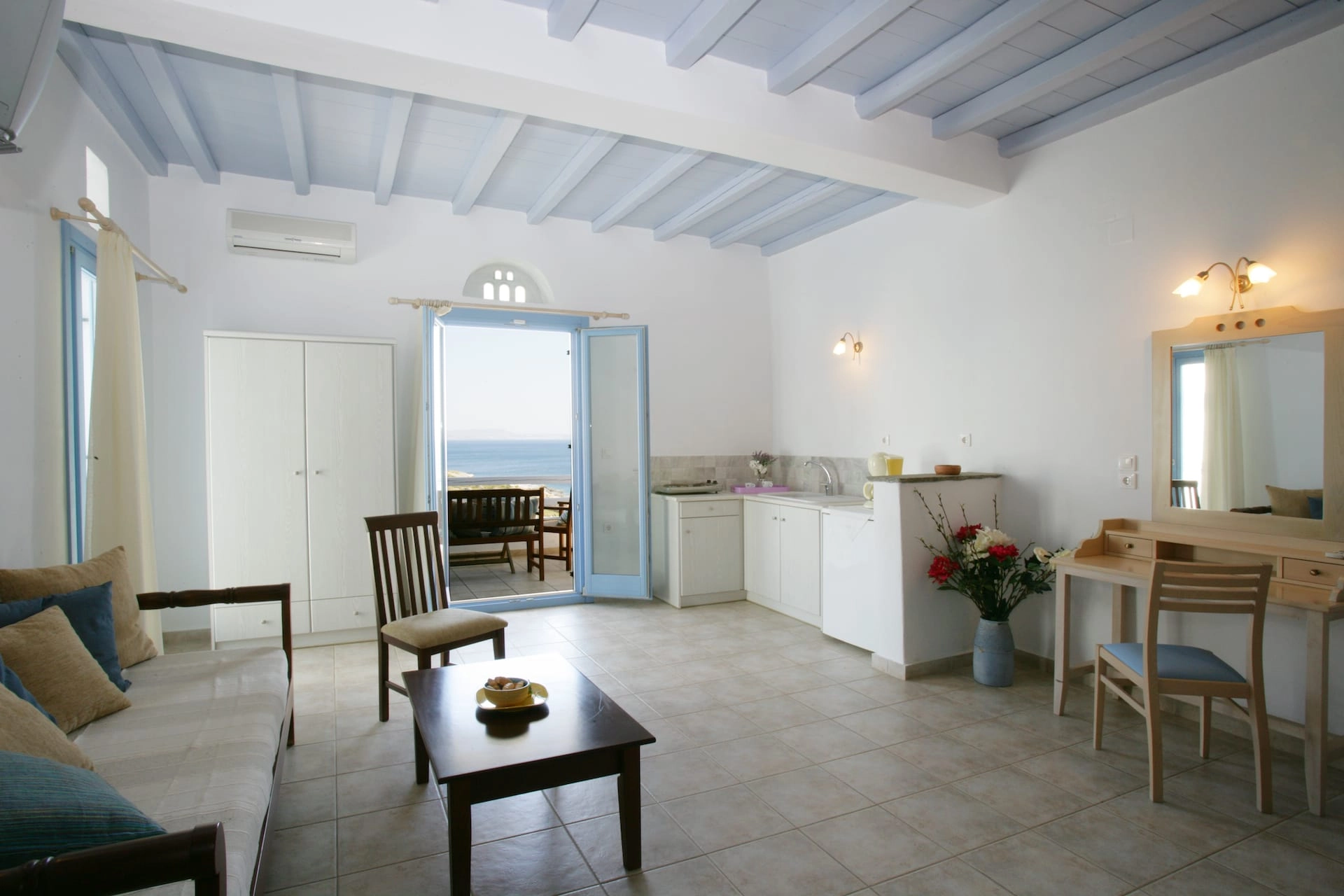 Superior double rooms are suitable for up to 2 guests and offer balcony or terrace with sea view. Cyclades Junior Suites have a separate kitchenette area with built in sofa for a 3rd person which leads out to a balcony or terrace with sea views over to Mykonos and Delos. The 7 Islands Suites are aptly named offering panoramic sea views over the neighbouring islands. Suitable for up to 3 guests they are comprised of the bedroom, separate kitchenette/living area and outdoor dining area on the terrace. The tastefully decorated yet relaxed Family Residences suitable for up to 4 are comprised of 2 bedrooms, kitchenette and balcony or terrace with outdoor dining area and sea views. The uniqute Maisonette is perfect for families – being suitable for up to 4 guests and having 2 en-suite bedrooms, fully equipped kitchenette, and living area as well a large terrace with outdoor dining area and superb sea views. All rooms are also equipped with LCD TV, direct dial telephone, fridge, hairdrier, bathrooms, and wifi internet access. Eight of the suites offer step-free access.