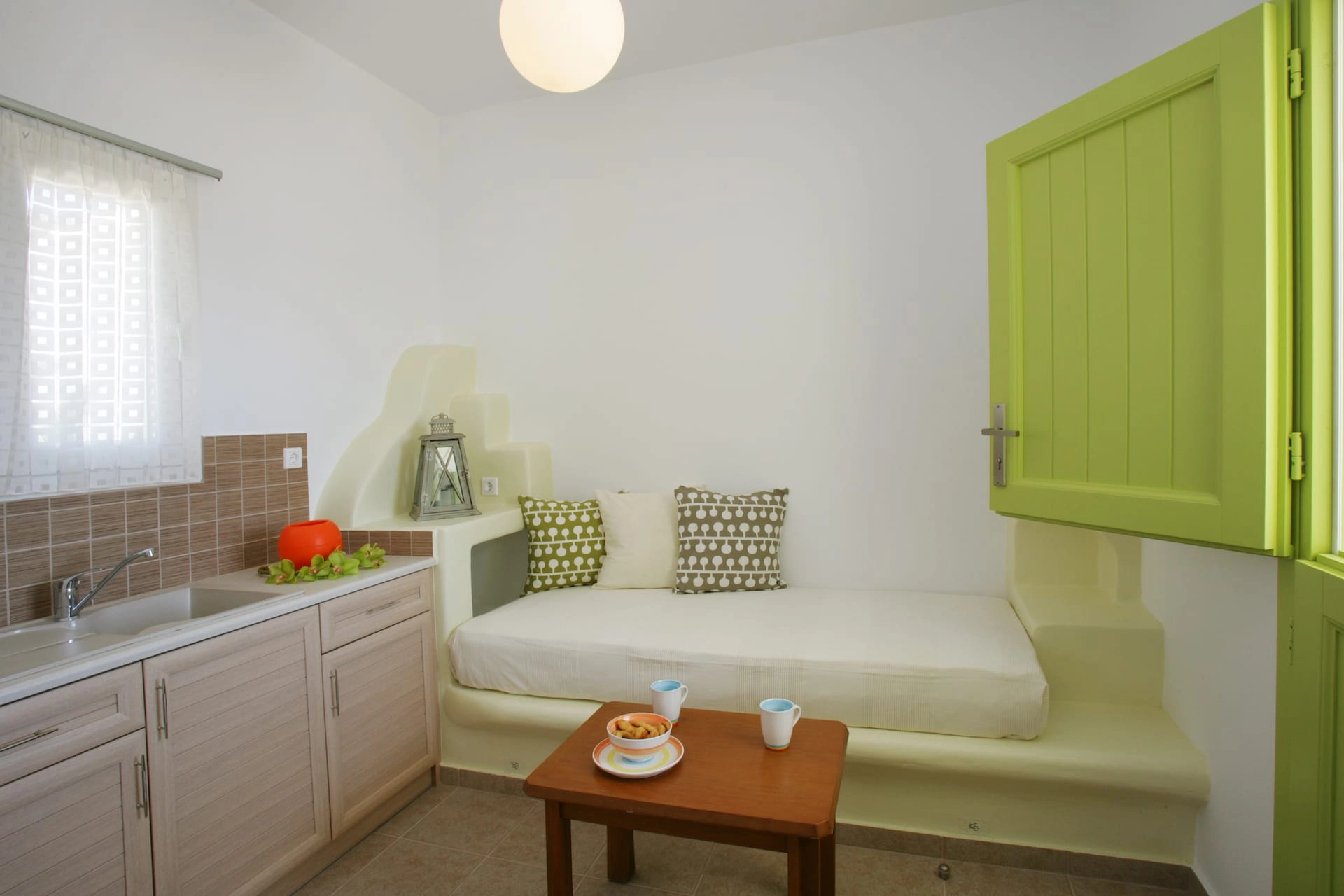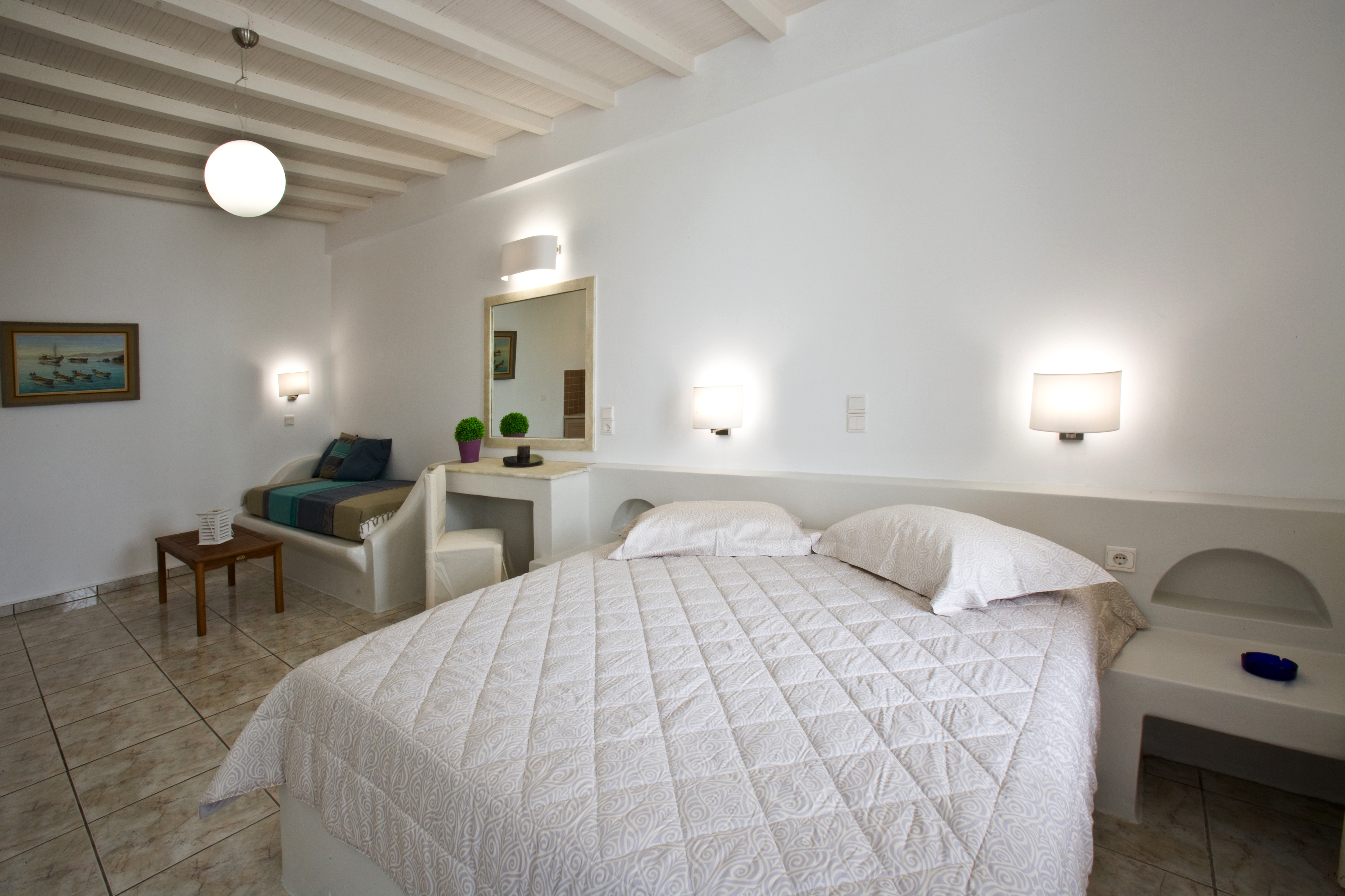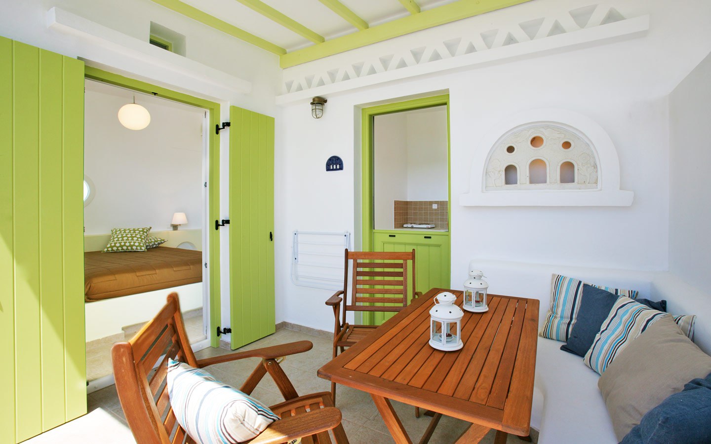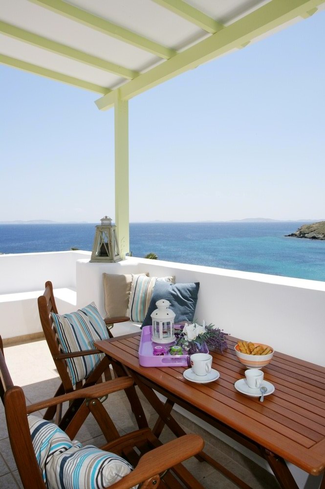 Superior double rooms are suitable for up to 2 guests and offer balcony or terrace with sea view. Cyclades Junior Suites have a separate kitchenette area with built in sofa for a 3rd person which leads out to a balcony or terrace with sea views over to Mykonos and Delos. The 7 Islands Suites are aptly named offering panoramic sea views over the neighbouring islands. Suitable for up to 3 guests they are comprised of the bedroom, separate kitchenette/living area and outdoor dining area on the terrace. The tastefully decorated yet relaxed Family Residences suitable for up to 4 are comprised of 2 bedrooms, kitchenette and balcony or terrace with outdoor dining area and sea views. The uniqute Maisonette is perfect for families – being suitable for up to 4 guests and having 2 en-suite bedrooms, fully equipped kitchenette, and living area as well a large terrace with outdoor dining area and superb sea views. All rooms are also equipped with LCD TV, direct dial telephone, fridge, hairdrier, bathrooms, and wifi internet access. Eight of the suites offer step-free access.