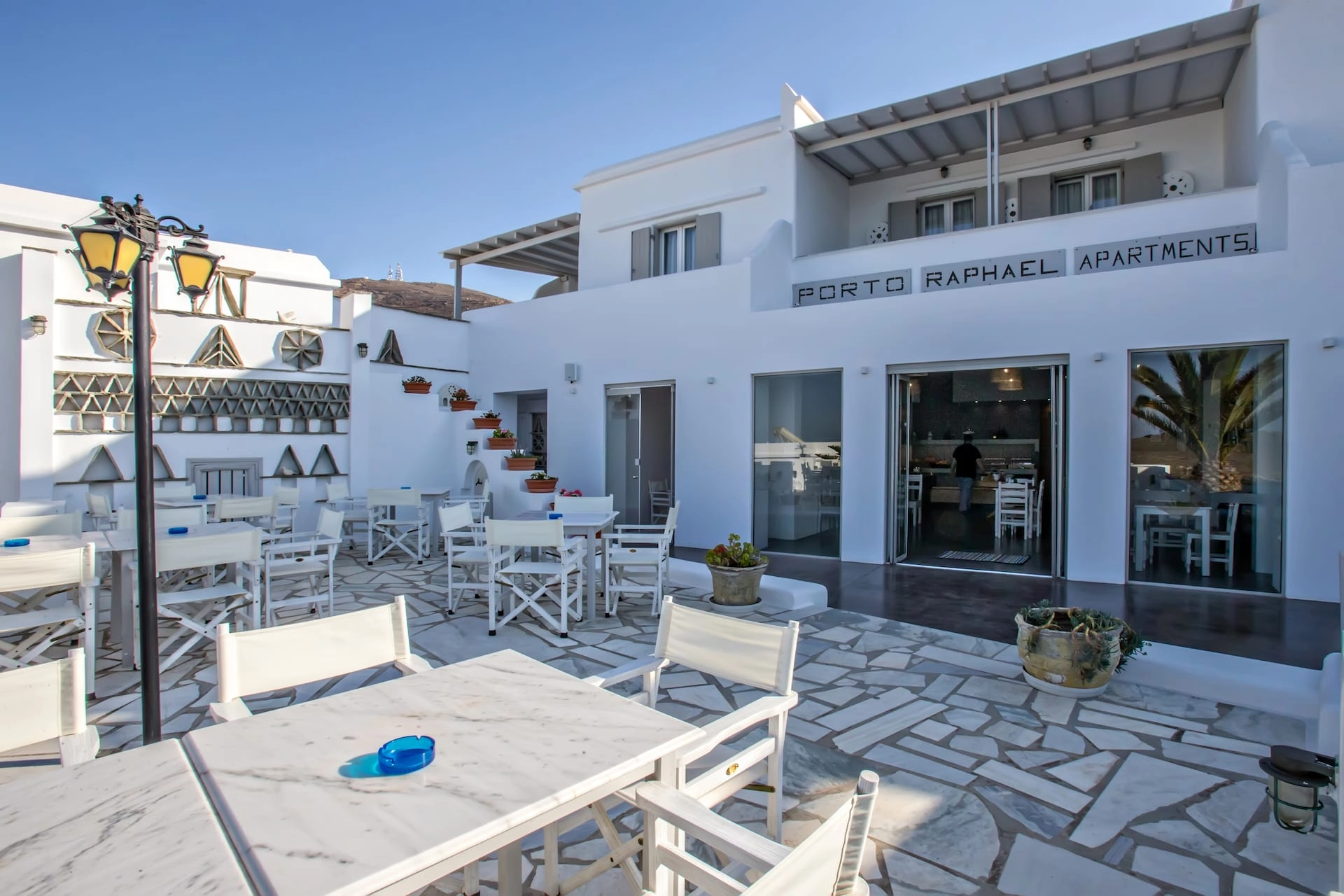 Porto Raphael Residences & Suites is a traditionally built hotel, consisting of 30 residences and suites. Placed in an oasis inside a flourished garden among the Cycladic rocks and only 30 metres from the glimmering sea. Agios Ioannis is 500 metres away, here there are plenty of restaurants and also mini markets for everyday shopping.
