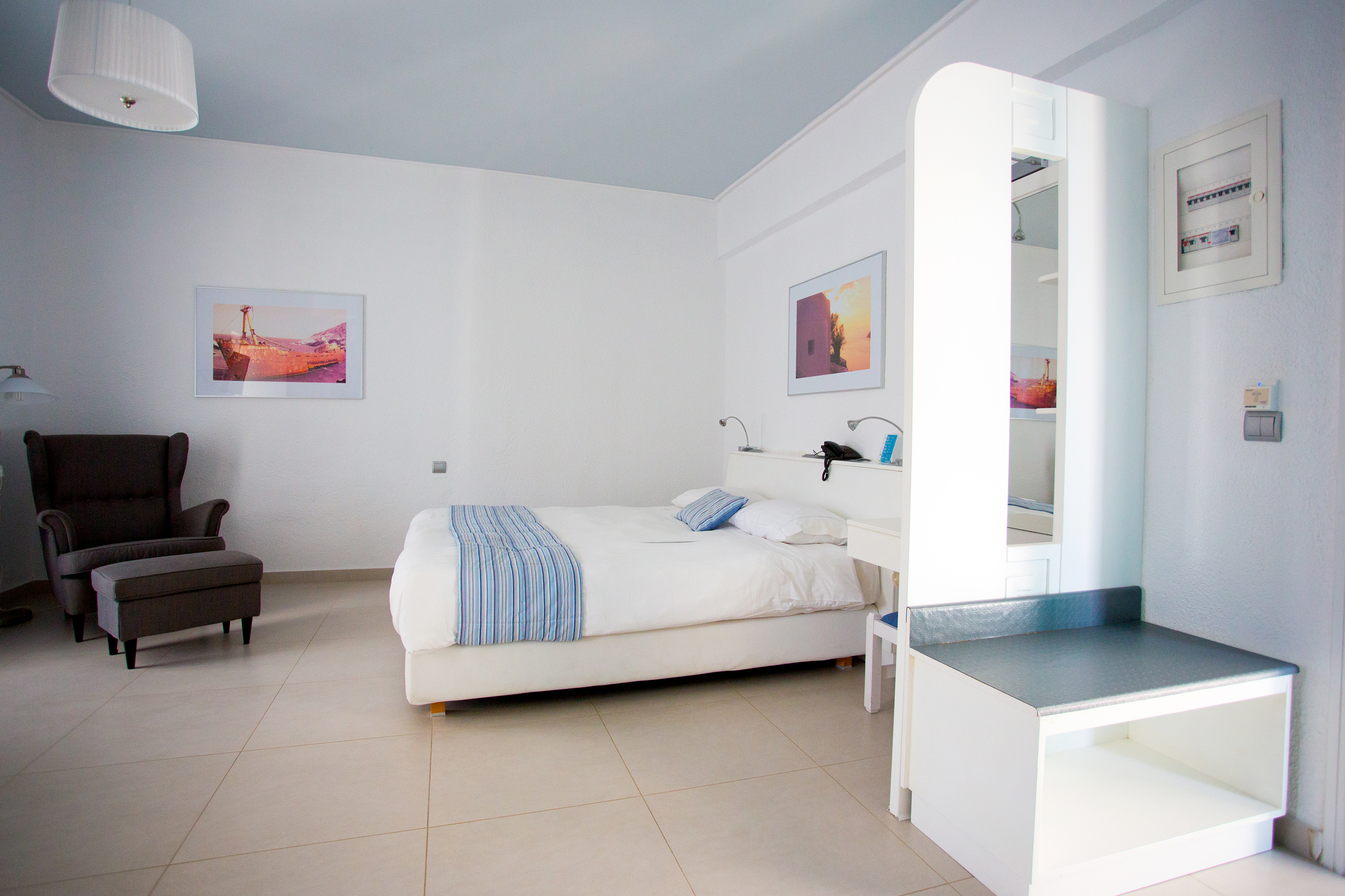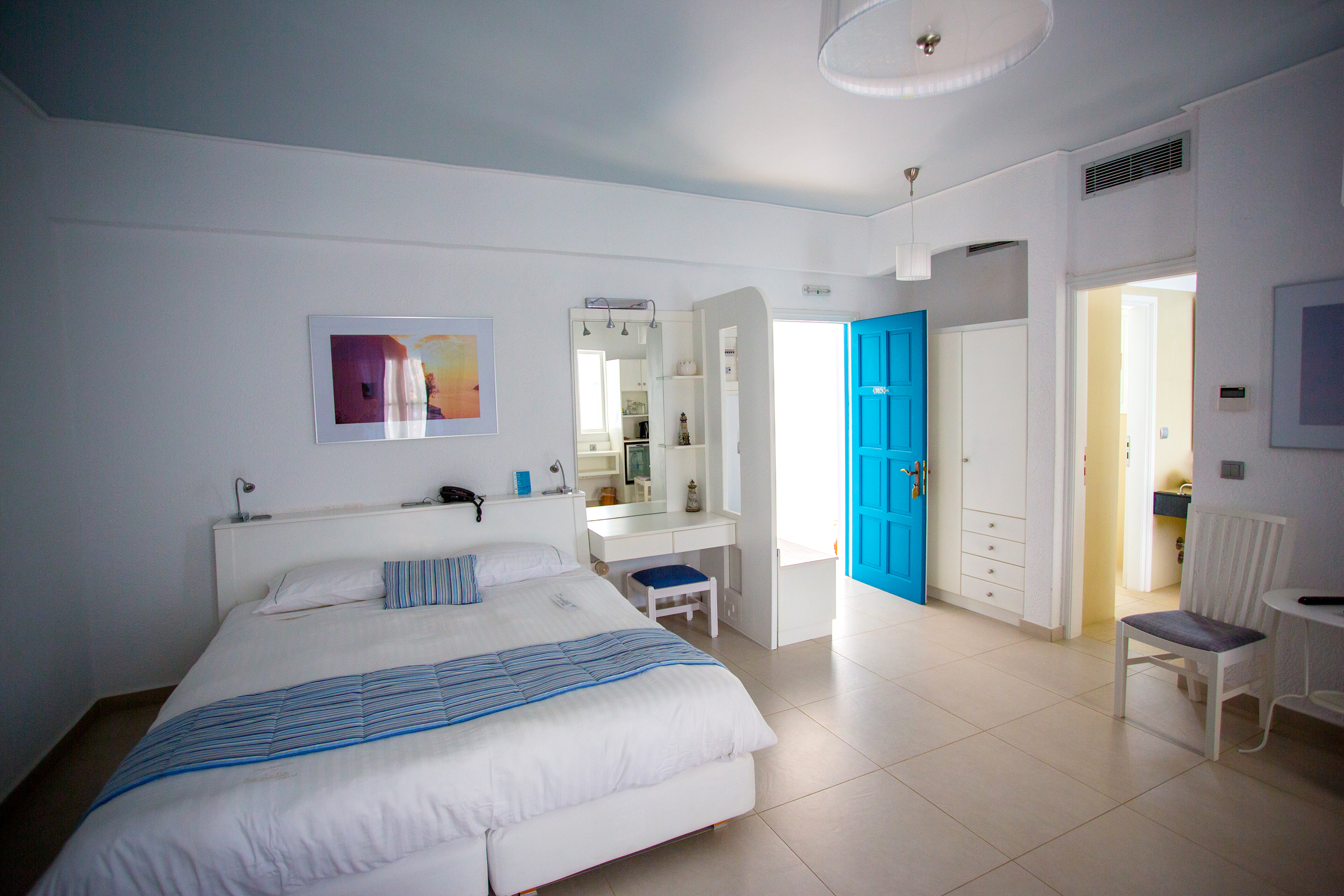 Each airy room is designed for guest comfort, featuring private balconies with stunning sea views, air conditioning, and essential amenities such as a private bathroom, hairdryer, safe, and refrigerator. Guests can also enjoy complimentary bathrobes and pool towels, ensuring a luxurious stay.