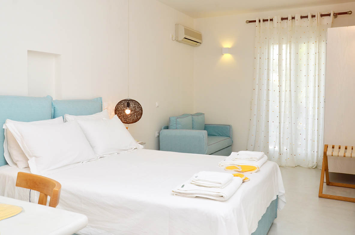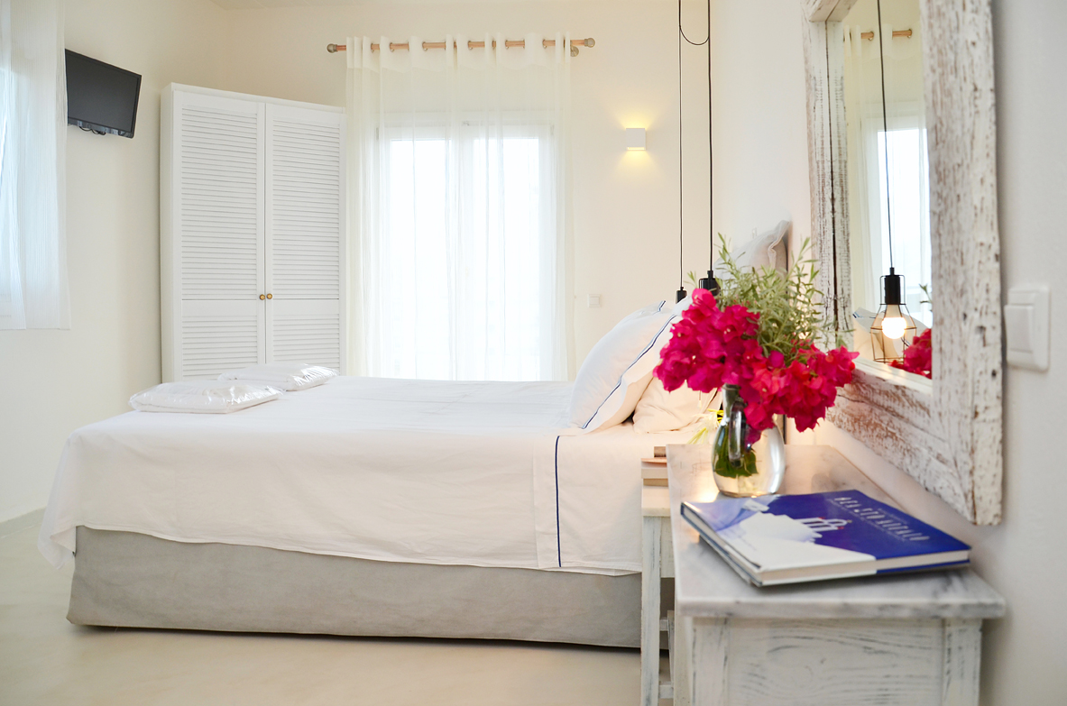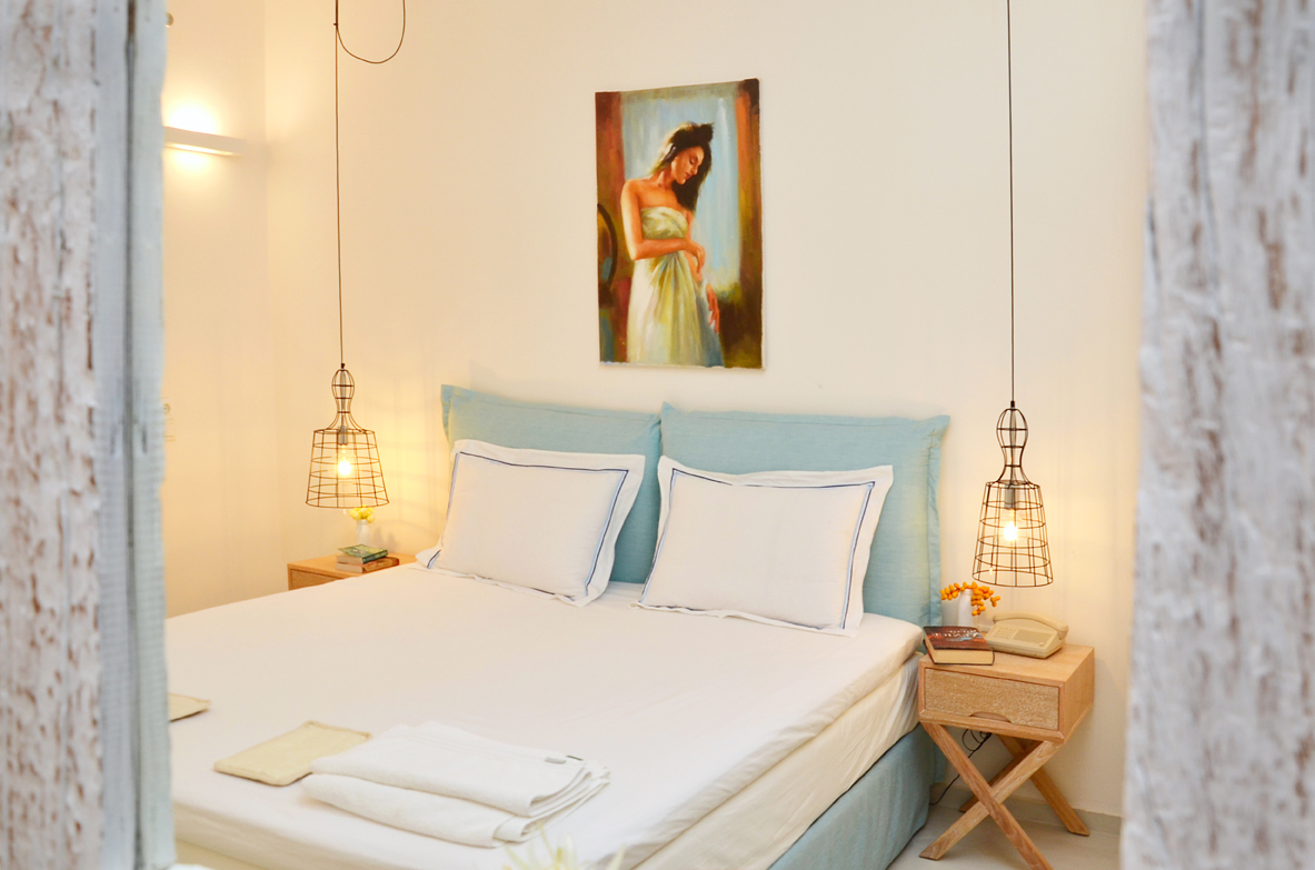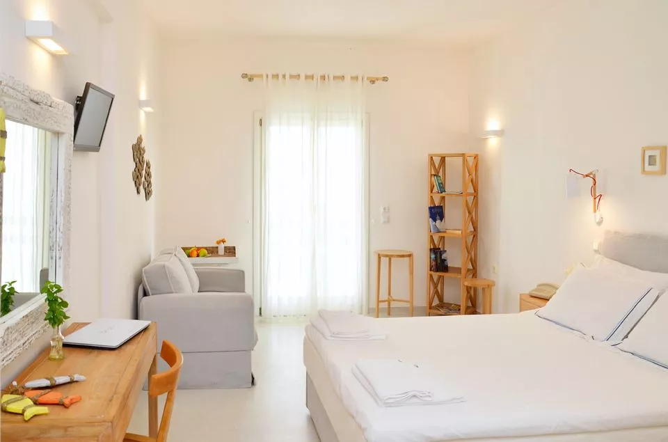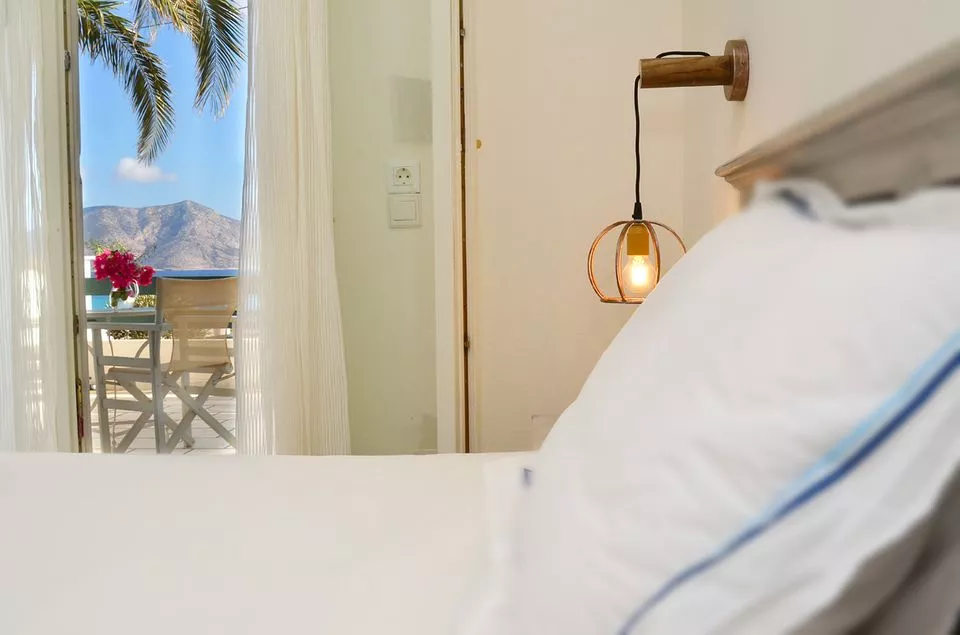 The hotel offers a range of well-appointed rooms and suites, each designed to provide maximum comfort and a peaceful retreat. Many of the rooms feature private balconies or terraces with breathtaking views of the Aegean Sea and the island’s rugged landscapes. The interior decor combines modern furnishings with local artistic influences, creating a space that feels both chic and welcoming.