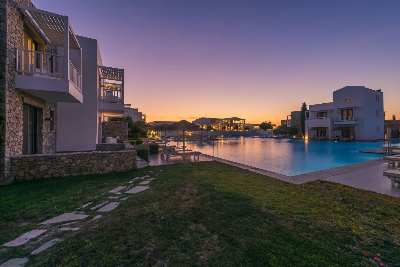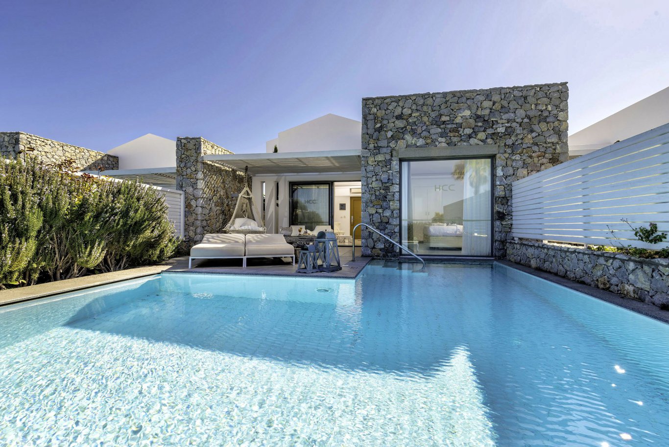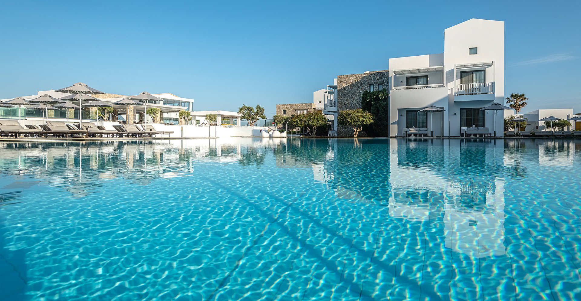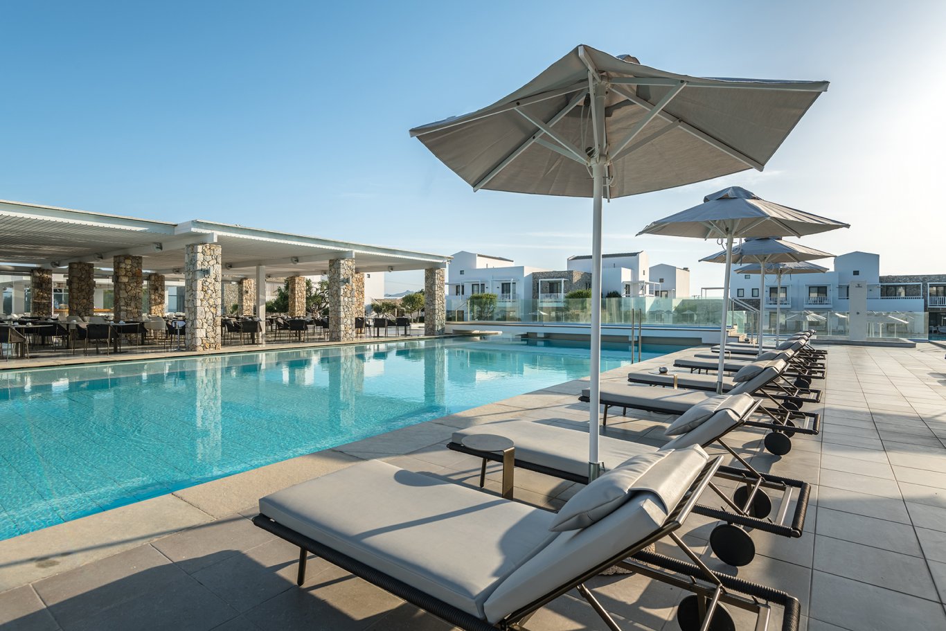 Guests are welcomed into a serene world of relaxation, where every detail has been carefully considered. From the sweeping staircase leading to the glistening pool complex to the hotel’s lush gardens and ambient lighting, the atmosphere is calm, modern, and luxurious. There are multiple pools throughout the property, including one with powerful hydro-massage jets, surrounded by slate tiling and stylish loungers, perfect for unwinding or enjoying water aerobics in a low-impact setting.
