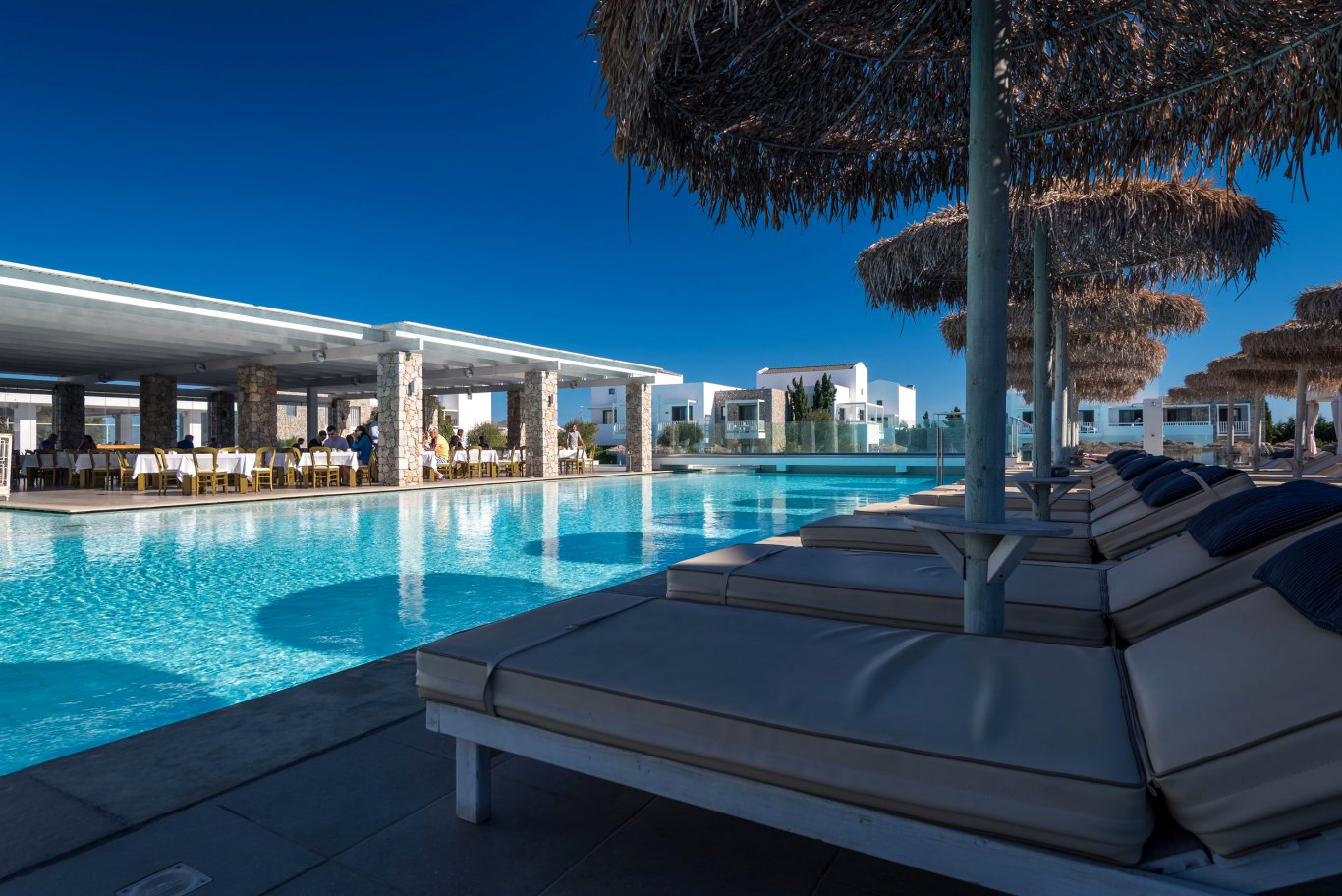 The hotel’s bar scene is equally impressive. The Marquise Lobby Bar, with its gold-and-white décor, mirrored ceilings, and exotic greenery, creates an elegant yet relaxed ambiance. It’s a place to enjoy cocktails while taking in views of the Aegean and the surrounding poolscape. The Radiant Pool Bar offers light meals and refreshments during the day, transforming into a picturesque setting for sunset drinks in the evening. Down on the sand, the Cushion Beach Bar provides attentive service and refreshments under immaculate white parasols during the high season.