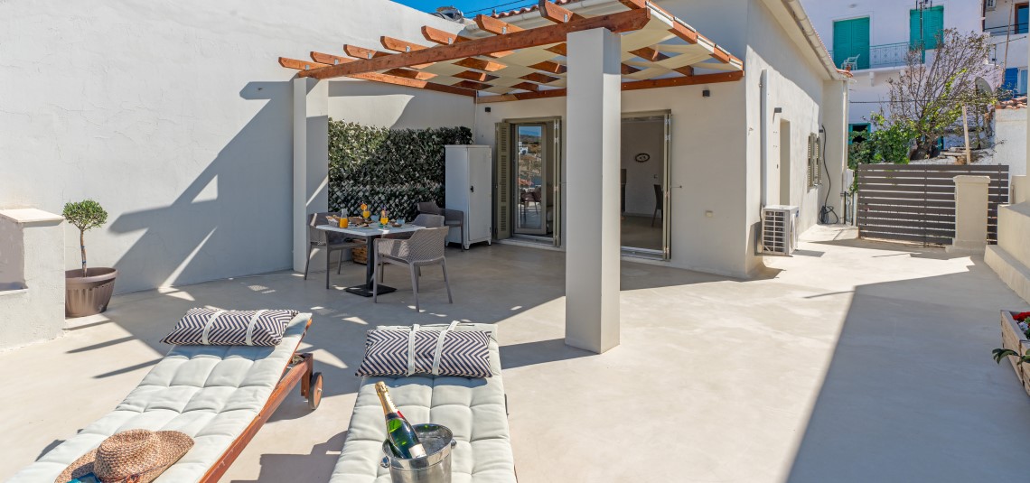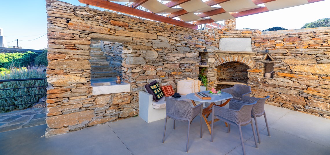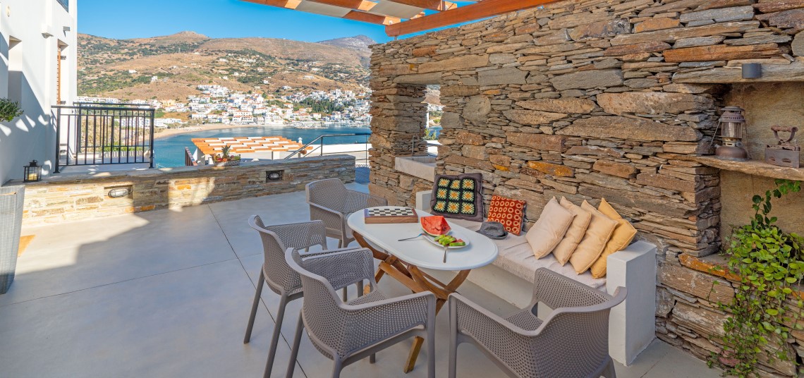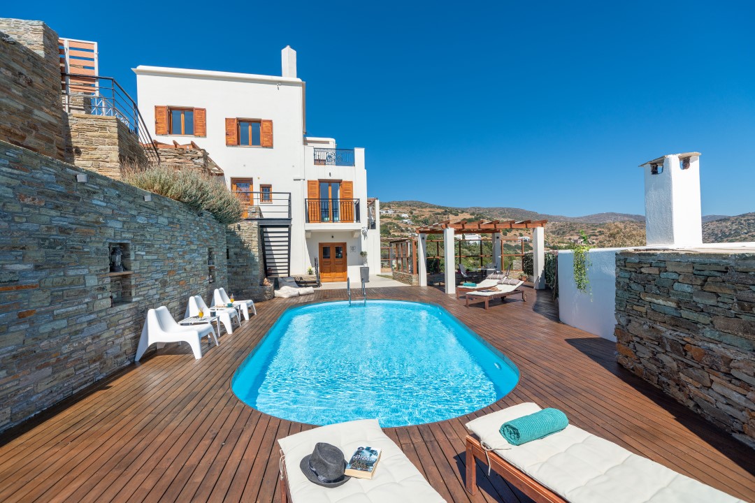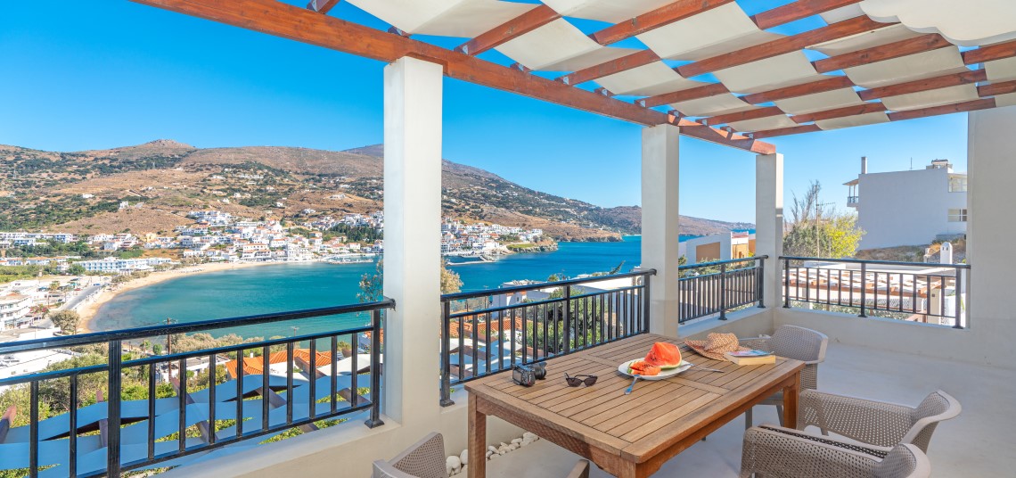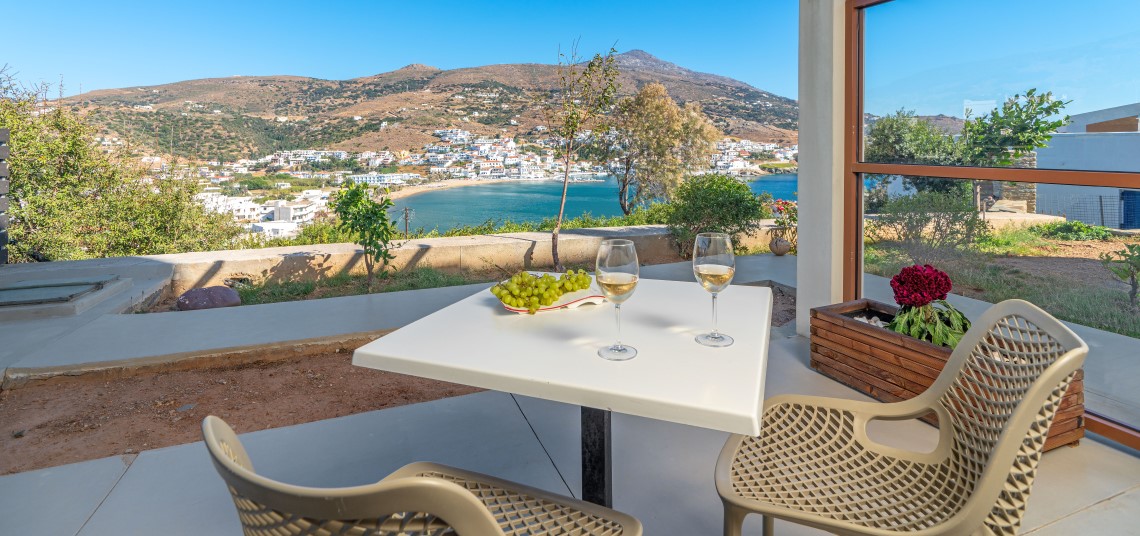 All suites are fully equipped for self-catering stays, while daily breakfast delivery and personalized concierge services add a layer of convenience and luxury. The pool area offers panoramic views over Batsi, making it a relaxing spot to enjoy the island’s natural beauty.