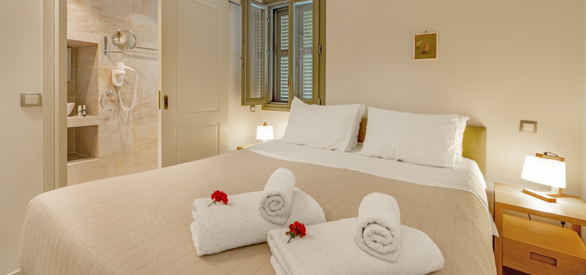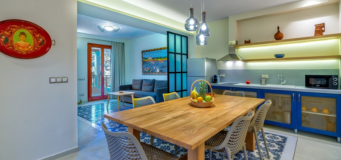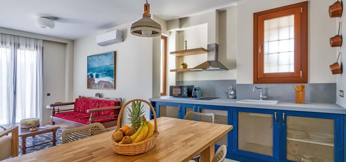 Suites sleep between 2 and 6 guests, each one uniquely styled with traditional artefacts and original artworks by local artist Stella Kontotsita. The interiors are thoughtfully designed to balance comfort and aesthetics, creating a tranquil atmosphere ideal for rest and inspiration.