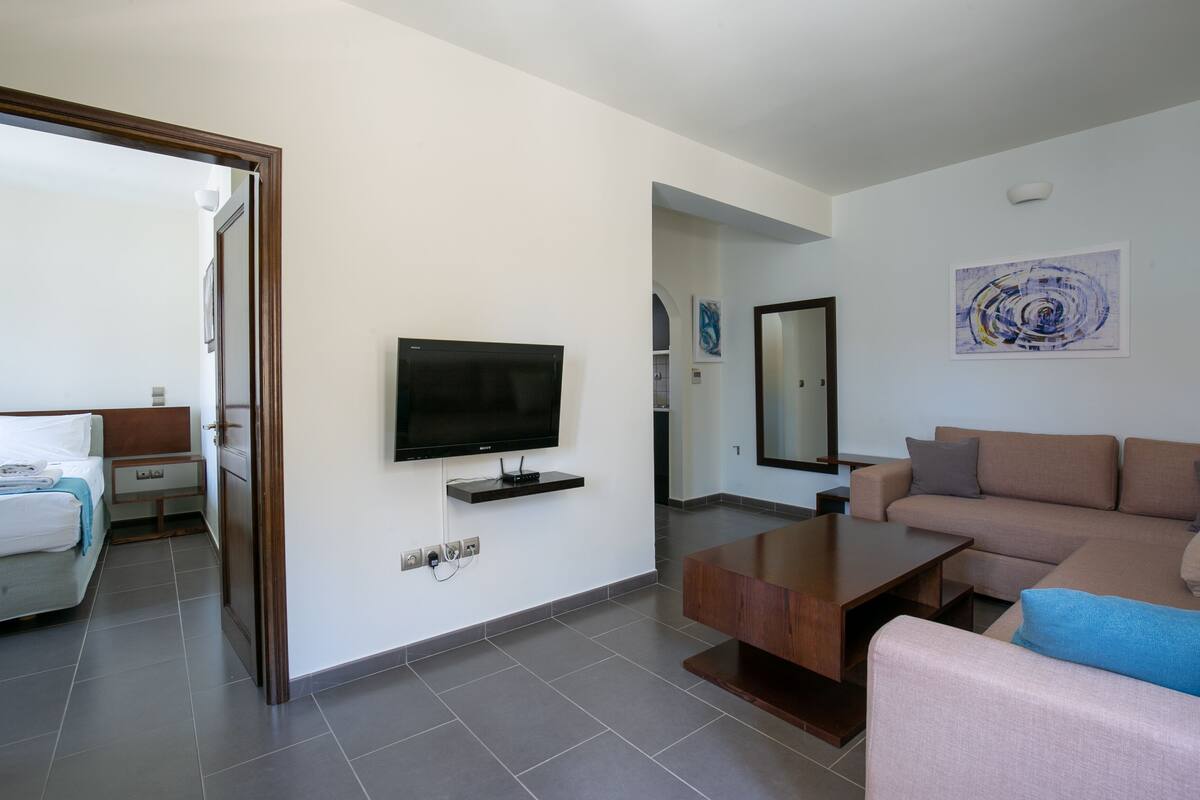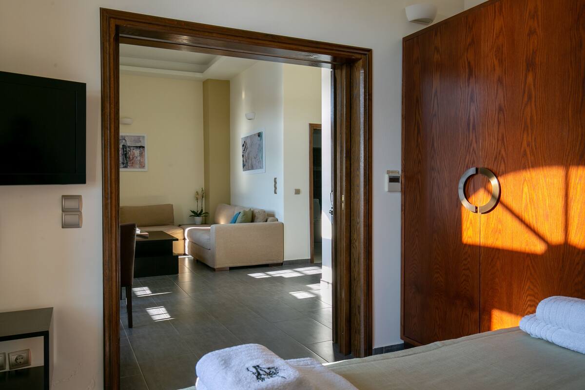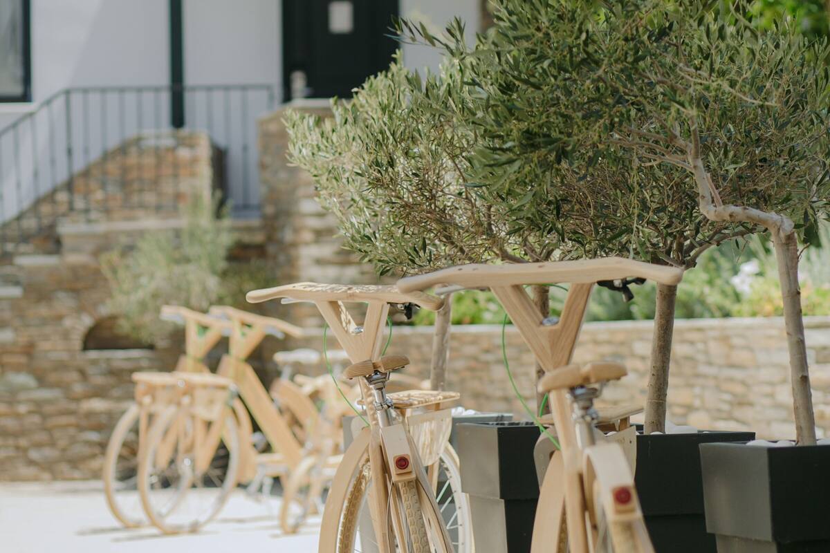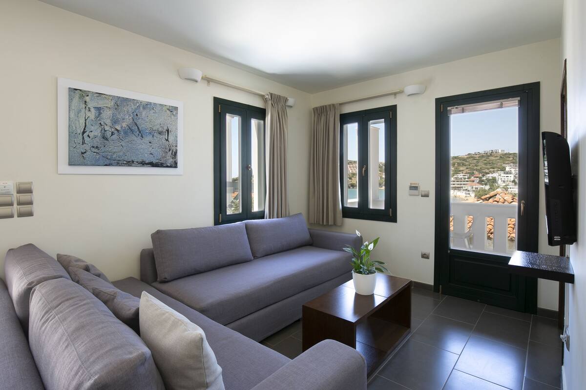 Each suite features generous space, individual style, and modern amenities, ideal for those seeking a blend of comfort and authenticity. A tranquil courtyard filled with trees and aromatic flowers creates a serene atmosphere, while elevated views over the Aegean Sea add to the hotel’s distinctive charm.