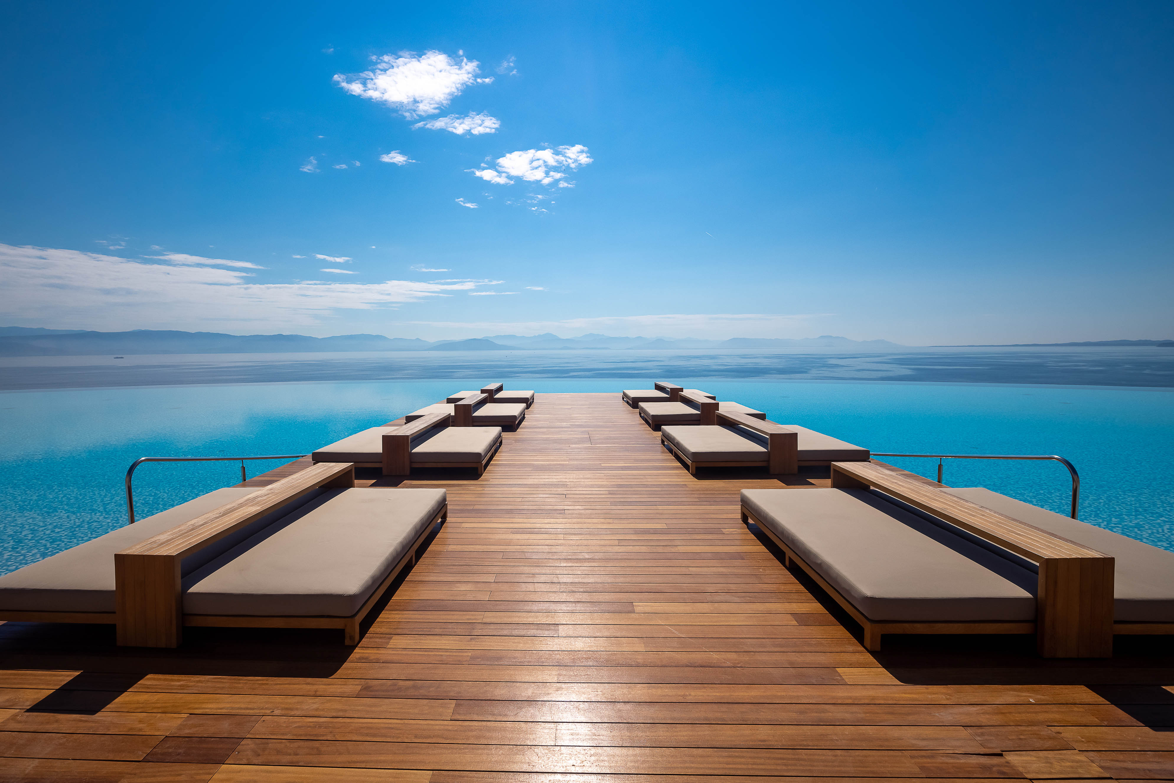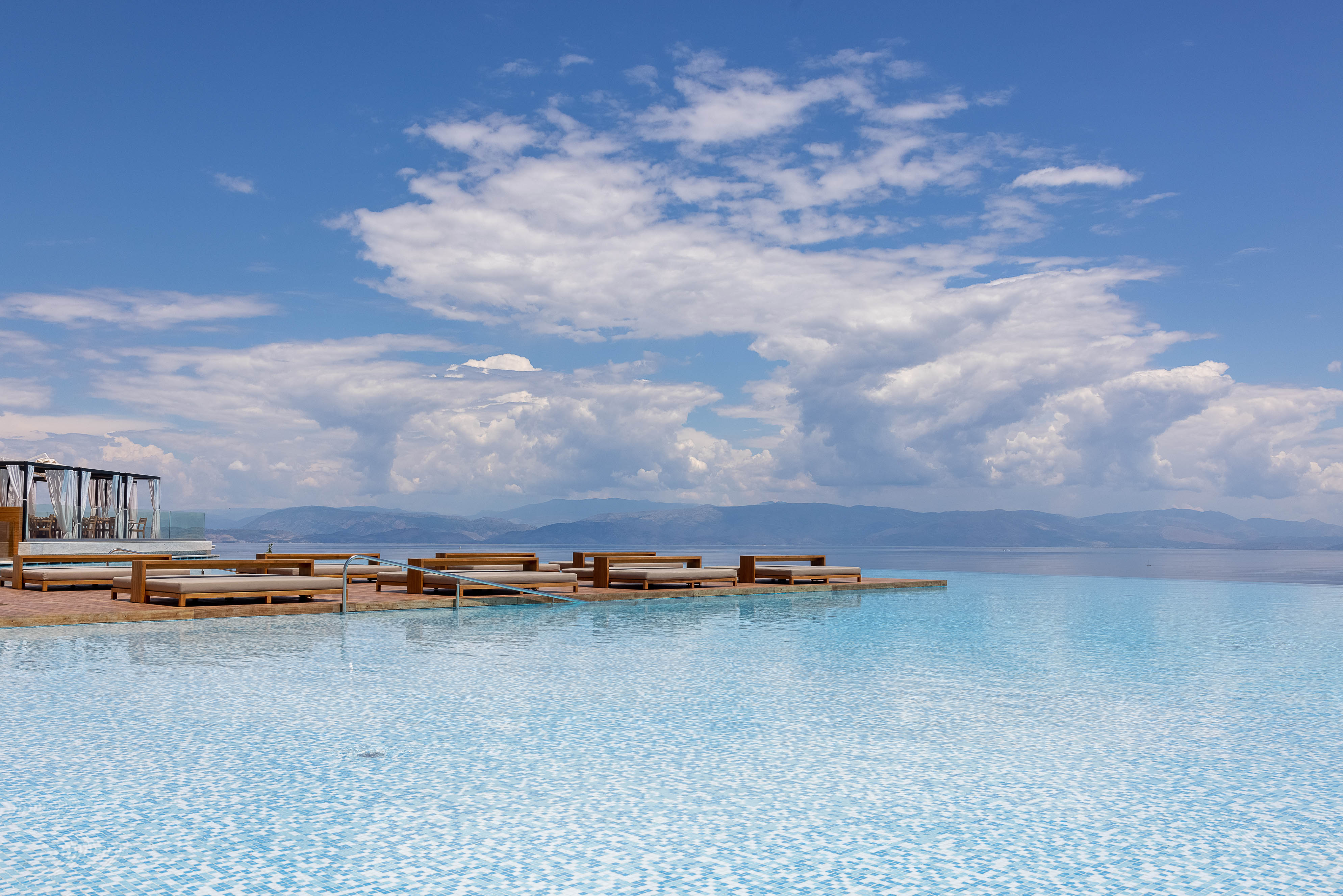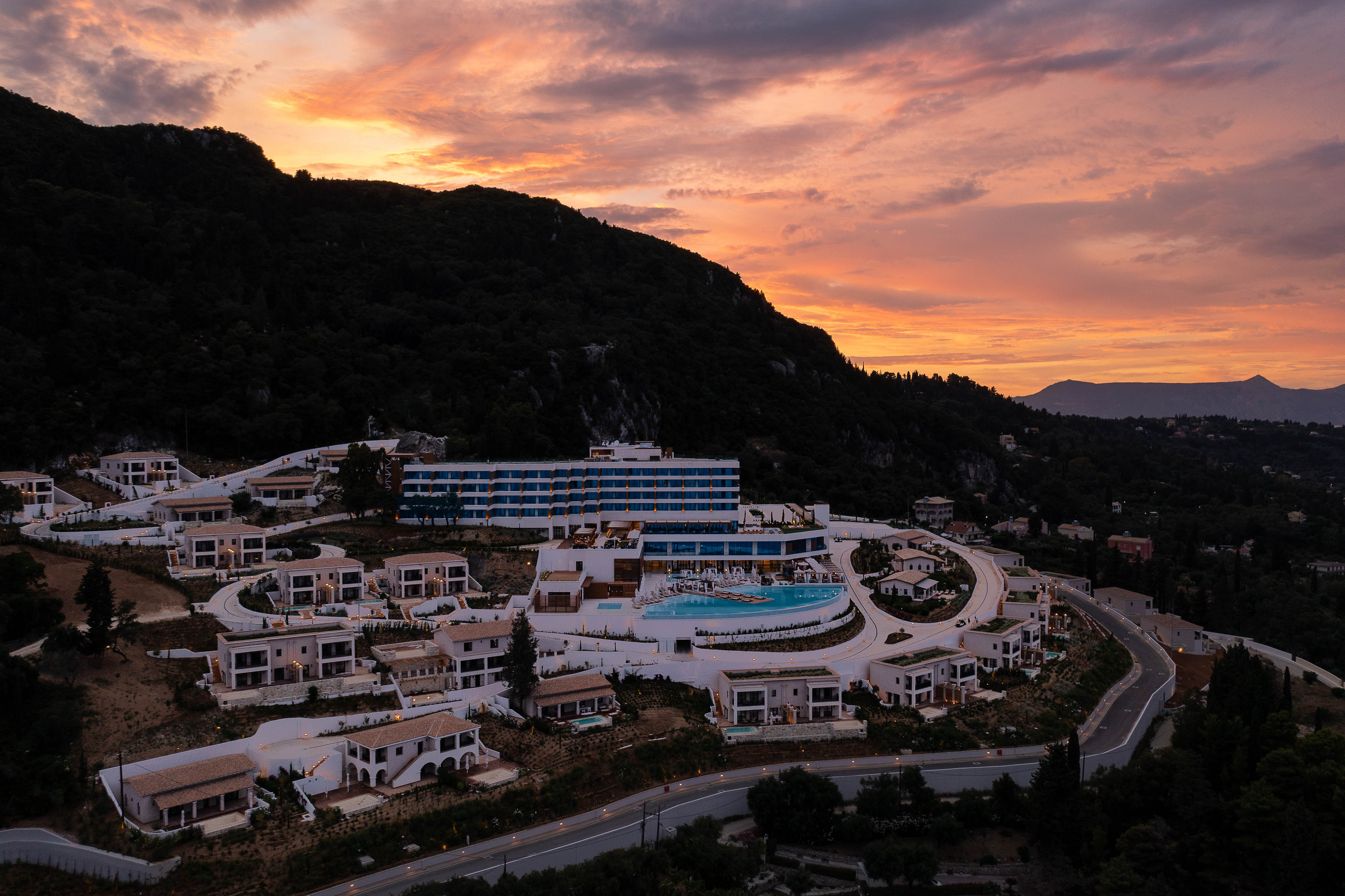The resort offers a collection of 159 contemporary rooms and suites, plus 37 luxury villa homes built in the style of local architecture, laid out across the hilltop estate. The estate is surrounded by a landscape of exquisite beauty with Mediterranean gardens and olive tree groves, overlooking the picturesque Benitses Bay, presenting far-reaching views of the Ionian sea and the countryside.