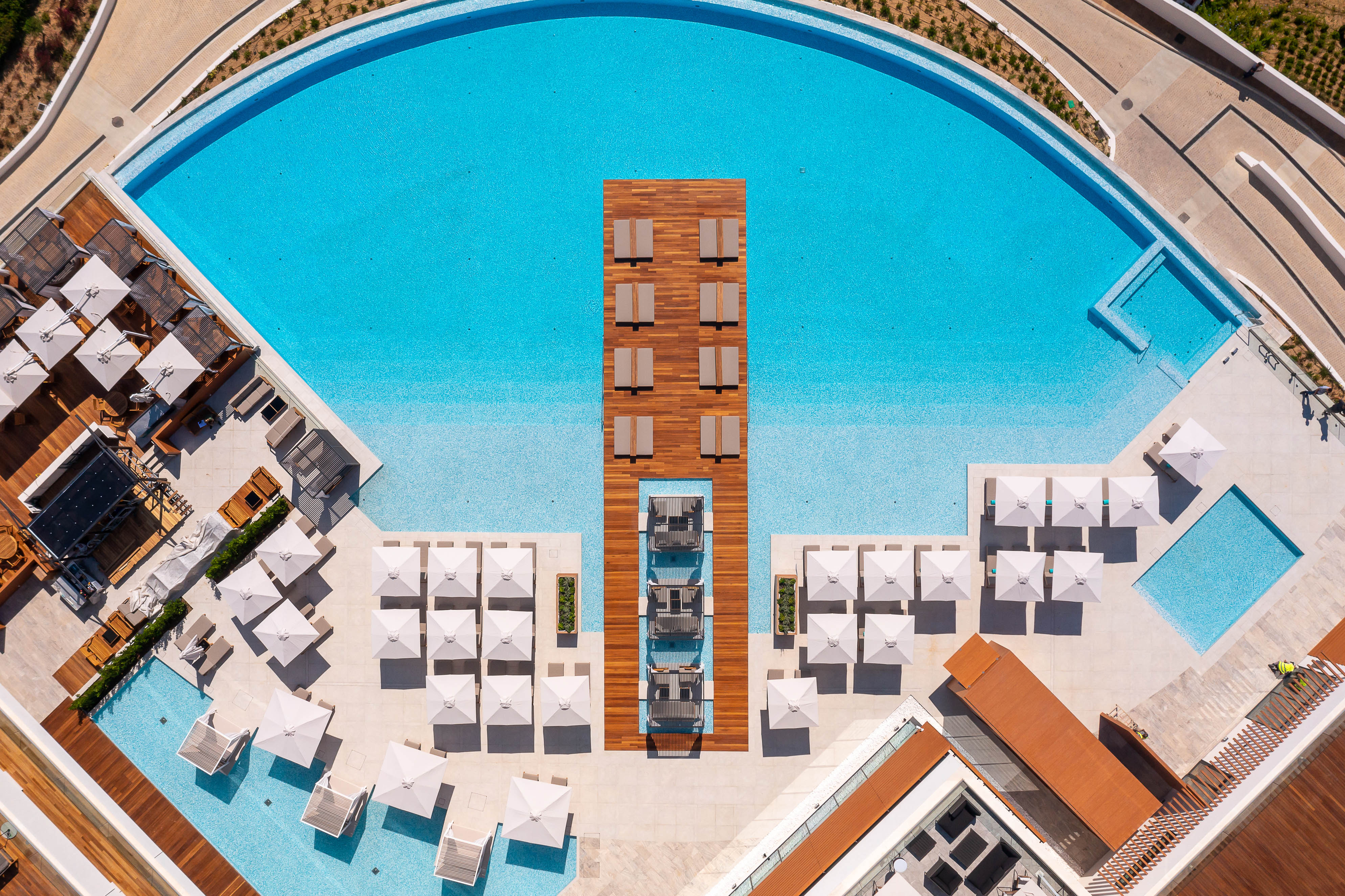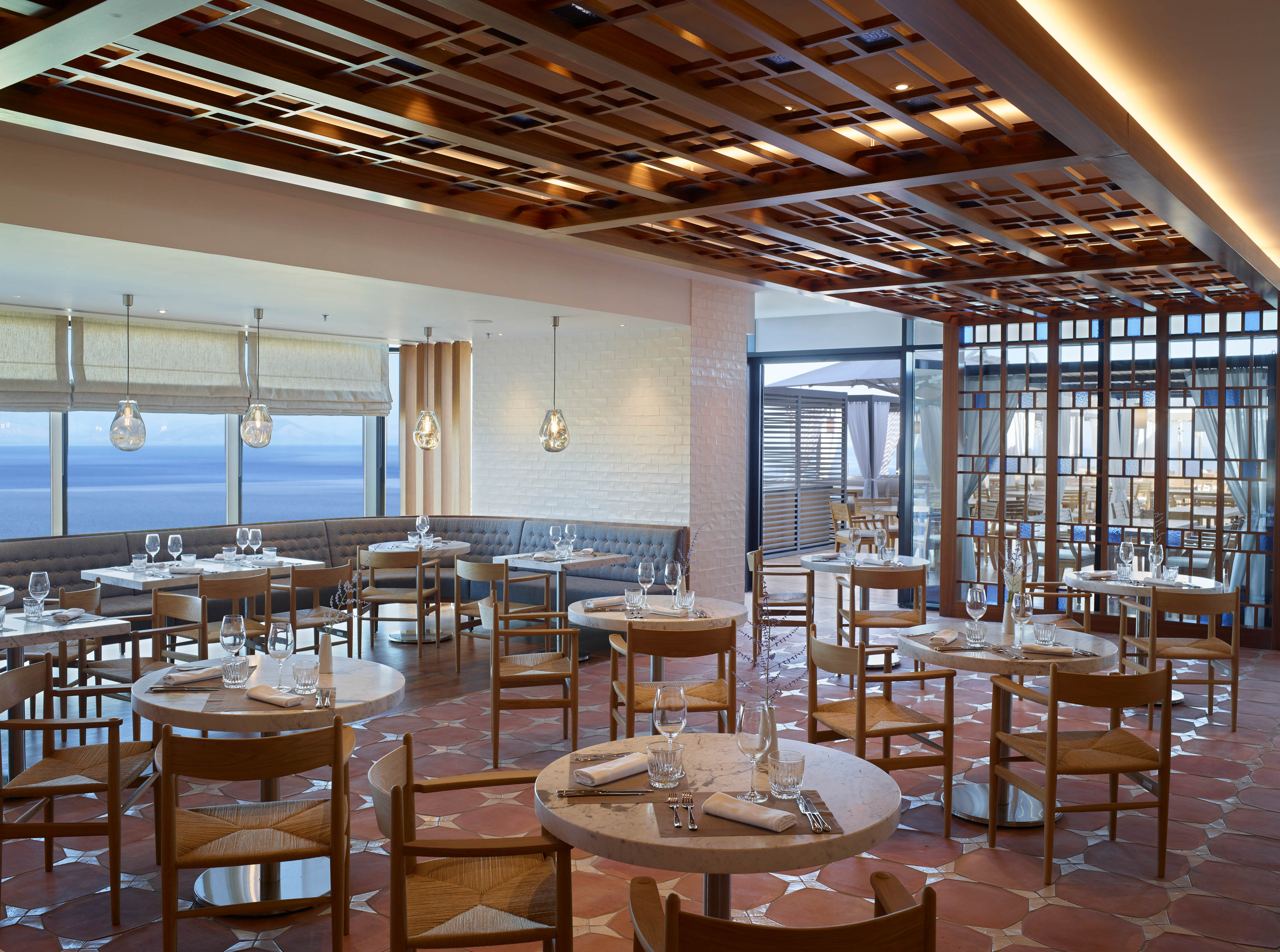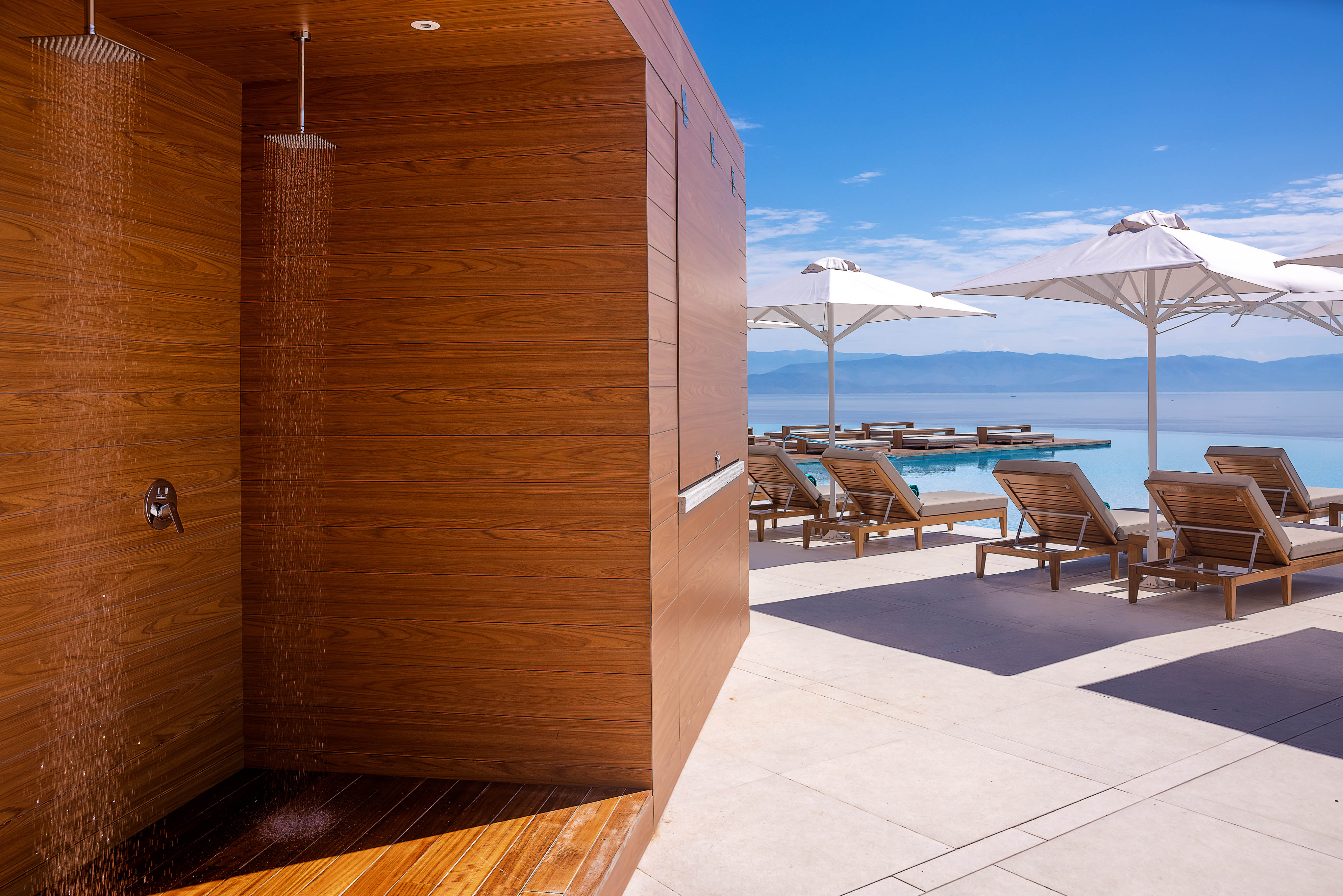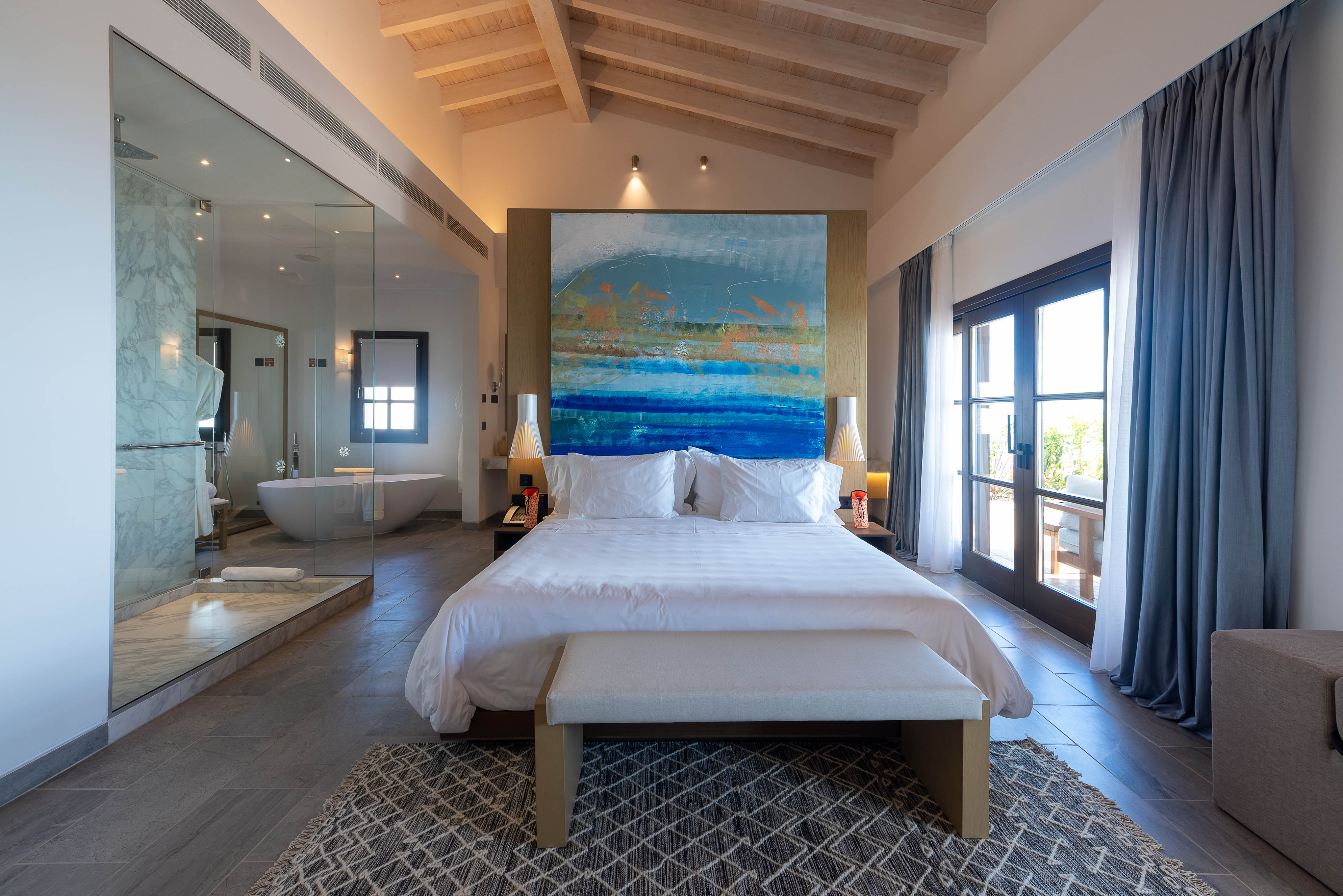 The resort offers a collection of 159 contemporary rooms and suites, plus 37 luxury villa homes built in the style of local architecture, laid out across the hilltop estate. The estate is surrounded by a landscape of exquisite beauty with Mediterranean gardens and olive tree groves, overlooking the picturesque Benitses Bay, presenting far-reaching views of the Ionian sea and the countryside.