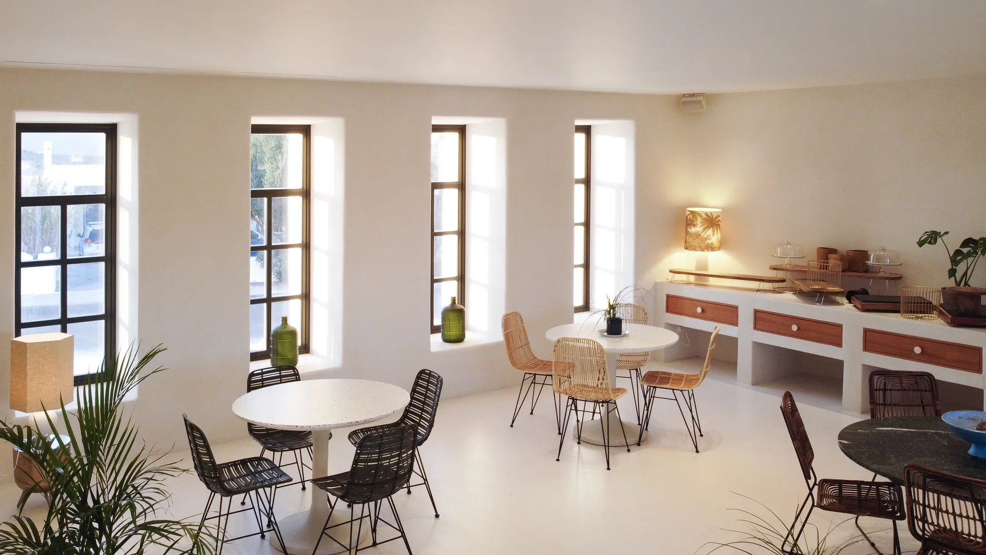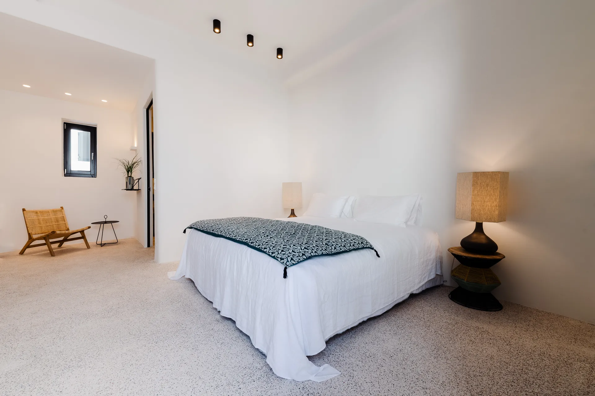 Suites here are comfortable and homely with views over the traditional village of Ano Mera. All feature Coco-mat vegan mattresses from coconut fibre and seaweed tailor made for Koukoumi, Korres vegan amenities from plant based ingredients with recyclable packaging, energy efficient double glass windows minimize temperature fluctuations. All elements including furniture, textiles, sheets, pillows & decorative objects have been carefully selected to derive mainly from natural material avoiding any animal by-products.