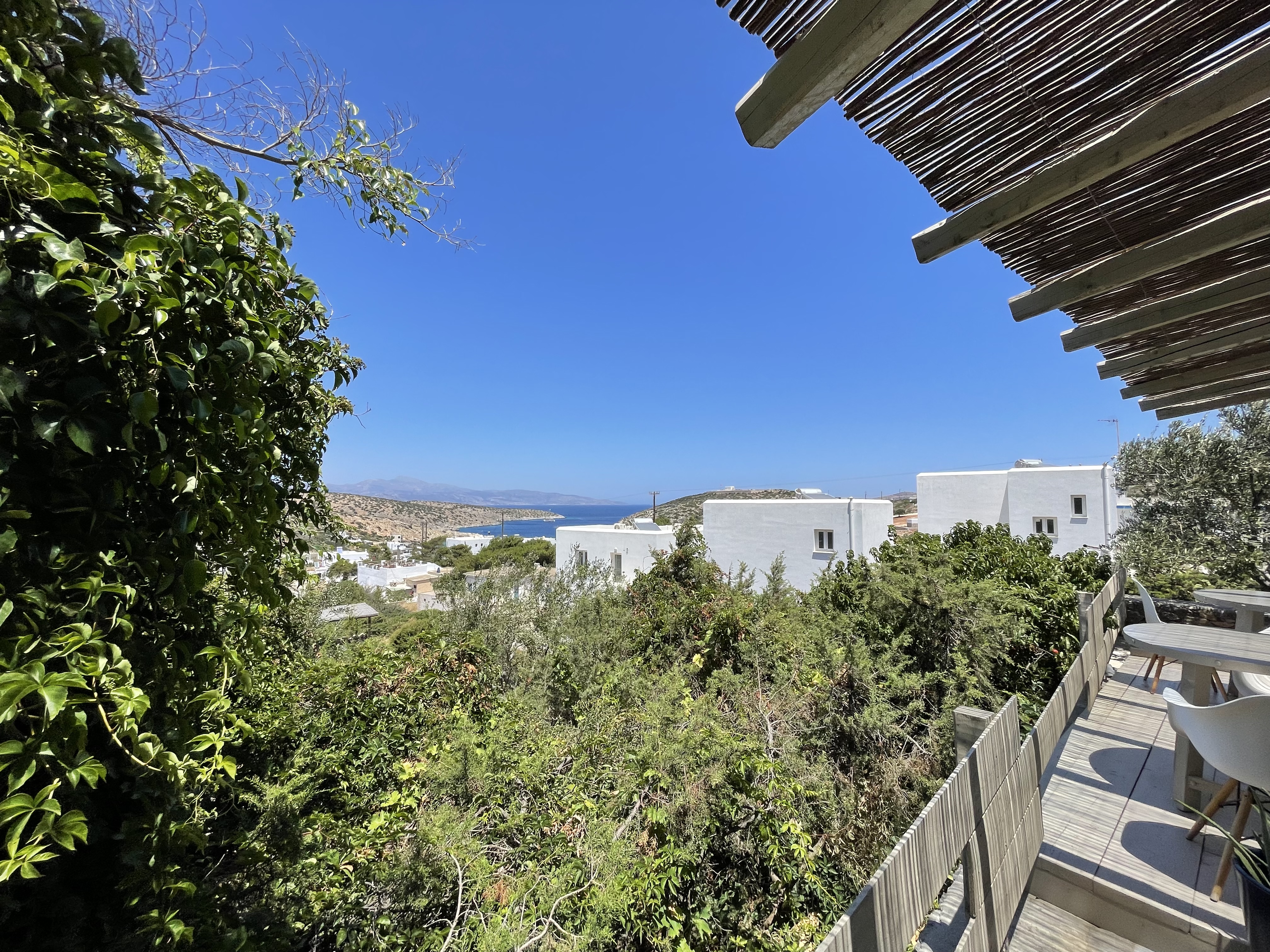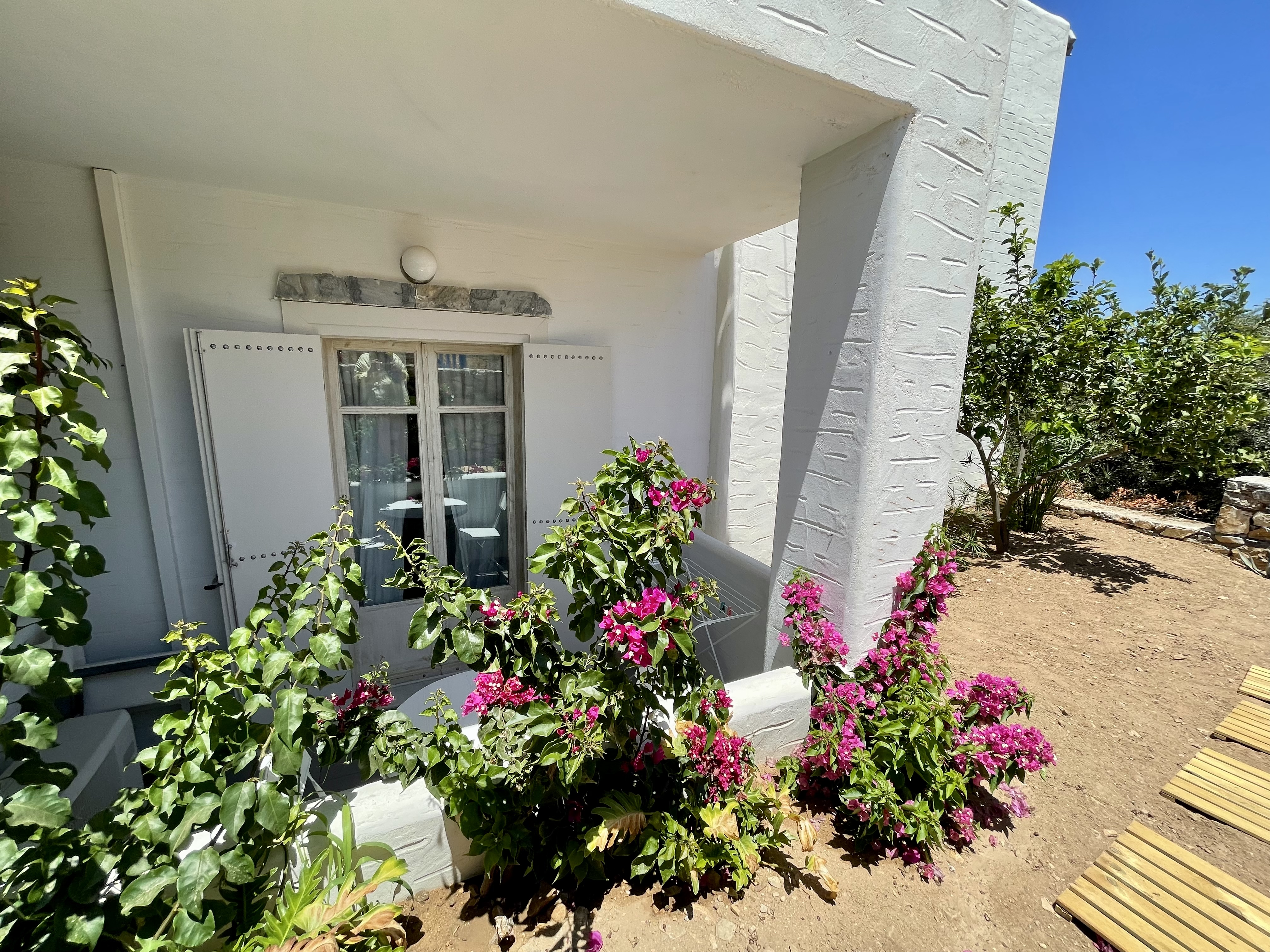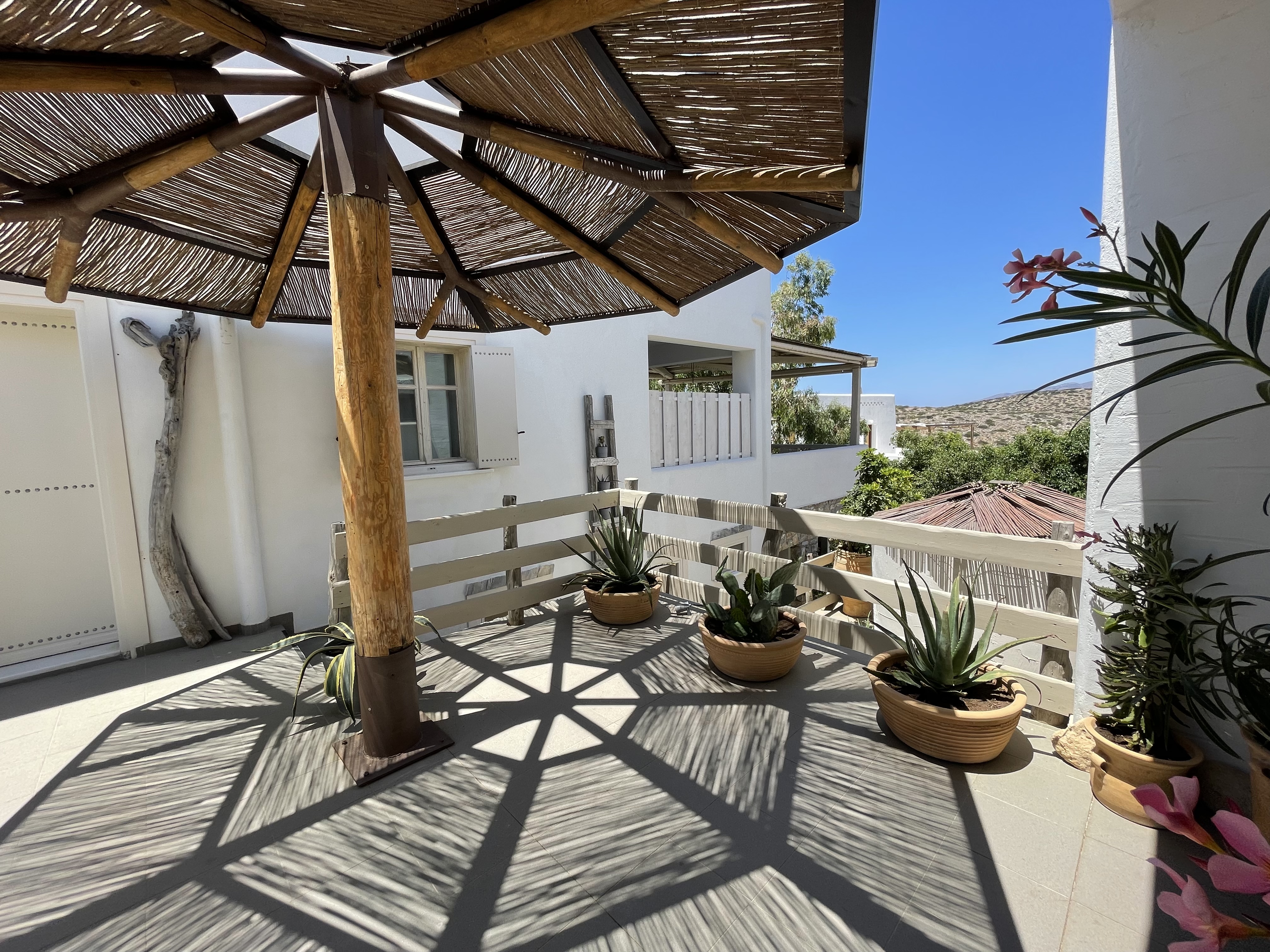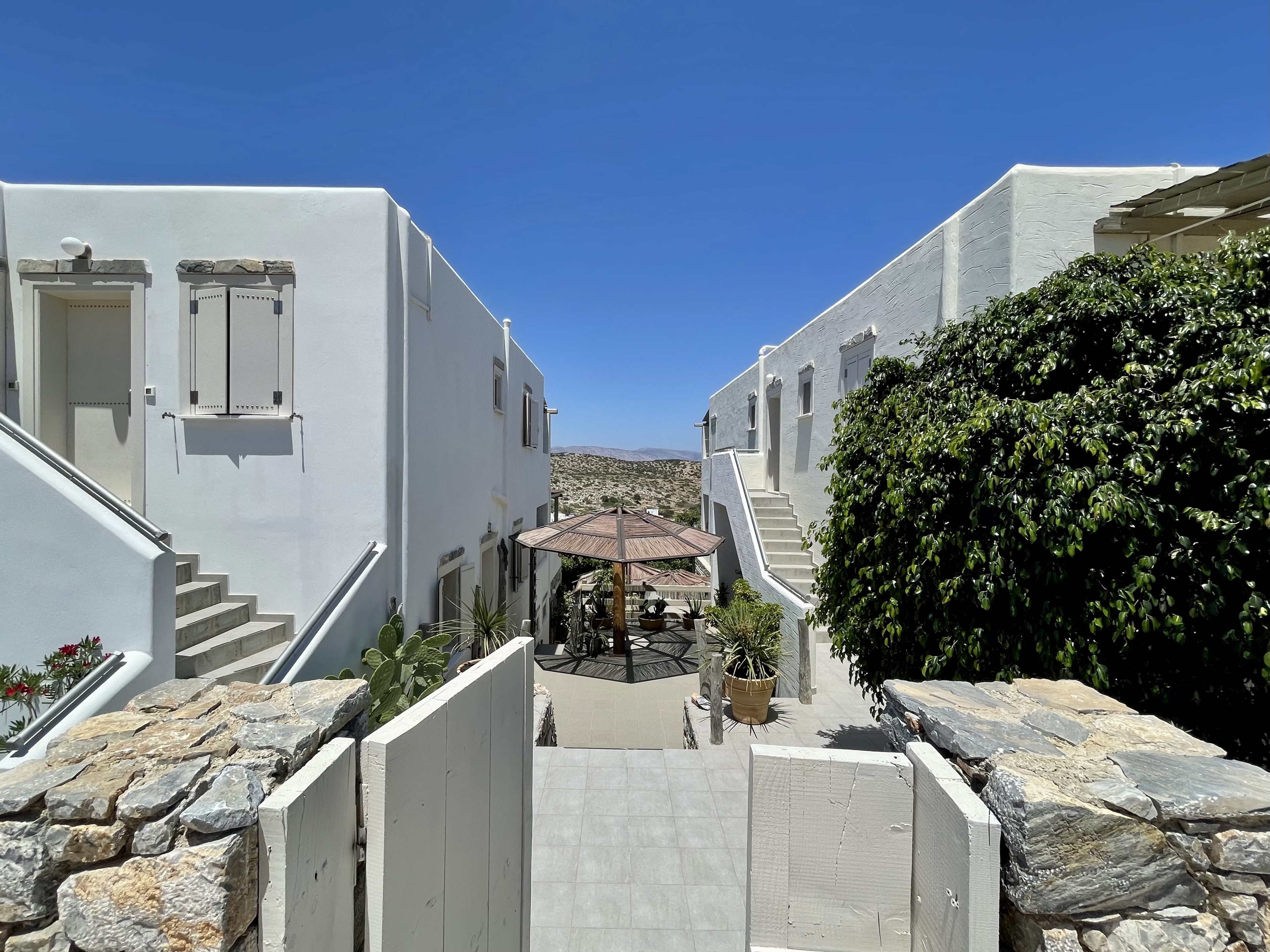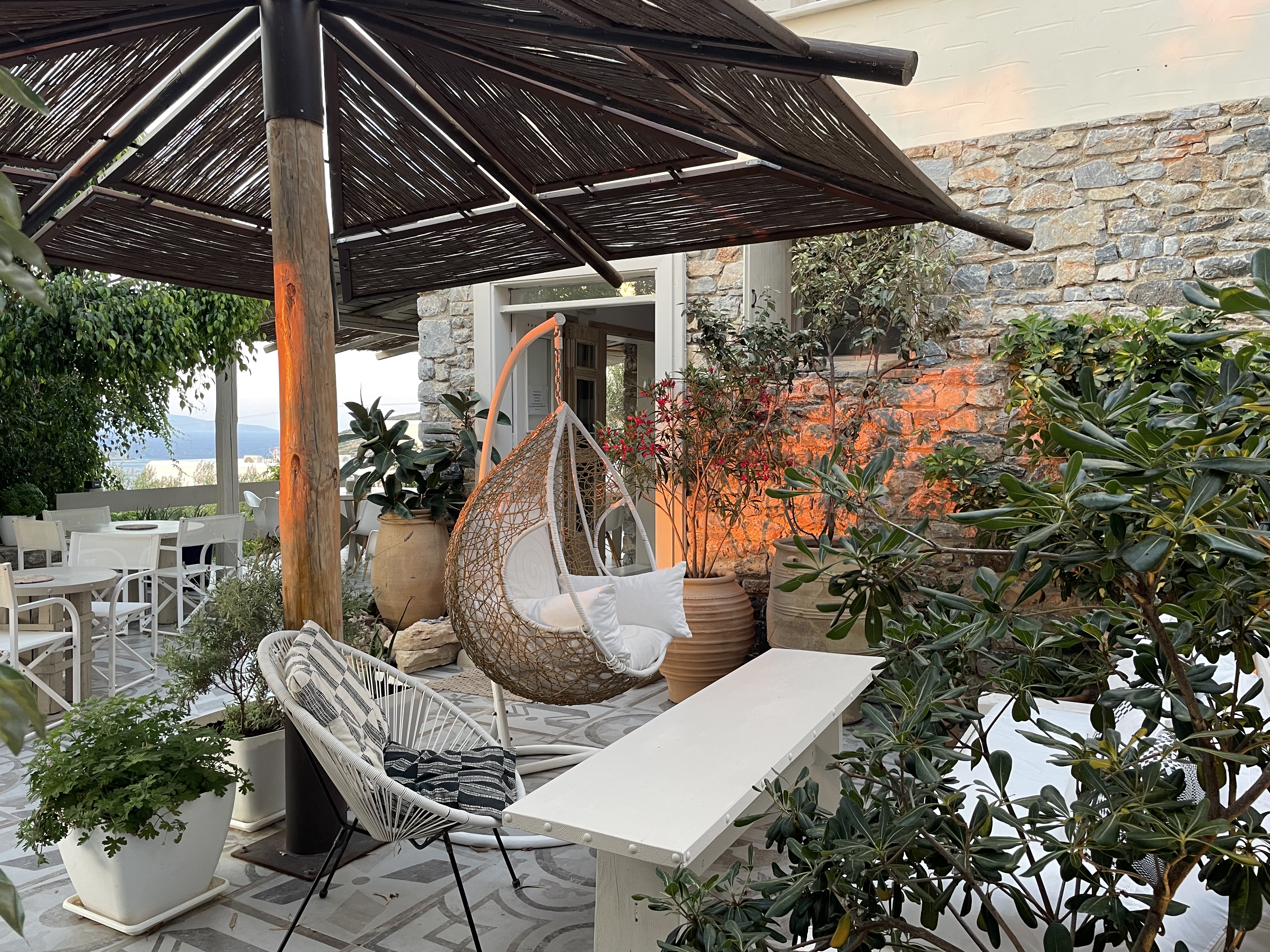 The suites are designed with comfort and elegance in mind, blending traditional Greek aesthetics with modern amenities. Each suite is spacious and well-equipped, featuring private balconies or terraces, air conditioning, and stylish décor. The suites are ideal for couples, families, or small groups who appreciate comfort and privacy. The property’s design is inspired by the natural surroundings, with neutral tones and materials that reflect the island's rustic beauty. The atmosphere is tranquil and inviting, providing an intimate space for guests to unwind and relax.