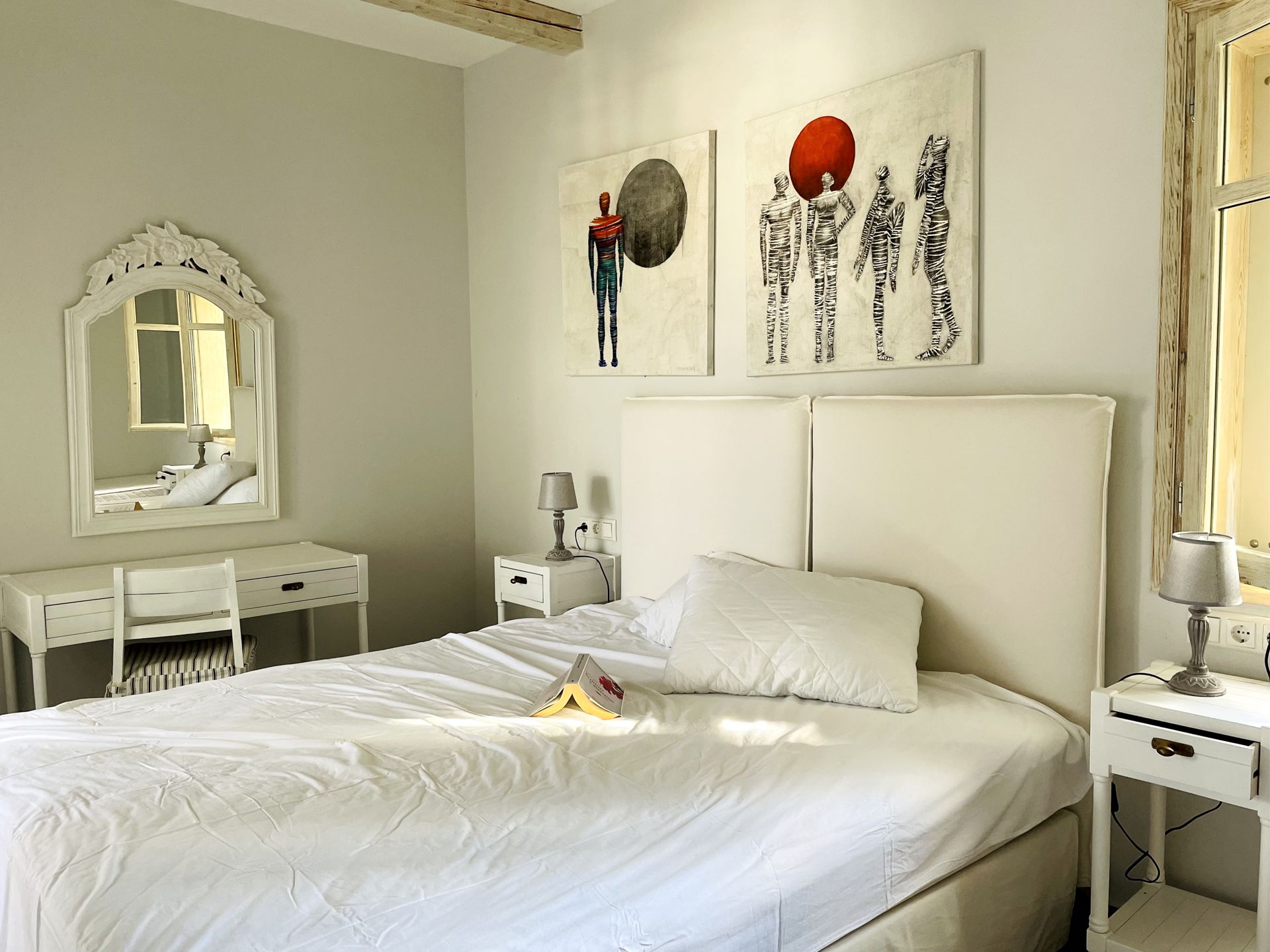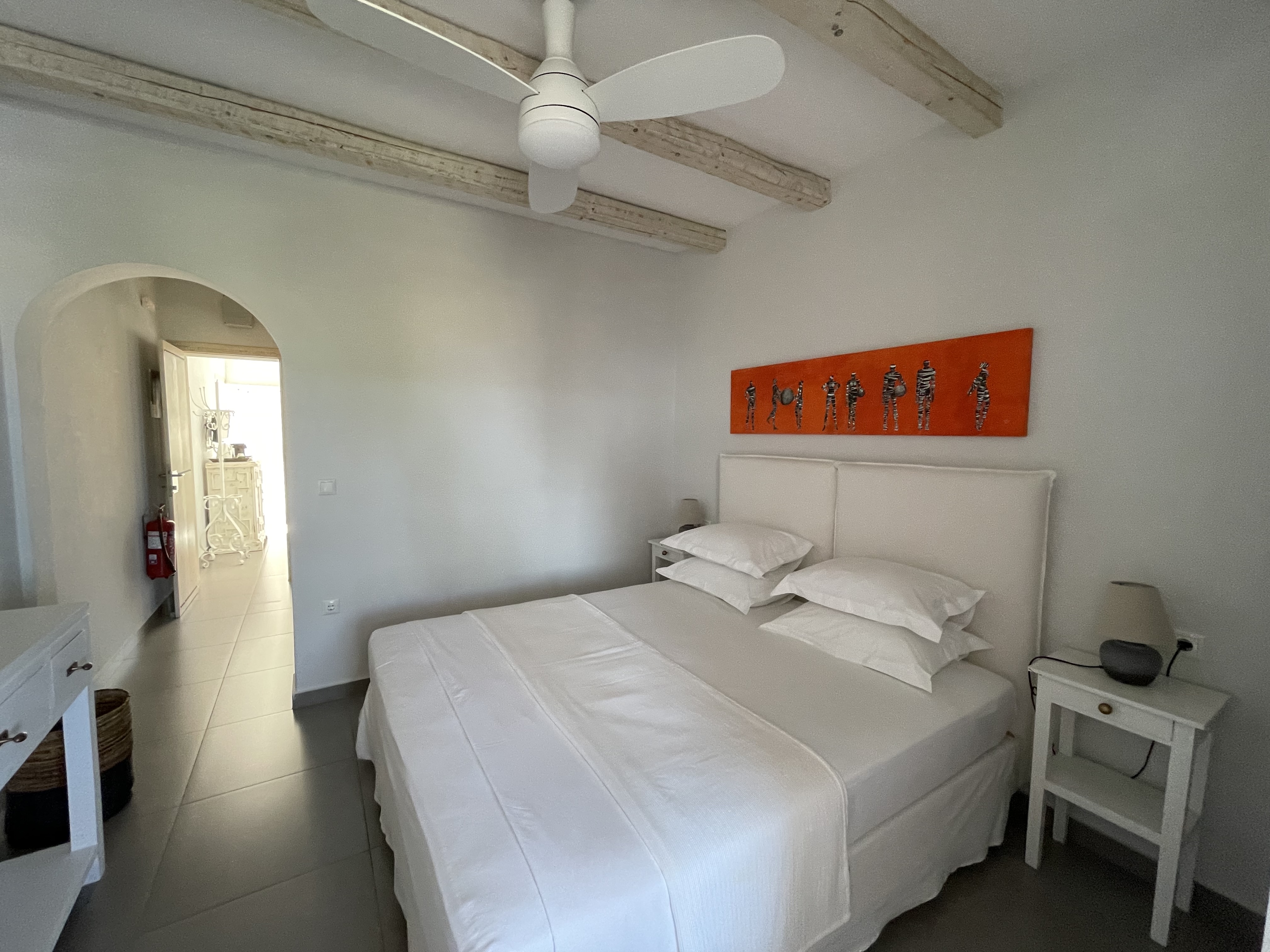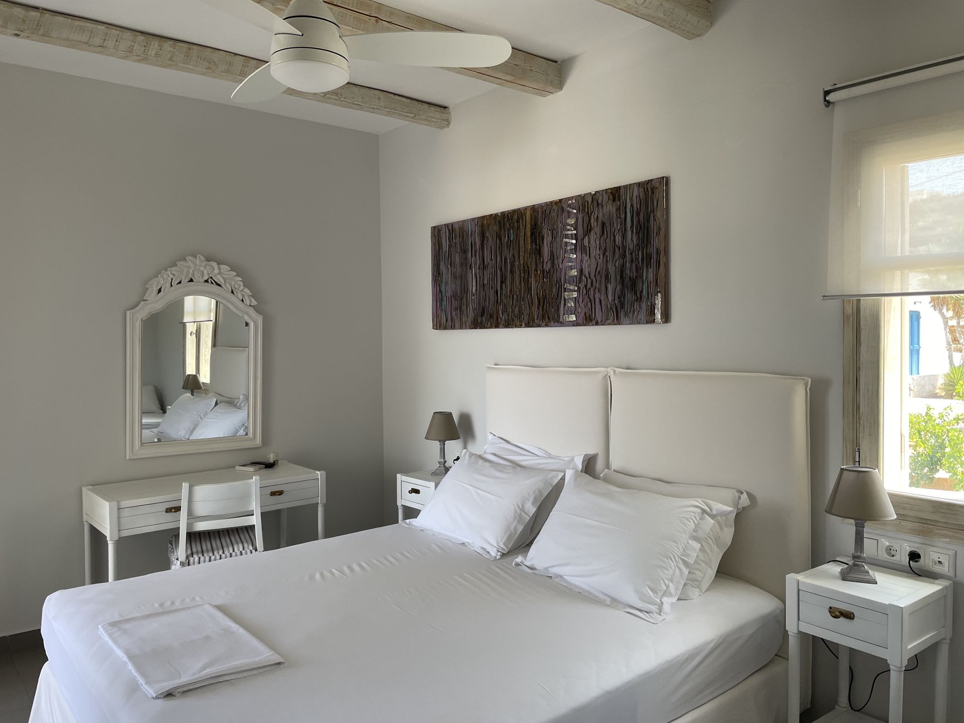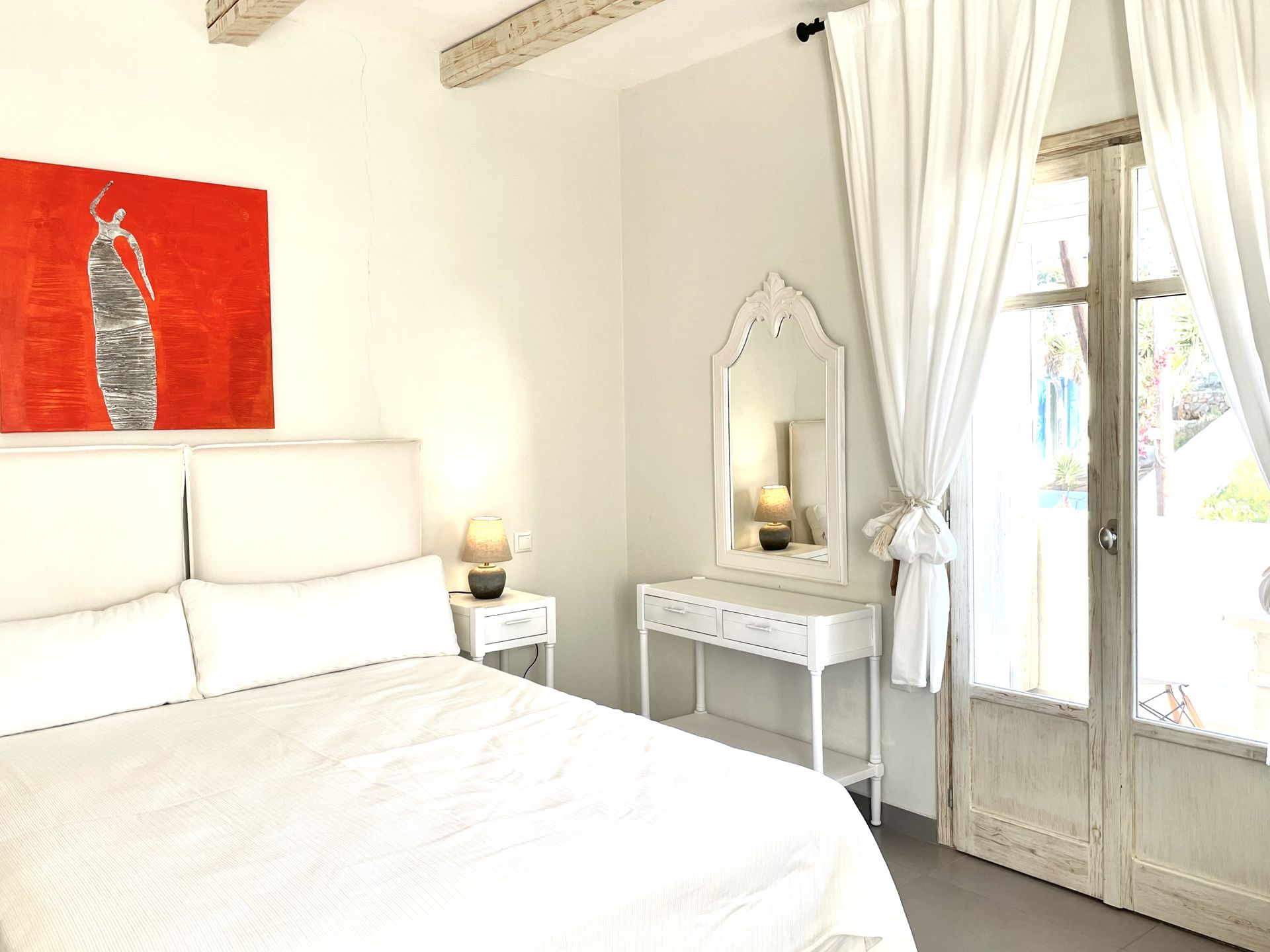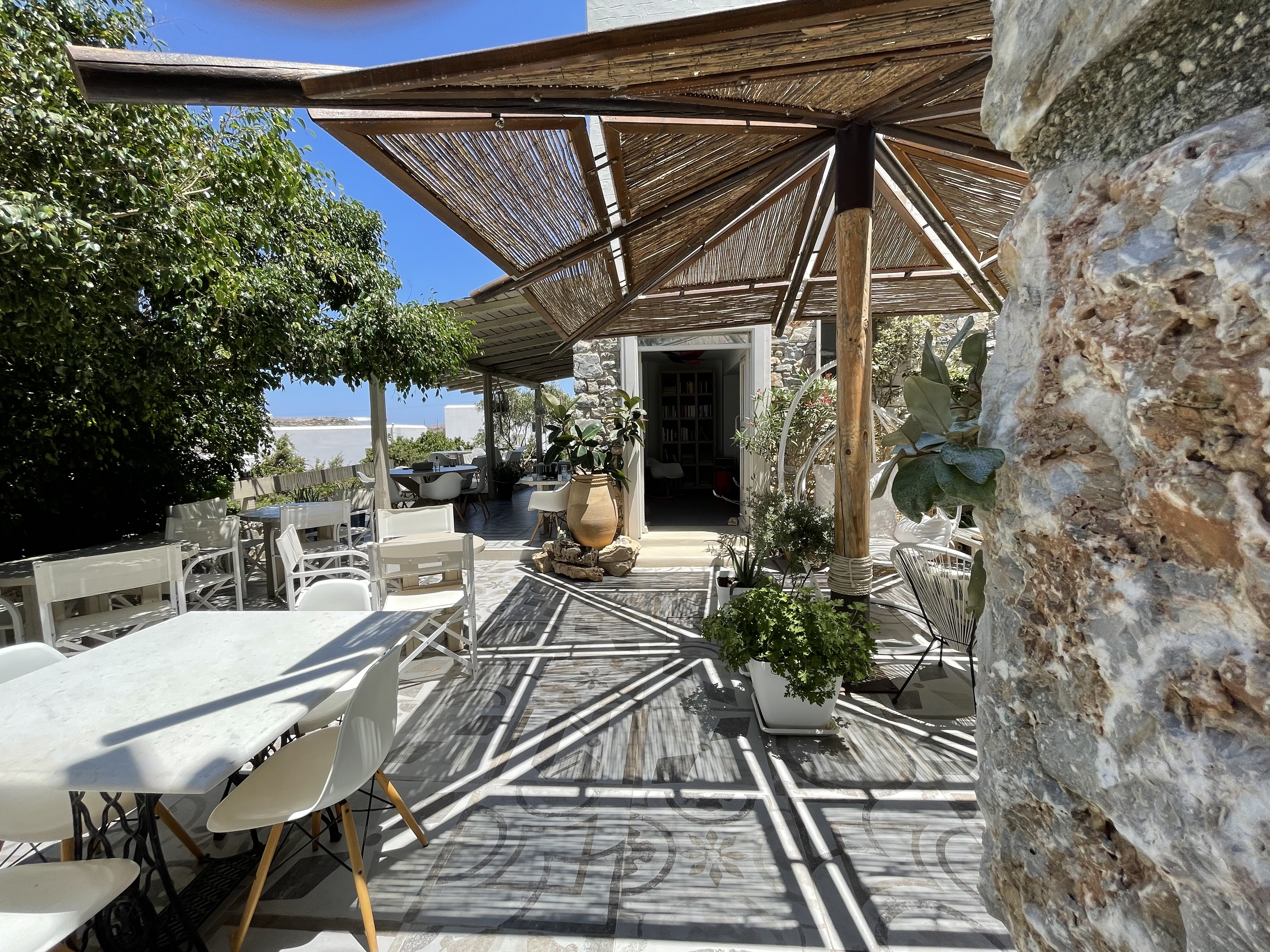 The suites are designed with comfort and elegance in mind, blending traditional Greek aesthetics with modern amenities. Each suite is spacious and well-equipped, featuring private balconies or terraces, air conditioning, and stylish décor. The suites are ideal for couples, families, or small groups who appreciate comfort and privacy. The property’s design is inspired by the natural surroundings, with neutral tones and materials that reflect the island's rustic beauty. The atmosphere is tranquil and inviting, providing an intimate space for guests to unwind and relax.