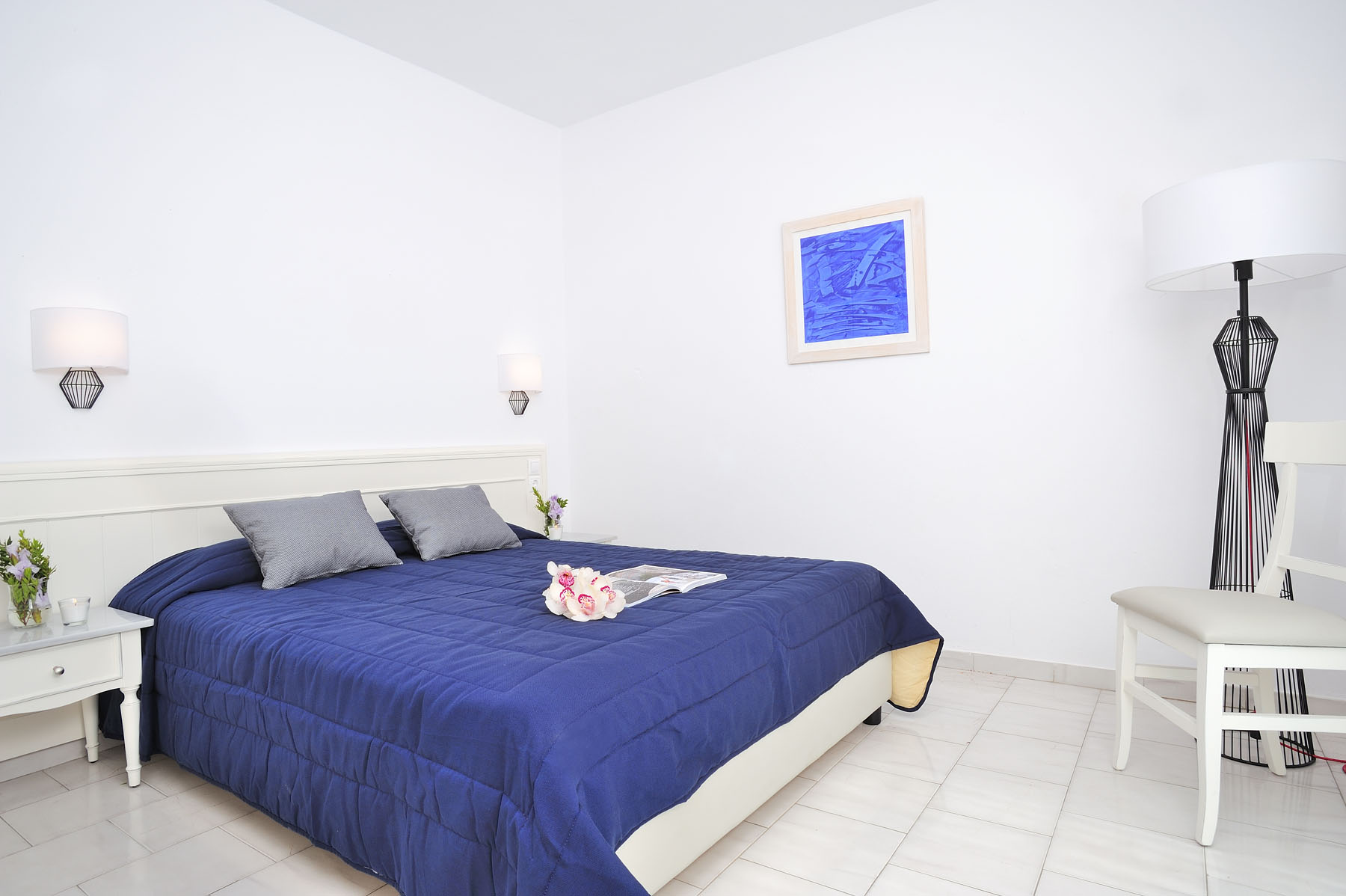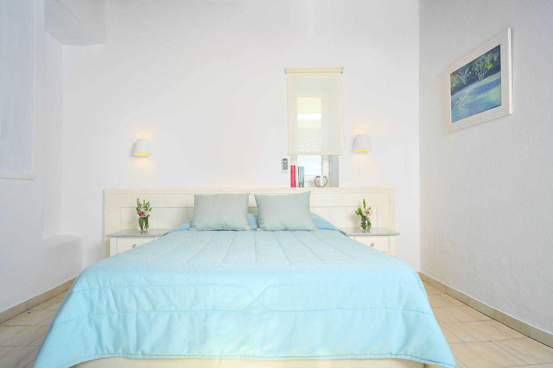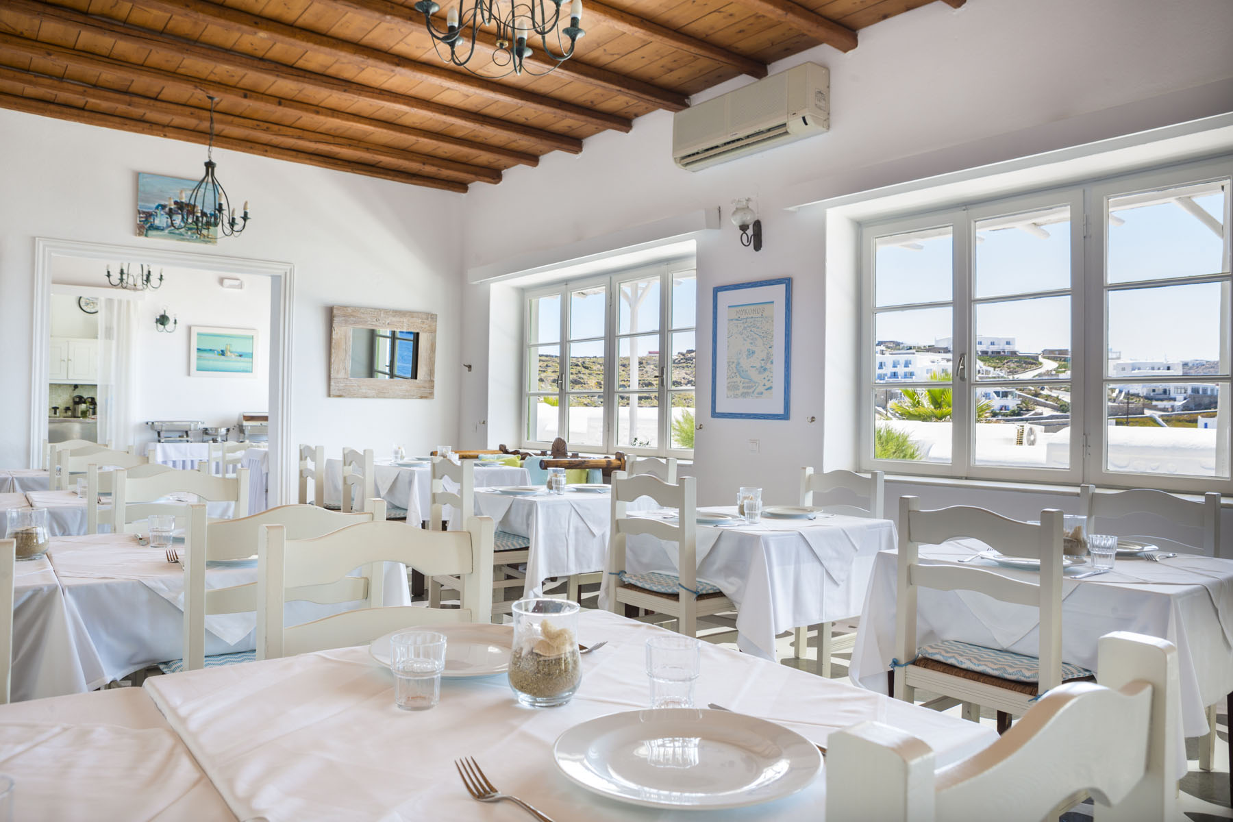 Rooms all have views out over the beach and the sea with some offering views towards the famous windmills of Mykonos and others out towards the neighbouring island of Tinos. Traditionally Cycladic in architecture each room also has air conditioning and a fridge.