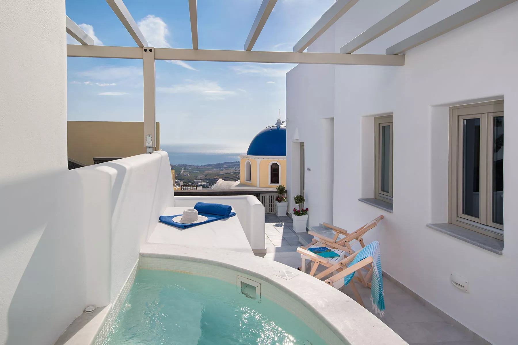 The Altemar Suites is a spacious complex of suites conveniently located just a few steps from Fira as well as the lovely village of Firostefani, both featuring amazing sea views. Each Altemar suite features a private veranda with jacuzzi and views to the sea, the village, the east side of Santorini and the blue domes of the nearby church, enabling guests to relax in premises decorated with summer style and exquisite taste.
