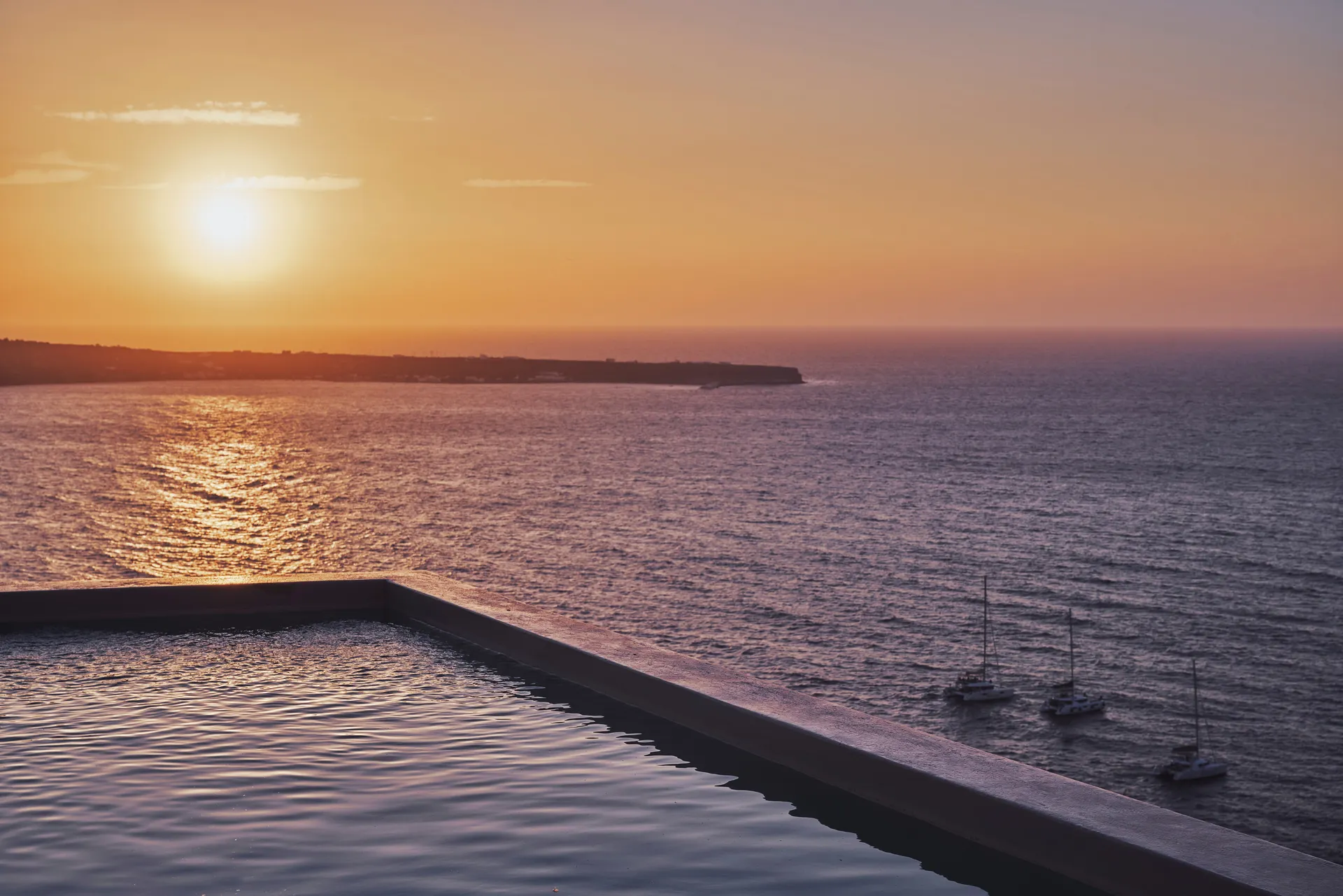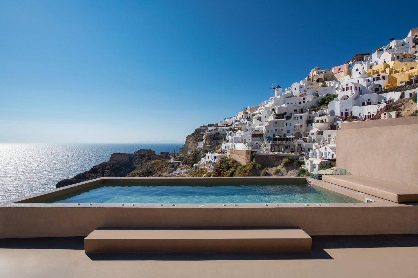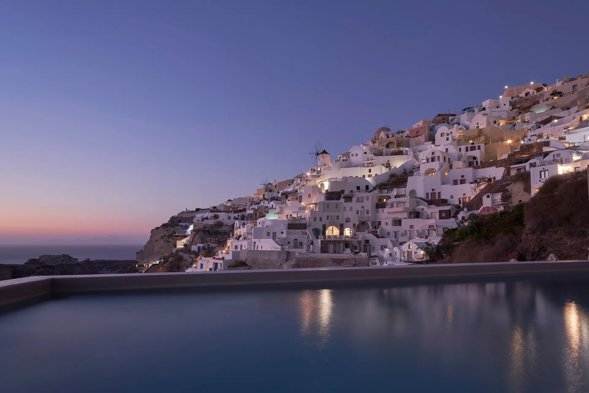 As the sun sets, the best view is from the main swimming pool where the orange of the setting sun tints the blue and white of the buildings with amazing hues that make the island famous.