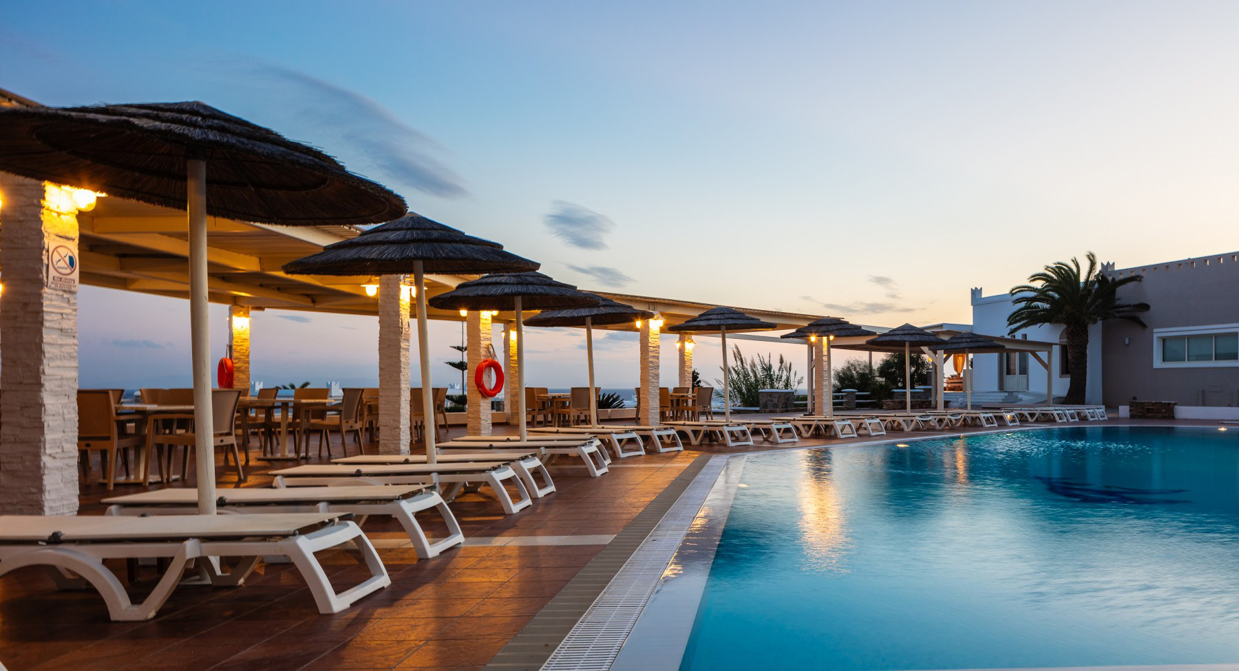 Kavuras Village Hotel is a charming resort nestled within beautifully landscaped gardens, offering a serene and picturesque getaway just a 10-minute walk from the stunning sandy beach of Agios Prokopios. Designed to resemble a traditional Greek village, the hotel features two inviting swimming pools surrounded by sunbeds and umbrellas, with one pool offering a jacuzzi section and the other designed for children.
