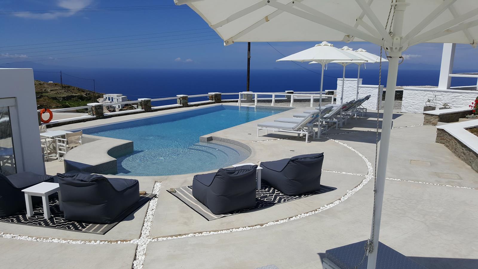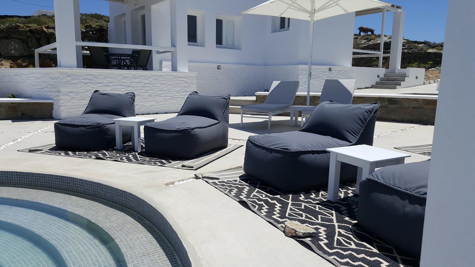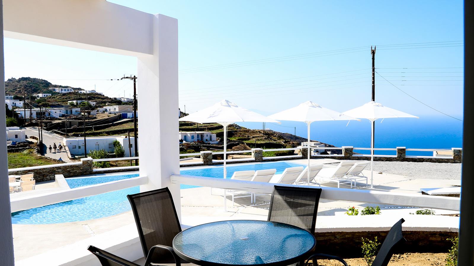 Every villa includes a 32” LED flat-screen TV with cable channels and a 10-inch tablet for browsing, perfect for guests who want to stay connected while enjoying the serenity of their private terrace. At the heart of the property, guests can relax at the shared pool and poolside snack bar, where breakfast and lunch are served daily, making it easy to spend long, lazy days without ever leaving the grounds.