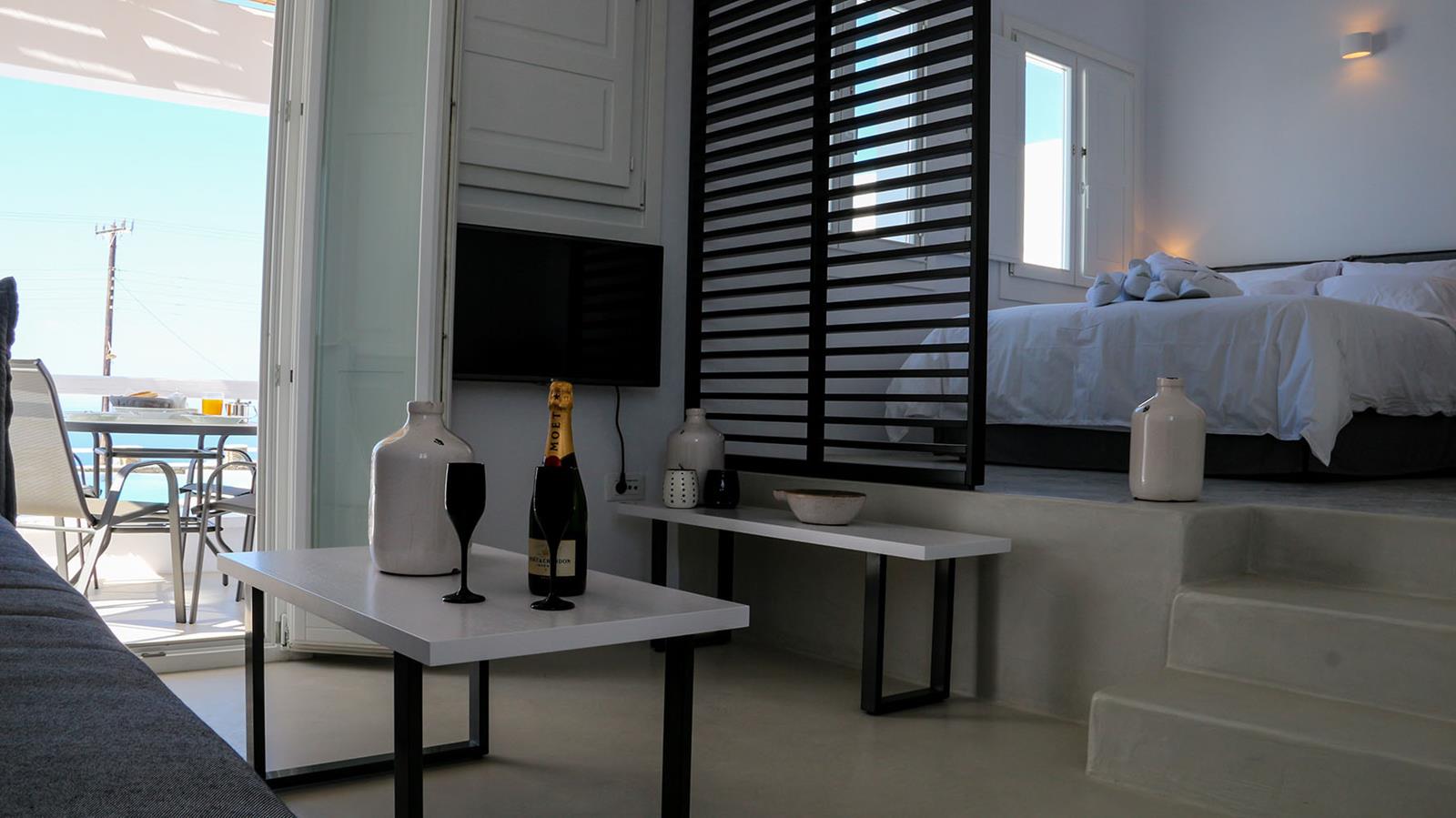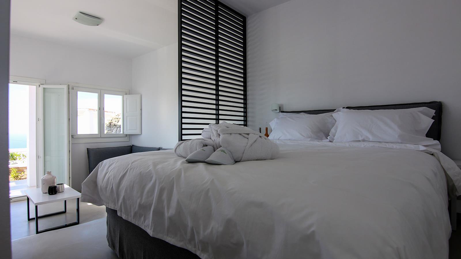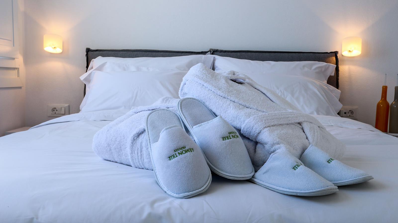 Each of the five villas at Lemon Tree Houses accommodates between two and five guests, making them a perfect choice for couples, families, or small groups of friends. While the villas share a consistent external style, every house has been individually designed and decorated, offering a unique atmosphere and distinctive interior touches that reflect the character of the space. All are spacious and stylishly minimalist, featuring queen or king-size beds, comfortable living areas with sofa beds, kitchenettes with mini-bar fridges, and modern bathrooms with high-quality amenities.