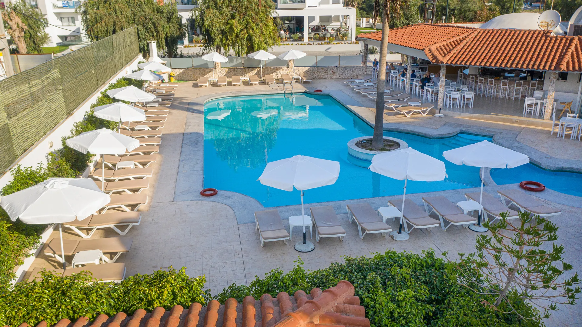 The hotel is designed to reflect the essence of Greek island living while offering modern comfort and style. It features a spacious swimming pool surrounded by organised patios, sunbeds, and umbrellas, creating a relaxing space for guests. A poolside snack bar and restaurant serve fresh juices, iced cocktails, and light meals throughout the day, contributing to a casual and laid-back holiday experience.